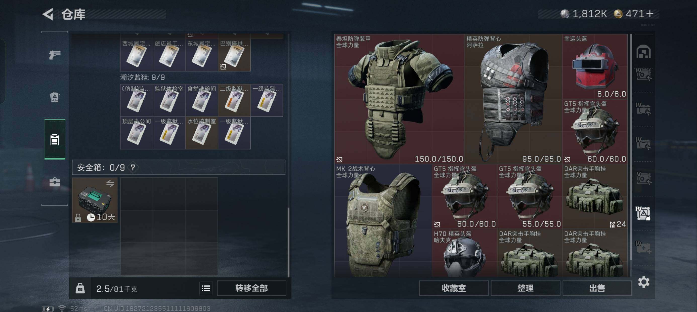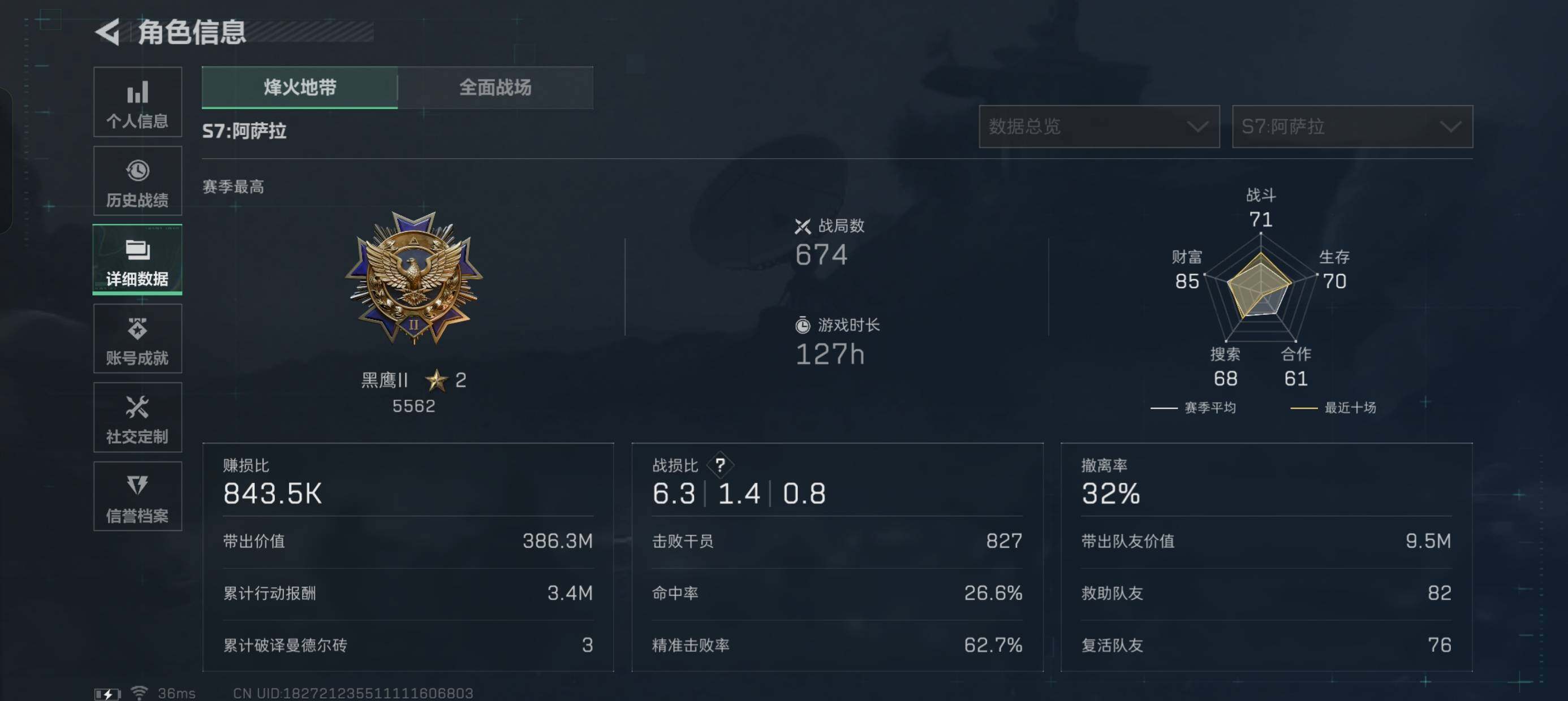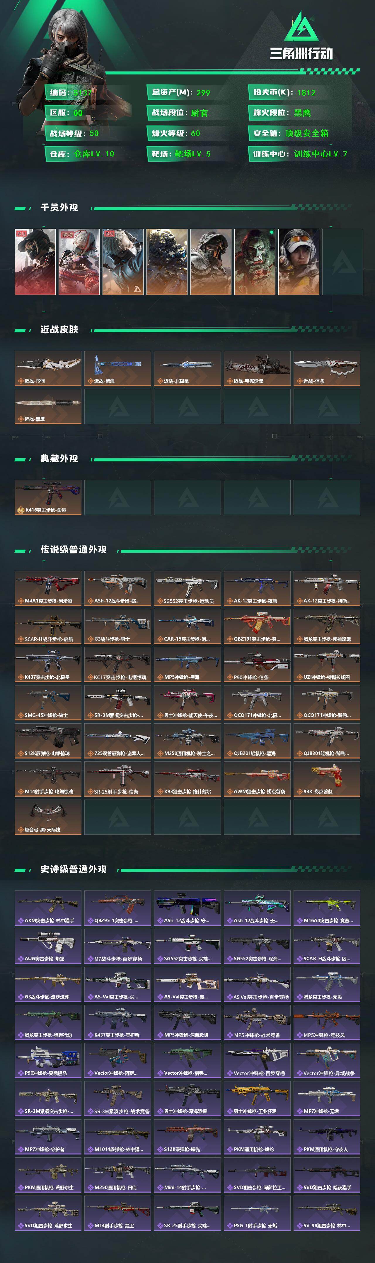 【S137】总资产(M):299M/哈夫币(K):1812K/哈夫币(K):1812K/传说枪皮数:32/全面战场等级:50_段位:尉官/烽火地带等级:60_段位:黑鹰/露娜-黑·天际线/骇爪-维什戴尔/蜂医-送葬人·无题密令/无名-夜鹰/深蓝-不破誓约/红狼-电锯惊魂/露娜-金牌射手/近战-怜悯/近战-黑海/近战-北极星/近战-电锯惊魂/近战-信条/近战-黑鹰/K416突击步枪-命运/M4A1