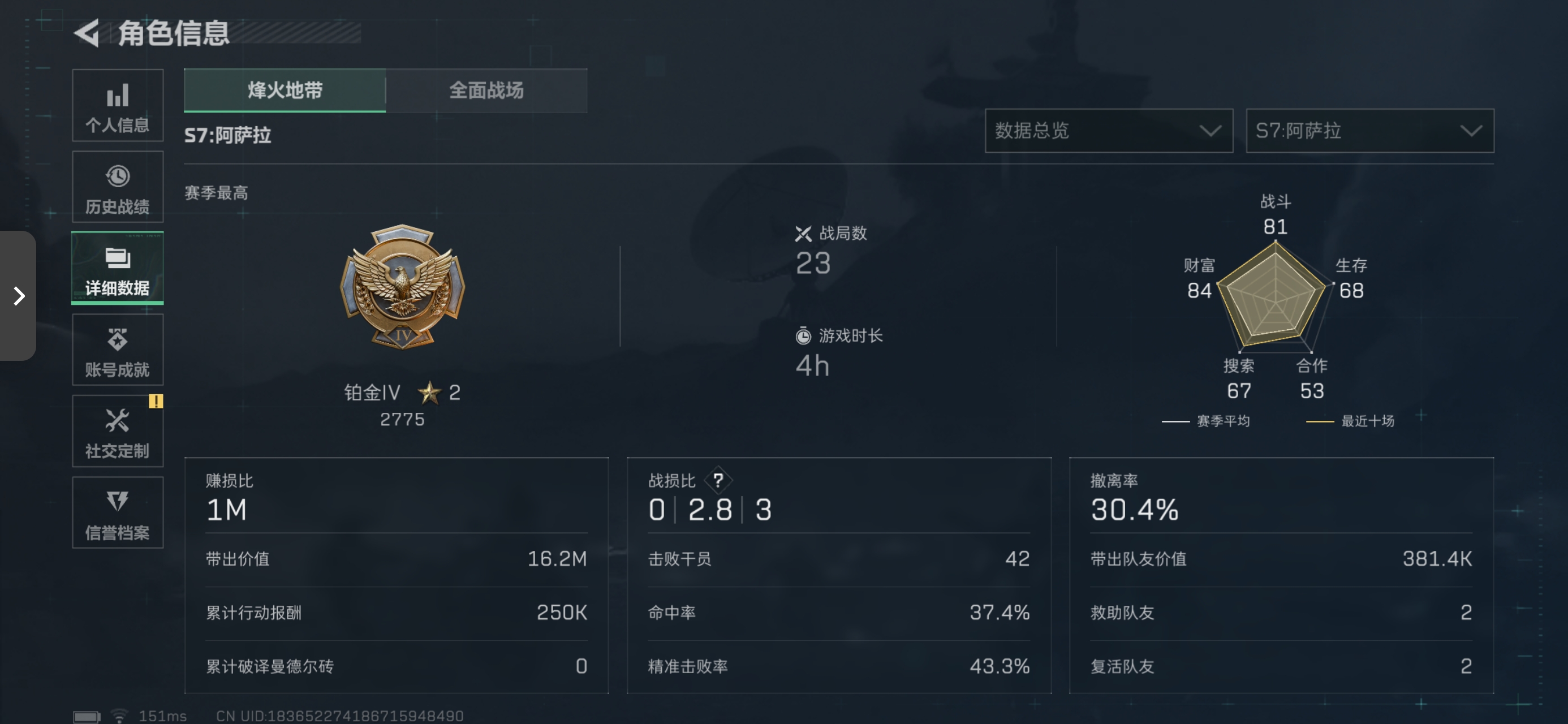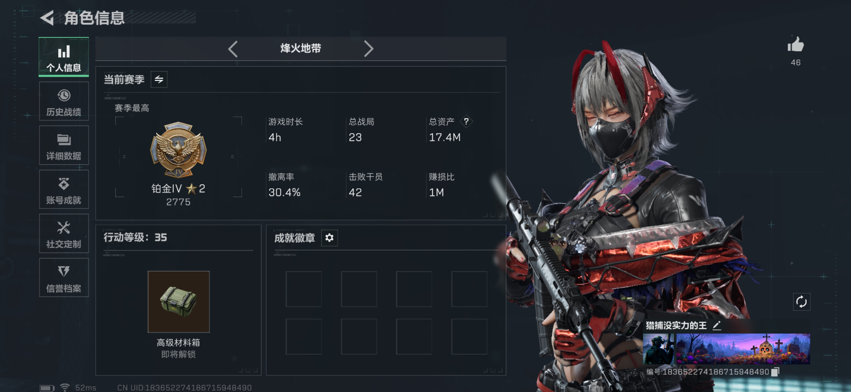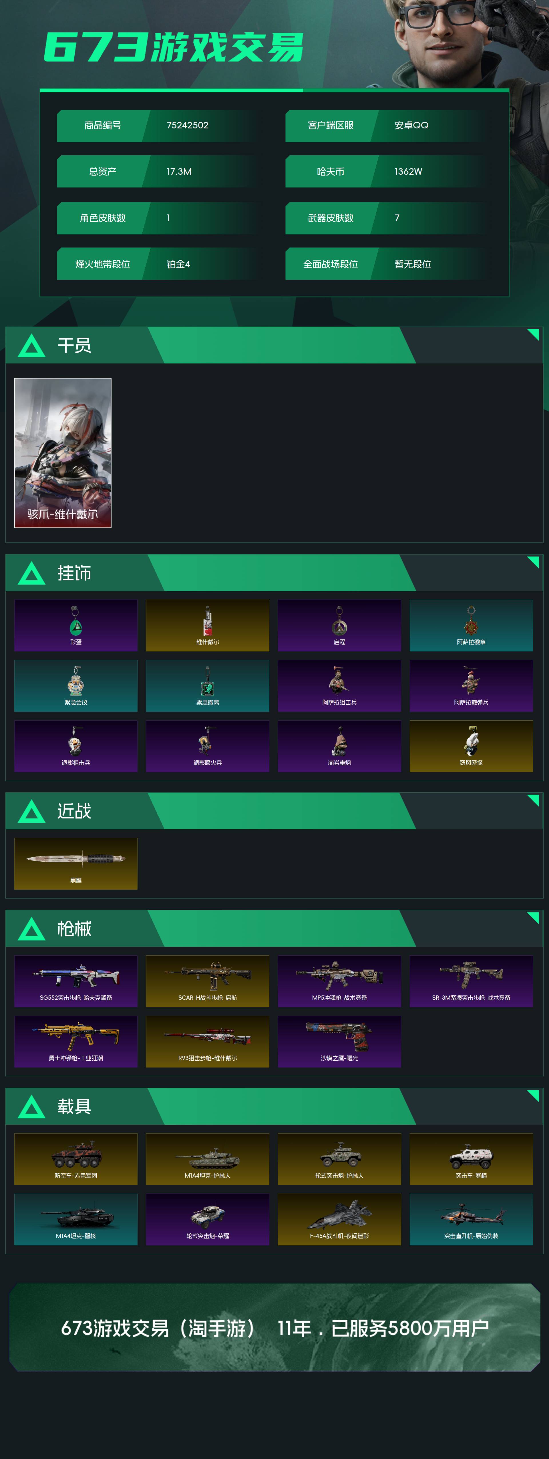 烽火段位铂金4 战场段位暂无段位 总资产17.3M 哈夫币1362W 干员1 挂饰12 近战1 枪械7 载具8