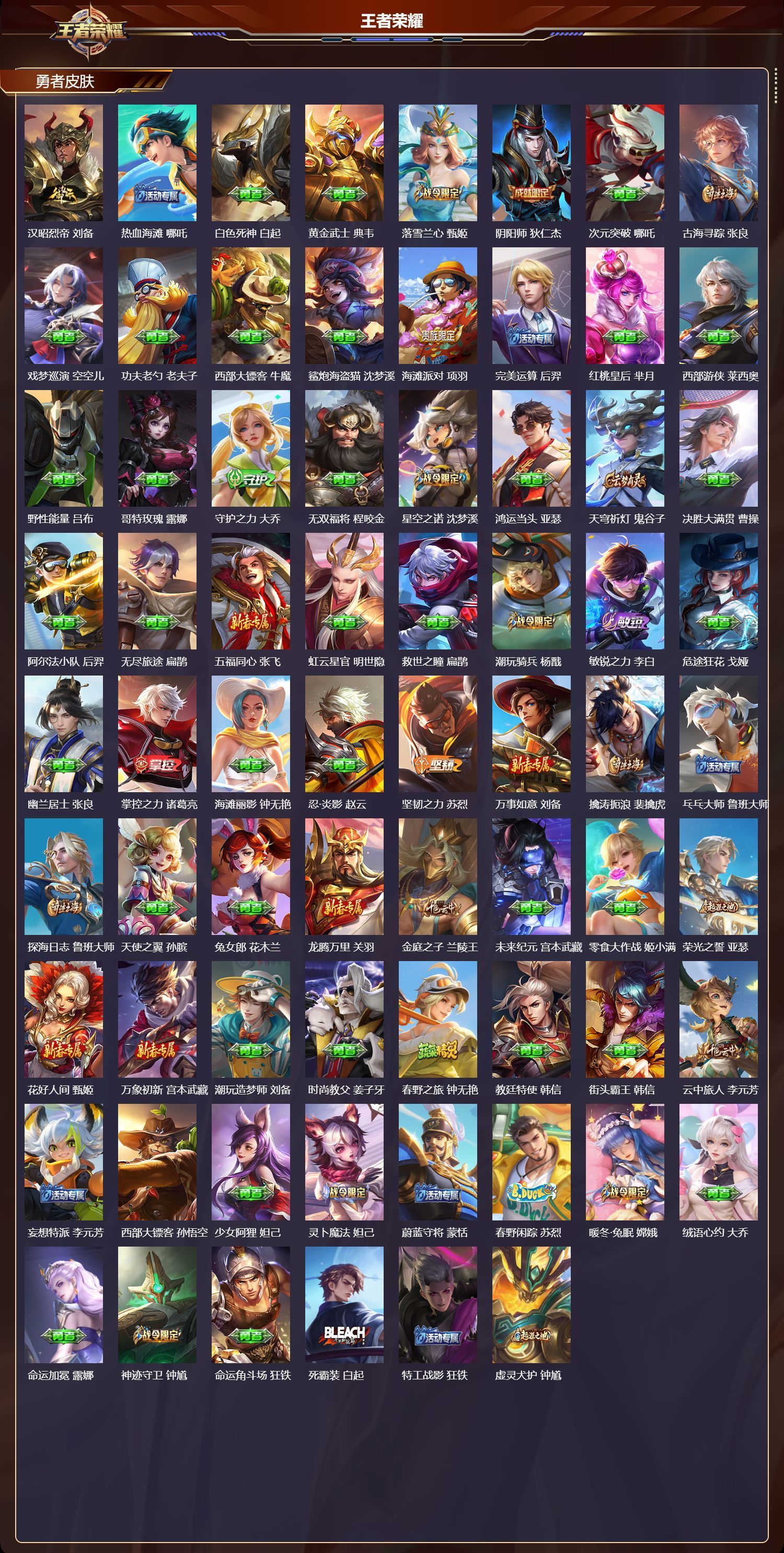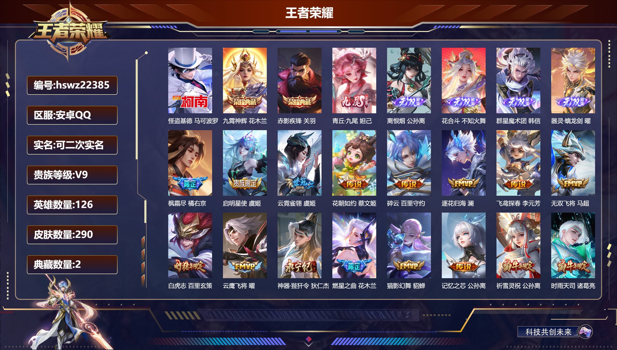安卓QQ/永恒钻石/290皮肤/126英雄/2典藏/0珍品无双/5无双/1珍品传说/41传说/77史
