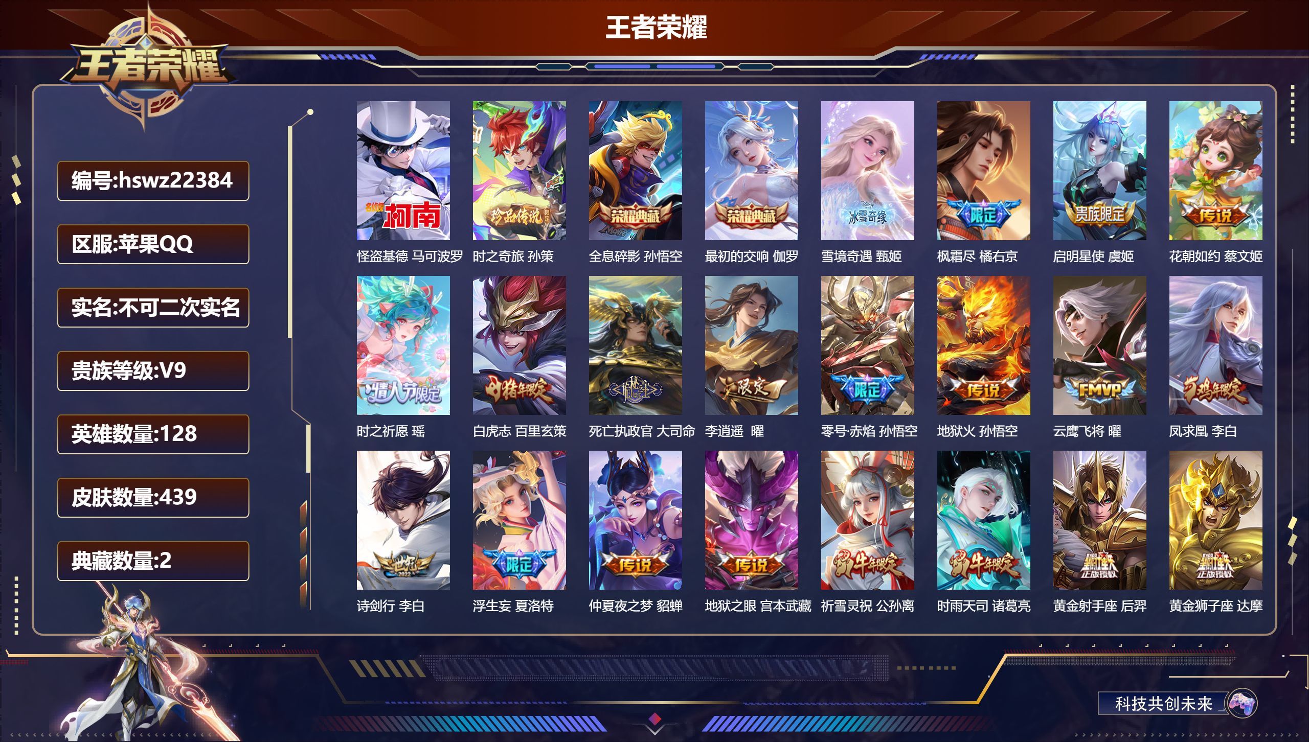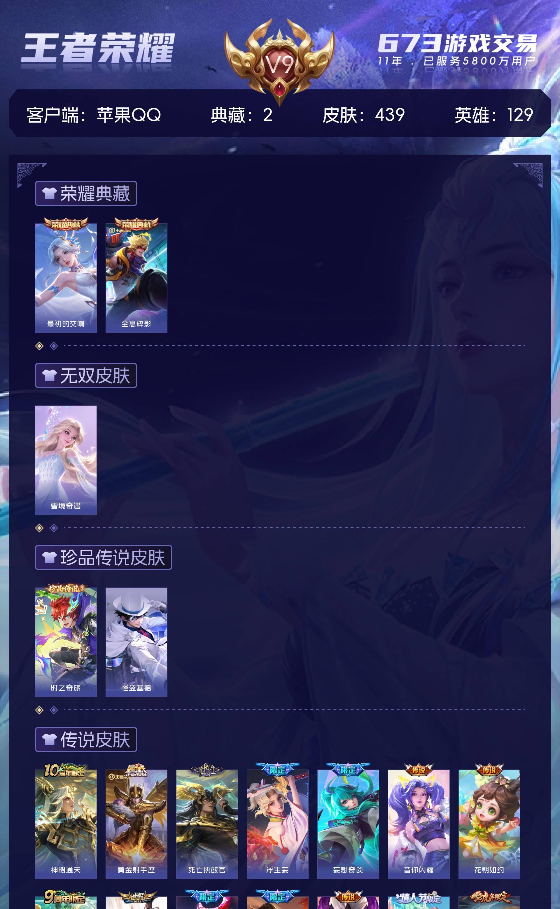 苹果QQ/最强王者/439皮肤/128英雄/2典藏/0珍品无双/1无双/2珍品传说/30传说/136