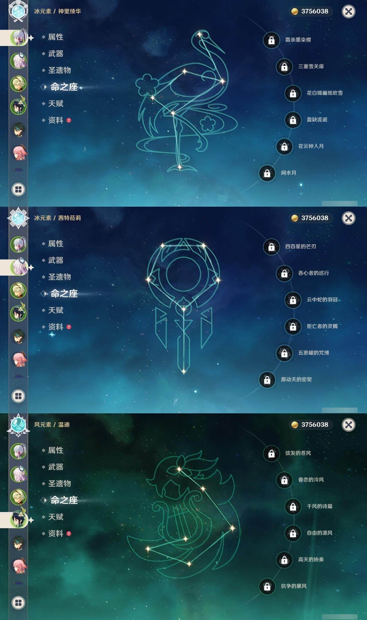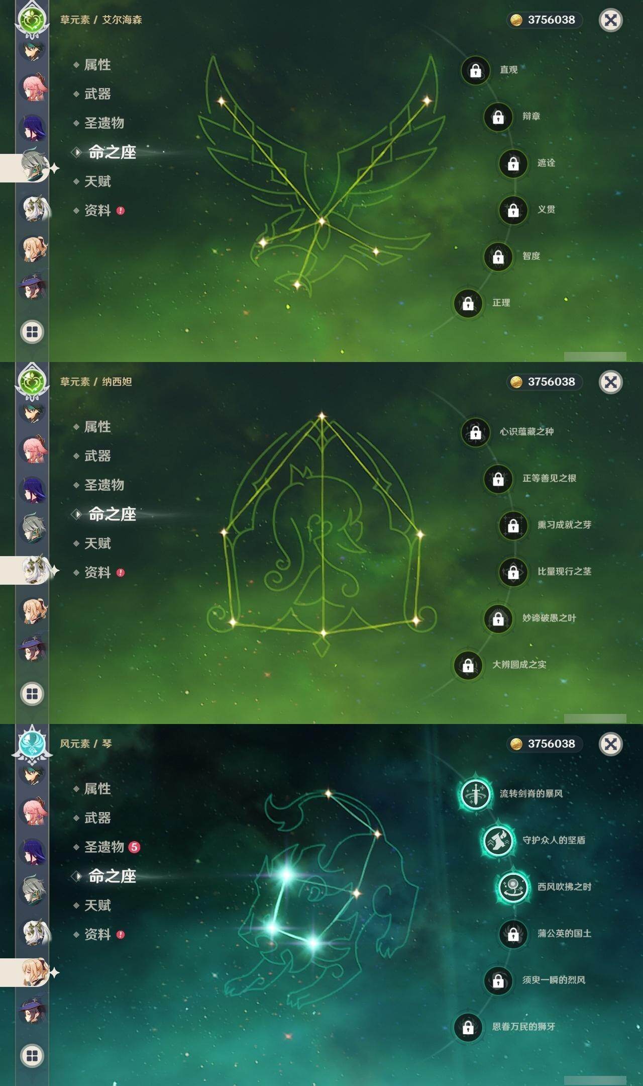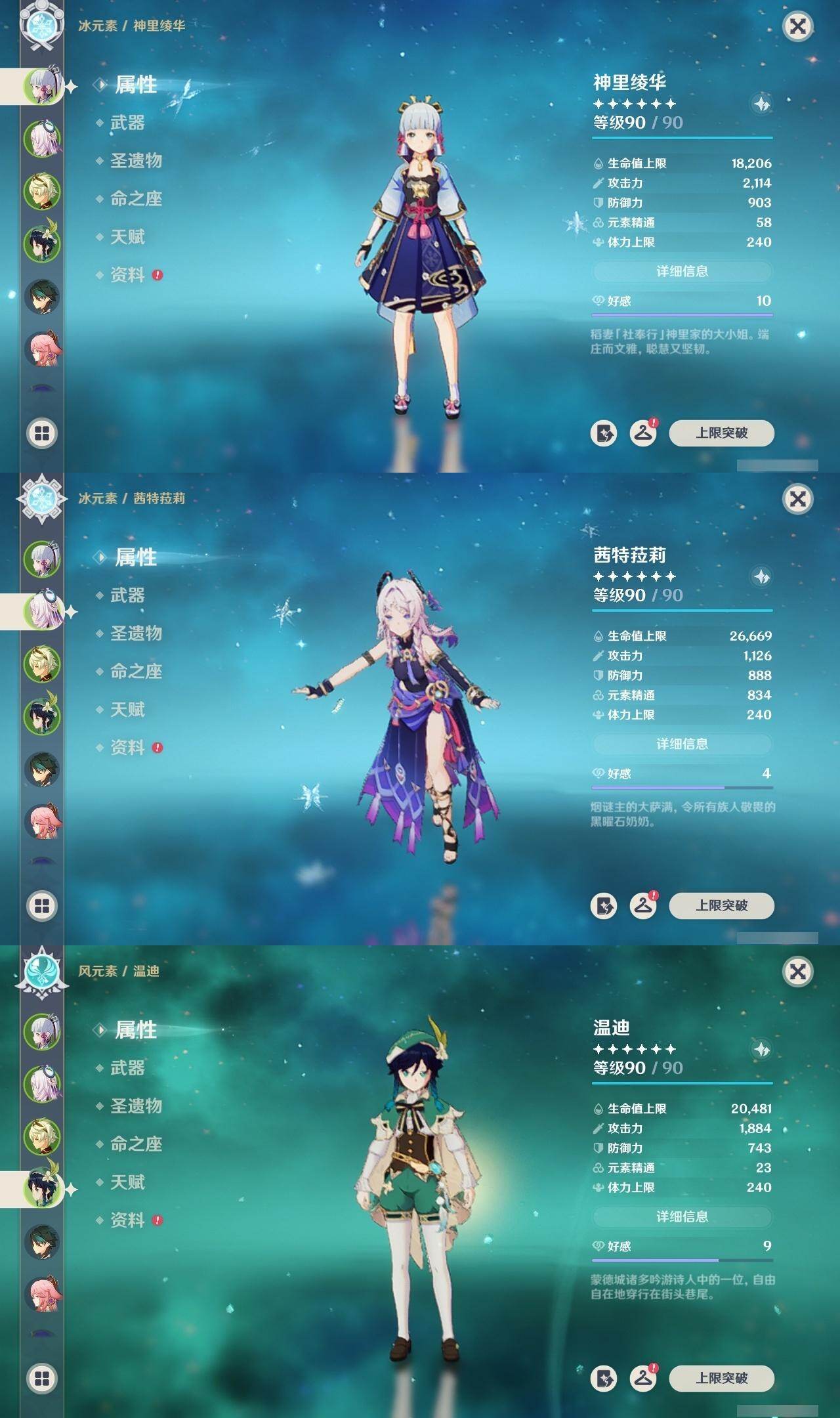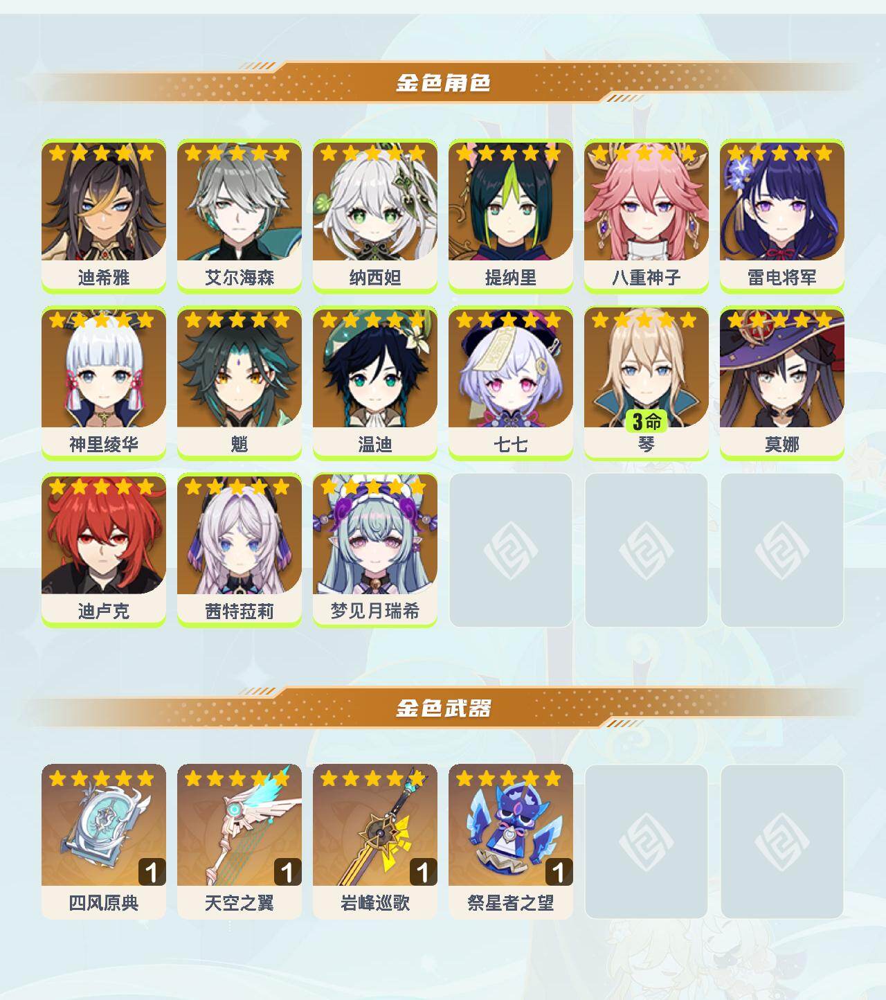 0命迪希雅,0命艾尔海森,0命纳西妲,0命提纳里,0命八重神子,0命雷电将军,0命神里绫华,0命魈,0命温迪,0命七七,3命琴,0命莫娜,0命迪卢克,0命茜特菈莉,0命梦见月瑞希,精1四风原典,精1天空之翼,精1岩峰巡歌,精1祭星者之望