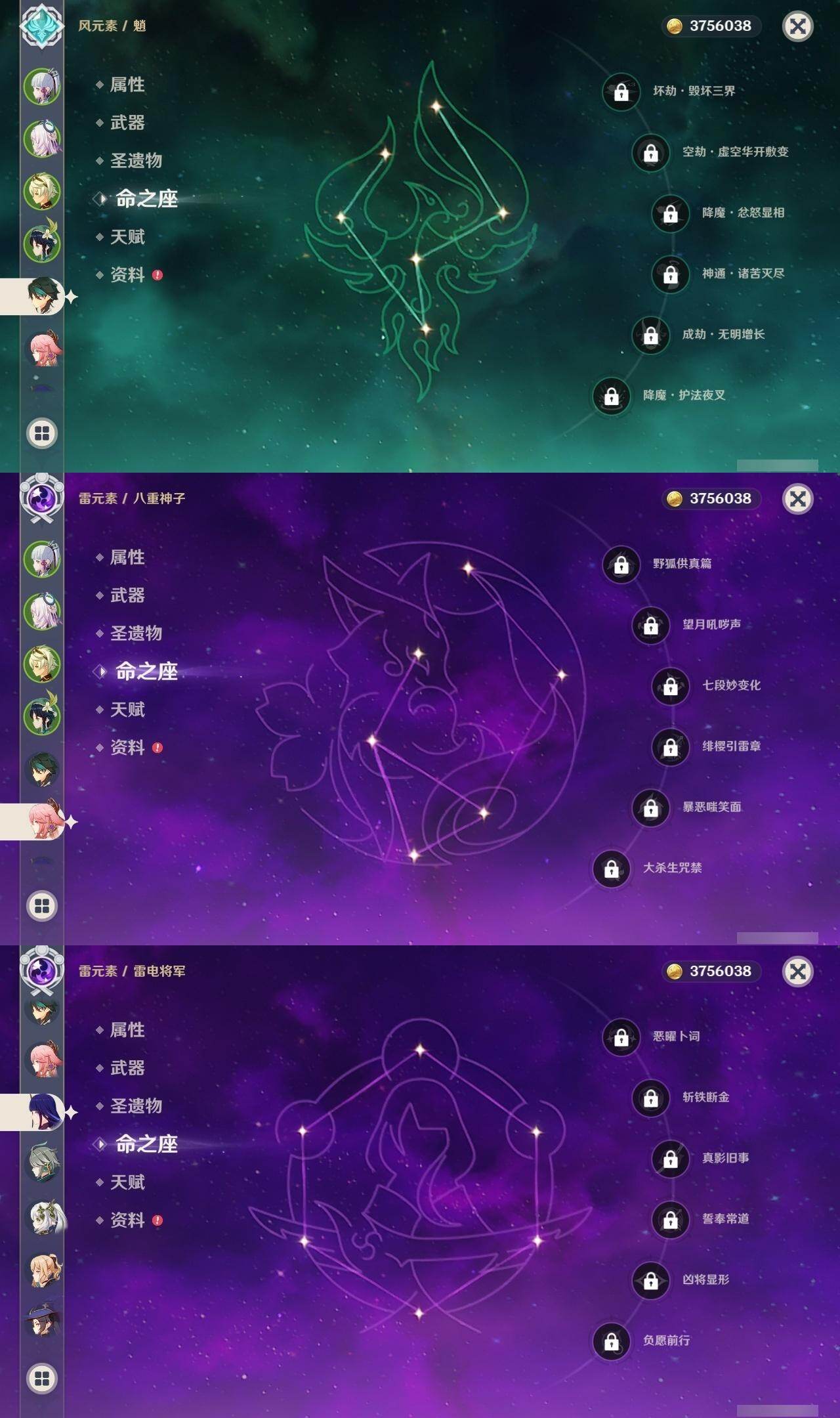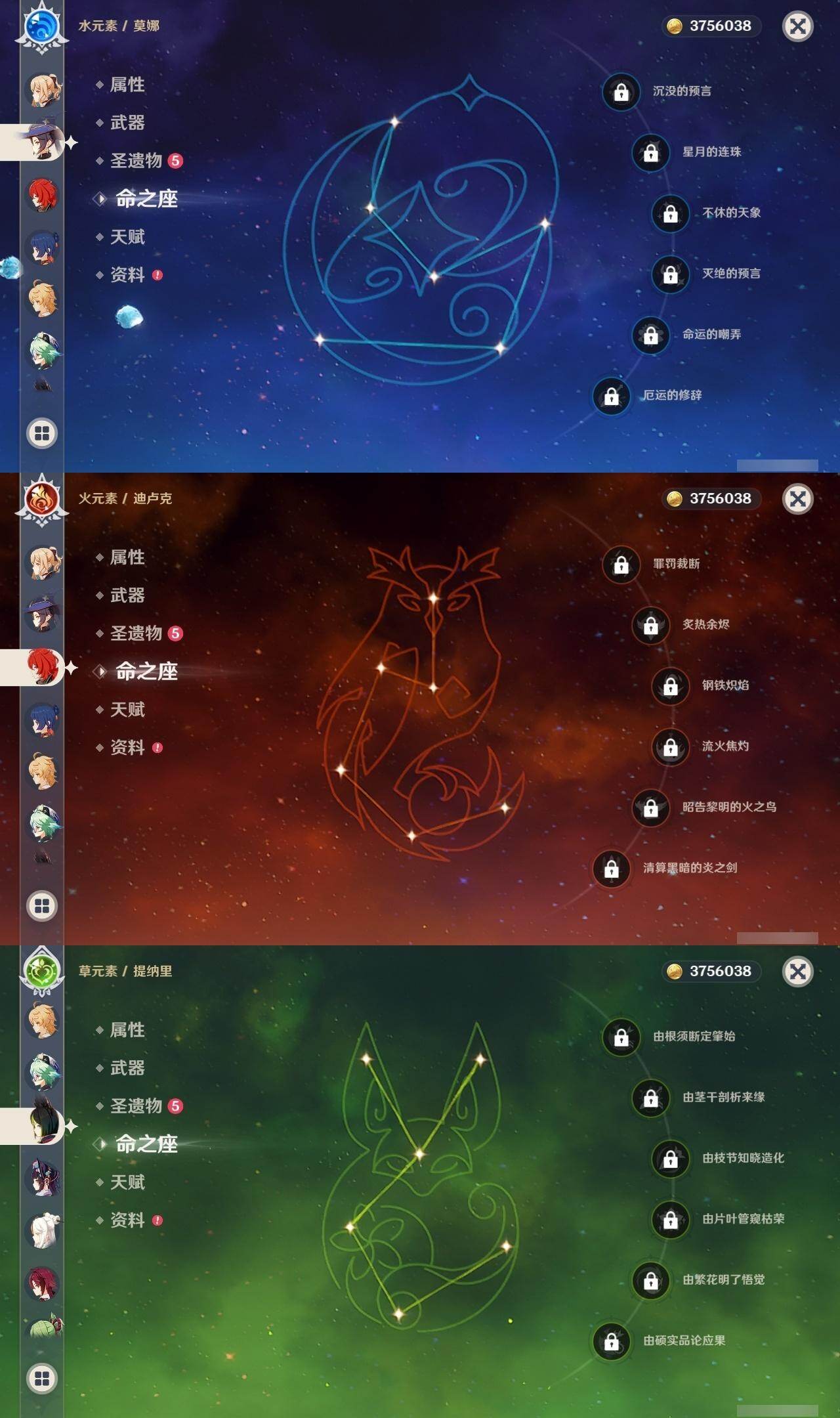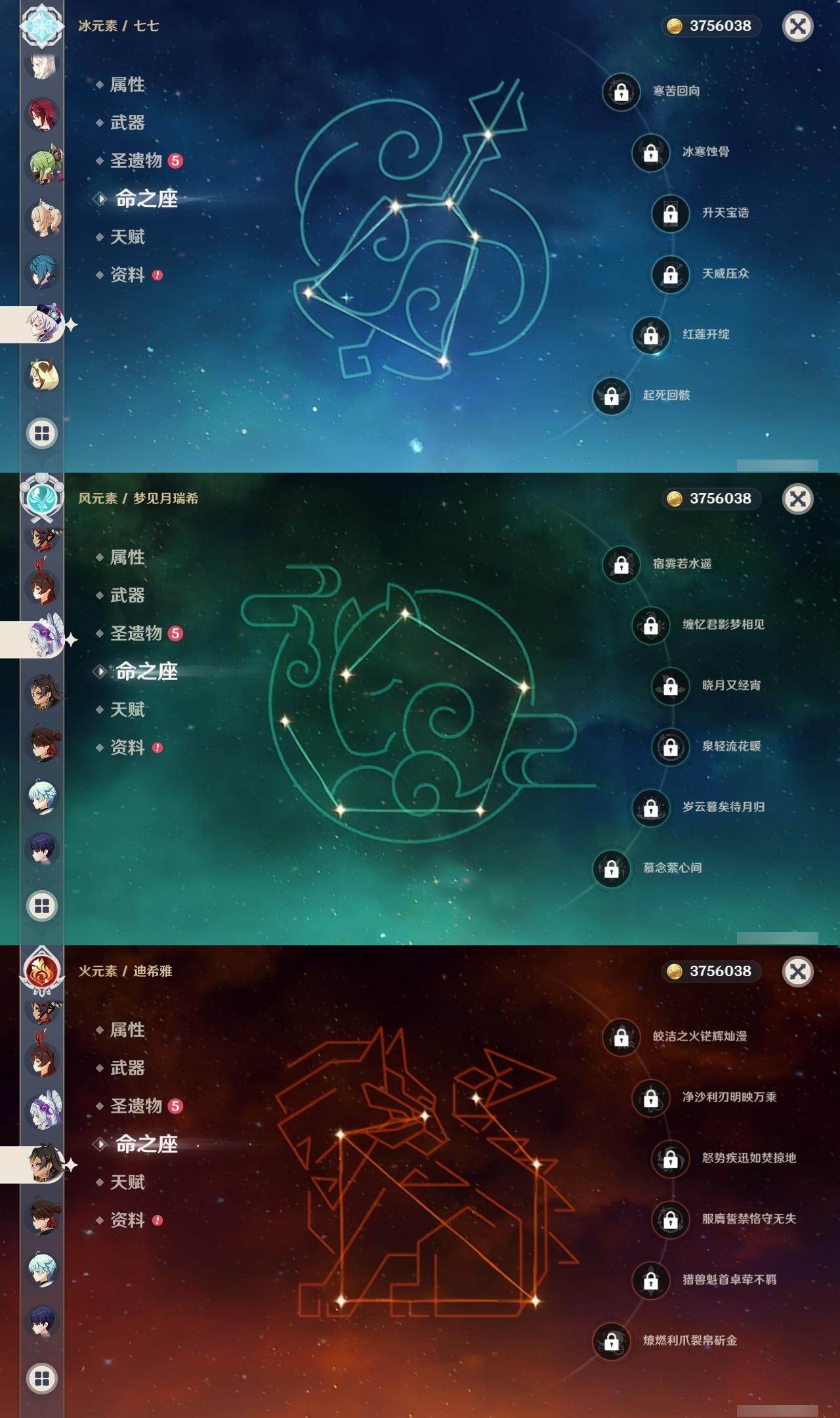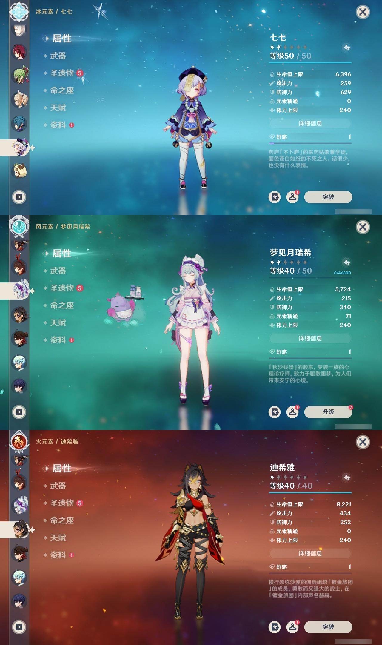 0命迪希雅,0命艾尔海森,0命纳西妲,0命提纳里,0命八重神子,0命雷电将军,0命神里绫华,0命魈,0命温迪,0命七七,3命琴,0命莫娜,0命迪卢克,0命茜特菈莉,0命梦见月瑞希,精1四风原典,精1天空之翼,精1岩峰巡歌,精1祭星者之望