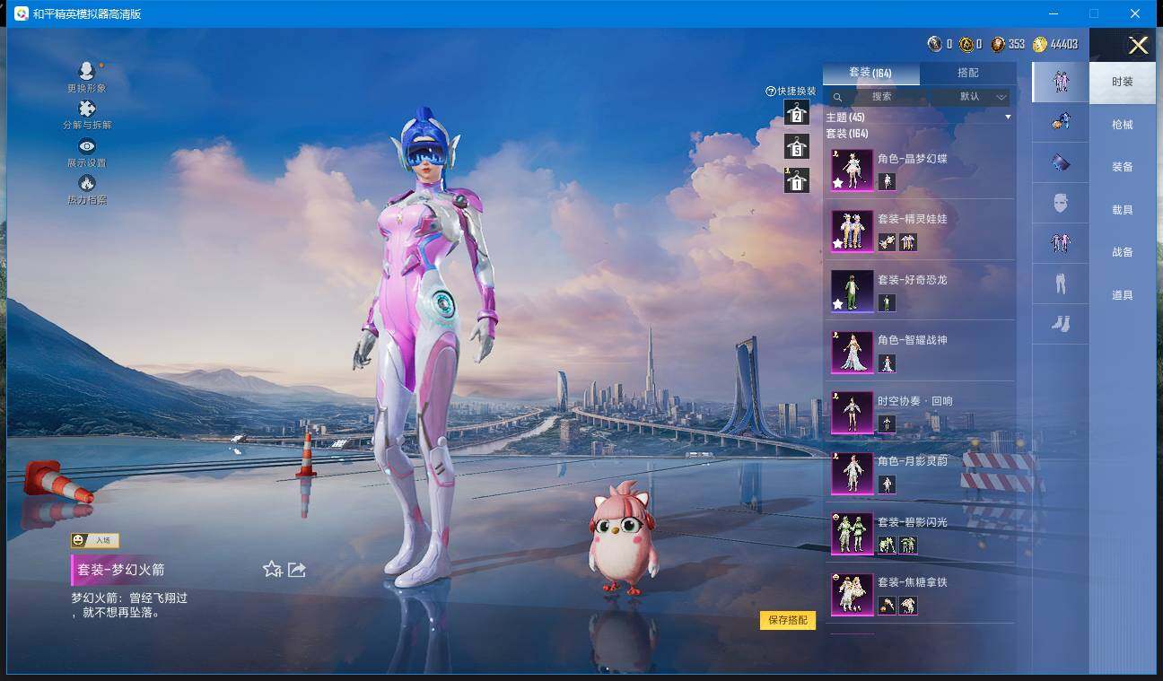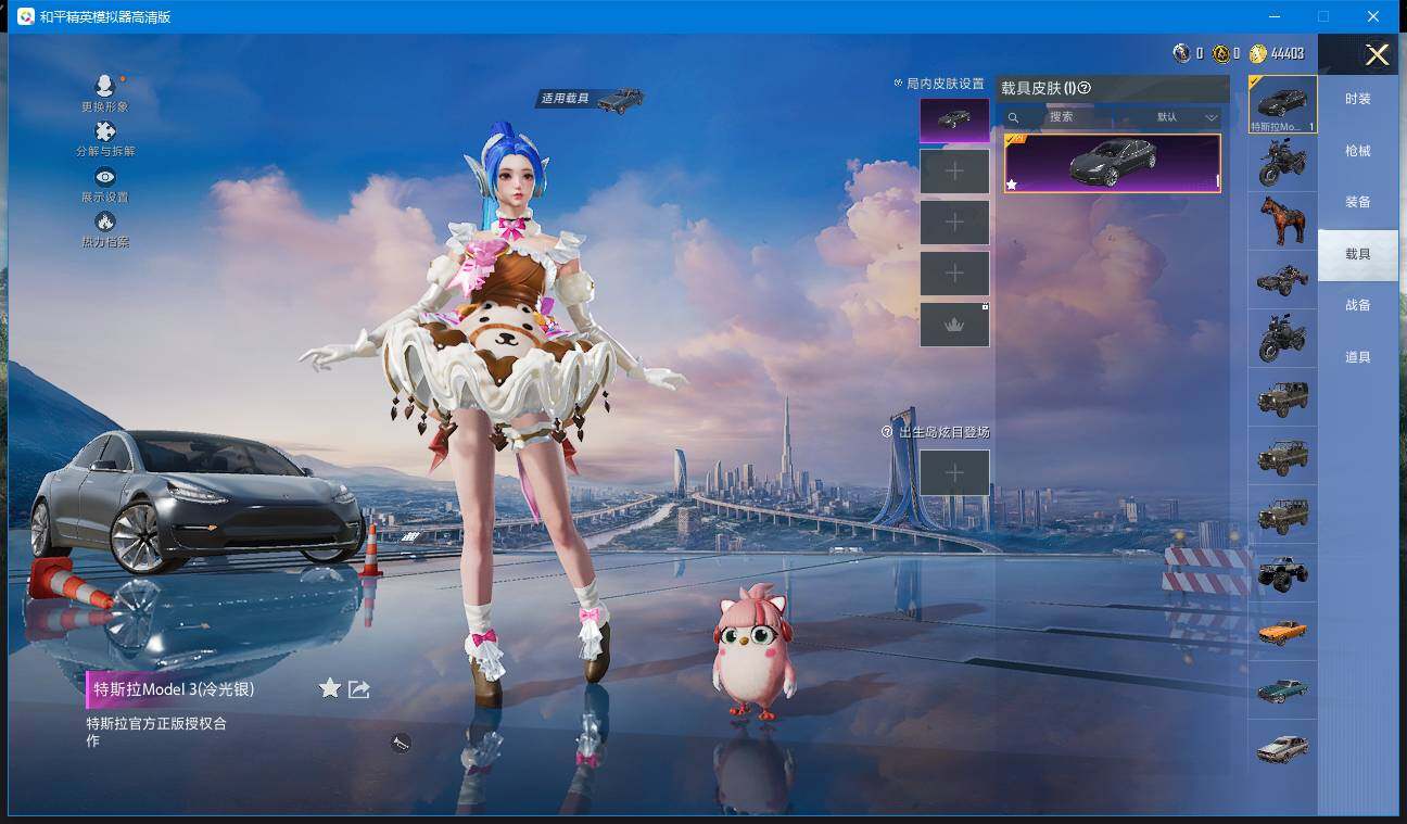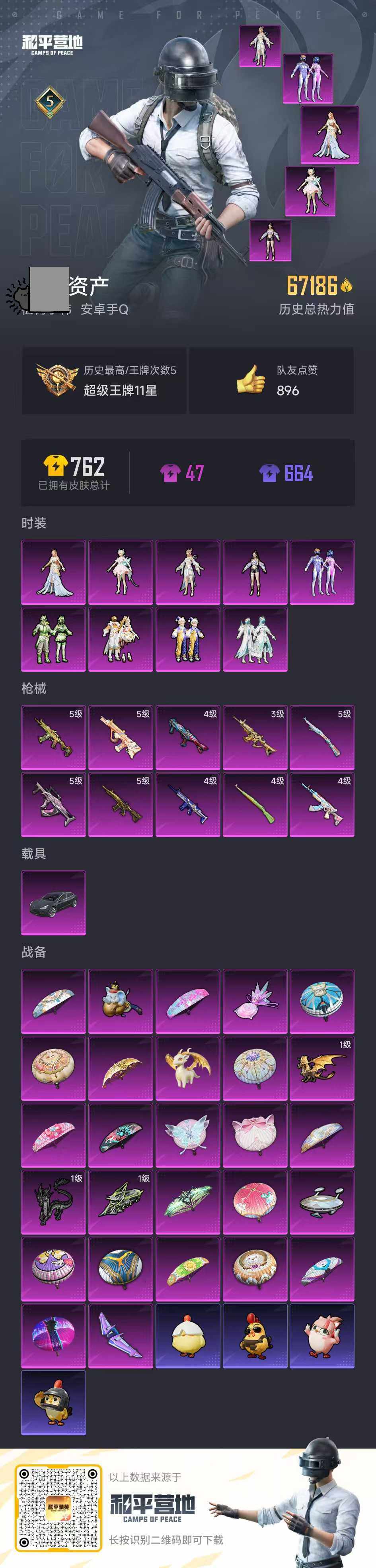 实名: 可修改 时装数: 163 载具数: 1 枪械数: 203 战备数: 143 热门装扮: 梦幻火箭(新101),好奇恐龙,精灵娃娃,天之羽翼,焦糖拿铁,碧影闪光,软萌银虎,神秘黑猫,月影灵韵,晶梦幻蝶,智耀战神 载具: 特斯拉Model 3(冷光银),僚机-圣域龙宝 稀有枪皮: SCAR-L-青春物语(四级),SCAR-L-金蛇镇世(三级),M416-五爪金龙(五级),GROZA-镜光银凌