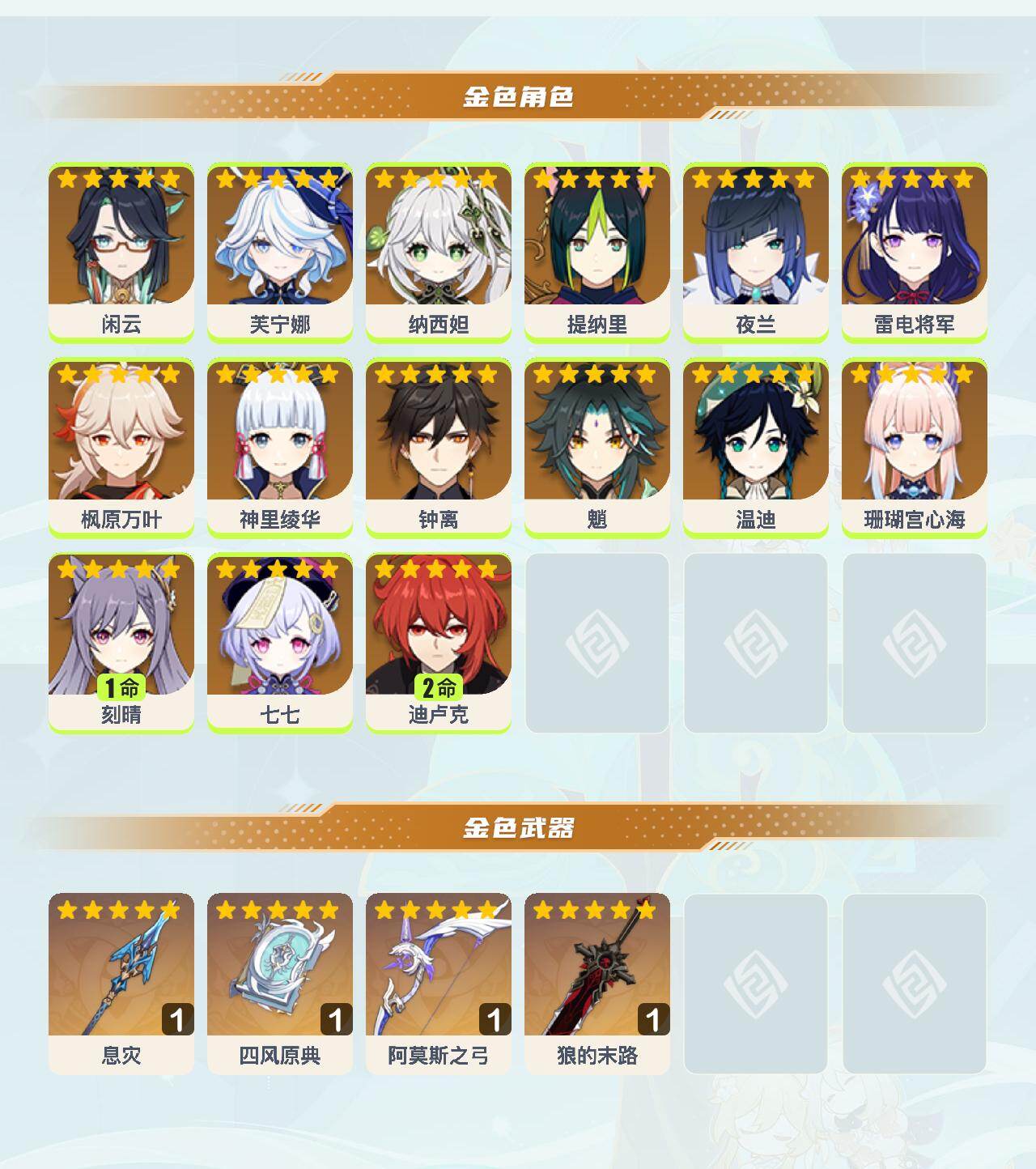 【YSN2240】57级/22黄/女主/15个五星角色/4个五星武器/芙宁娜/枫原万叶/2命迪卢克/钟离/神里绫华/魈/温迪/雷电将军/纳西妲/夜兰/珊瑚宫心海/闲云/1命刻晴/提纳里/七七/狼的末路/息灾/阿莫斯之弓/四风原典