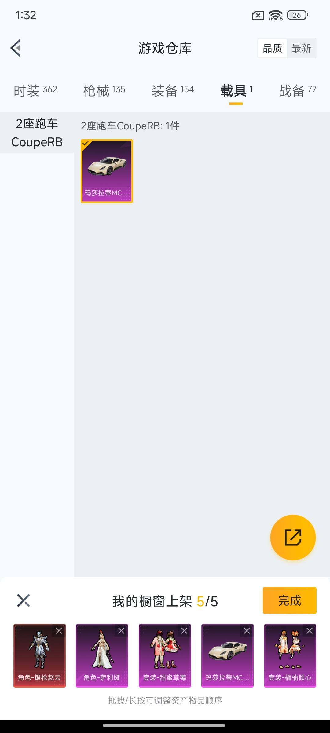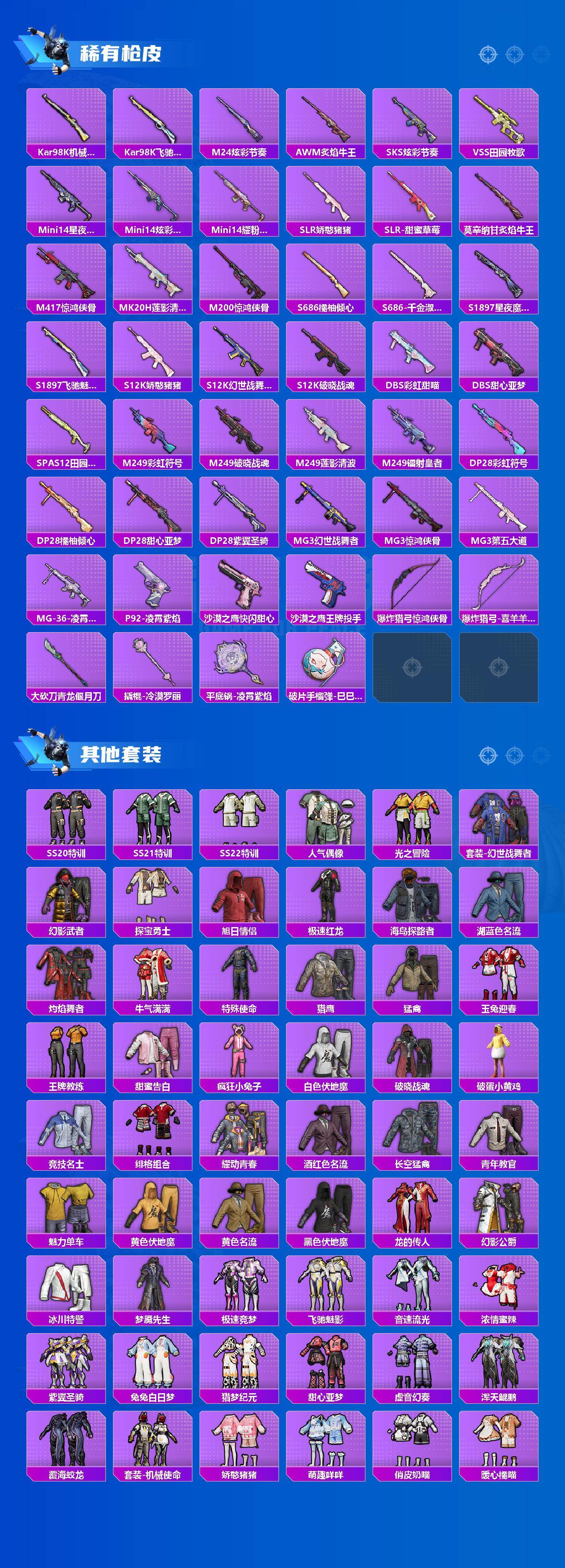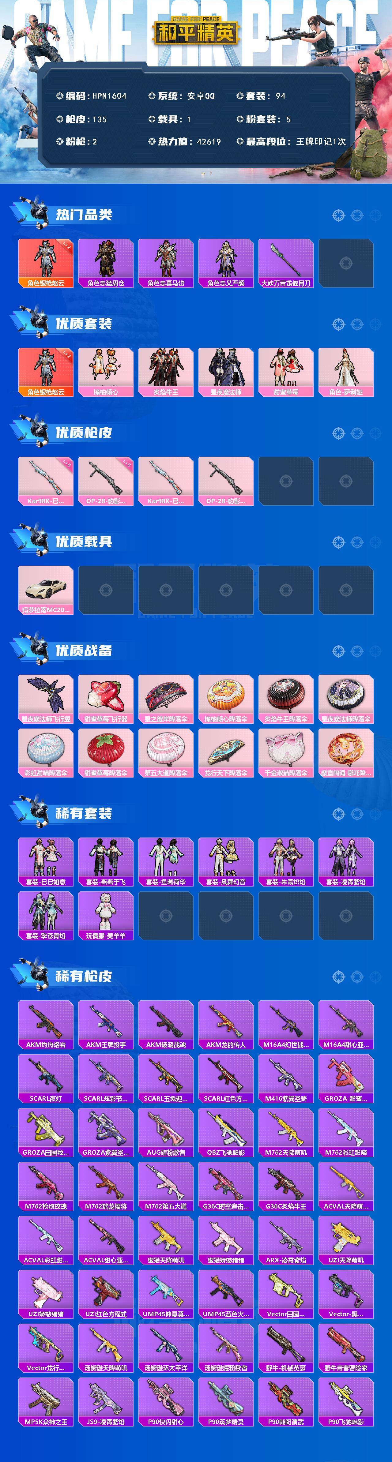 【HPN1604】94套装/枪械2/装备154/载具1/战备77/王牌印记1/热力值42619/五级Kar98K-巳巳如意/五级DP-28-豹影疾电/二级角色-银枪赵云/角色-银枪赵云/角色-忠猛周仓/角色-忠真马岱/角色-忠义严颜/大砍刀-青龙偃月/橘柚倾心/炙焰牛王/星夜魔法师/甜蜜草莓/角色-萨利娅/玛莎拉蒂MC20(星石白)/Kar98K-巳巳如意/DP-28-豹影疾电/星夜魔法师飞行翼/甜蜜草莓飞行器/星之彼岸降落伞/橘柚倾心降落伞/炙焰牛王降落伞/星夜魔法师降落伞/彩虹甜喵降落伞/甜