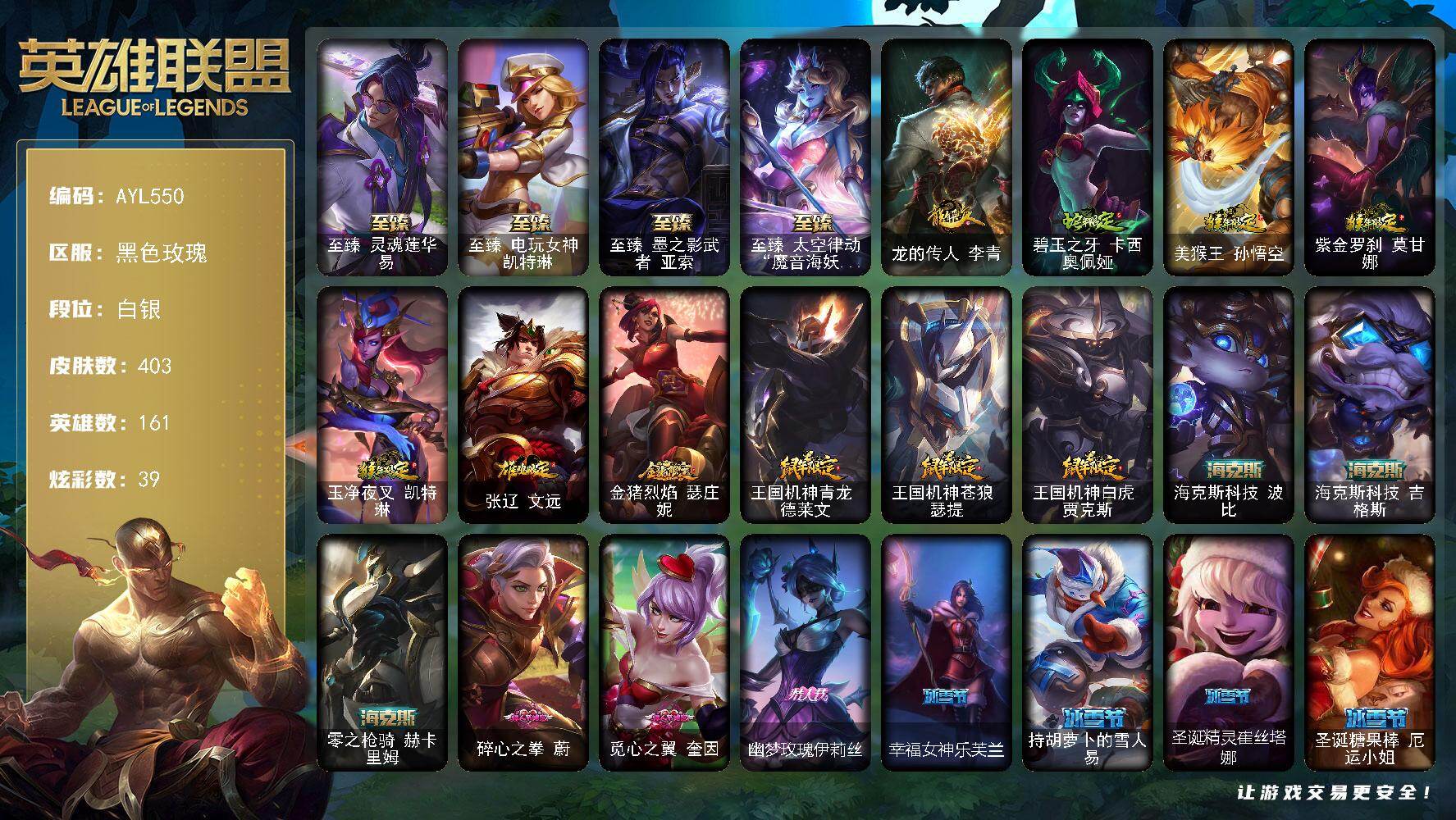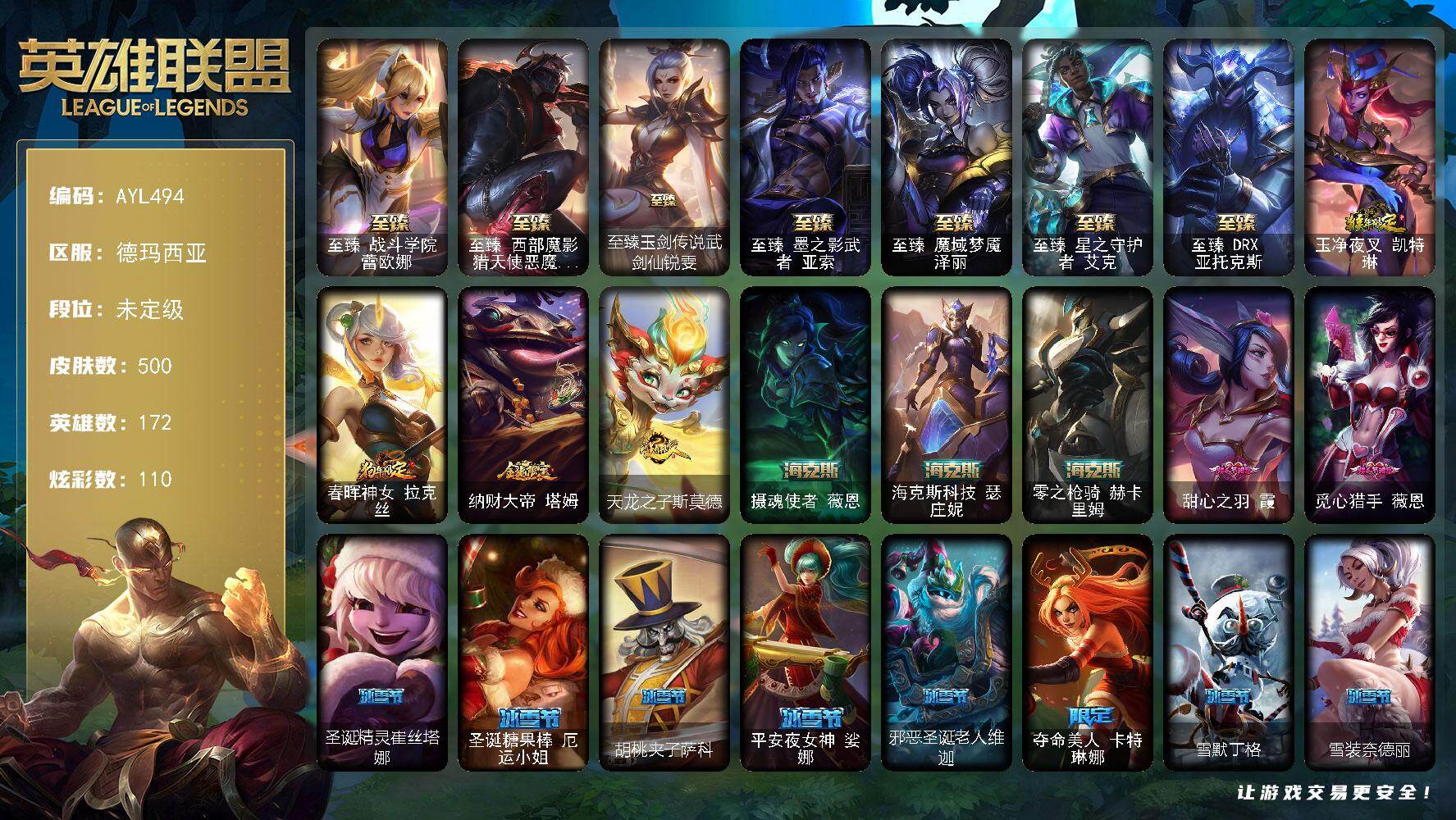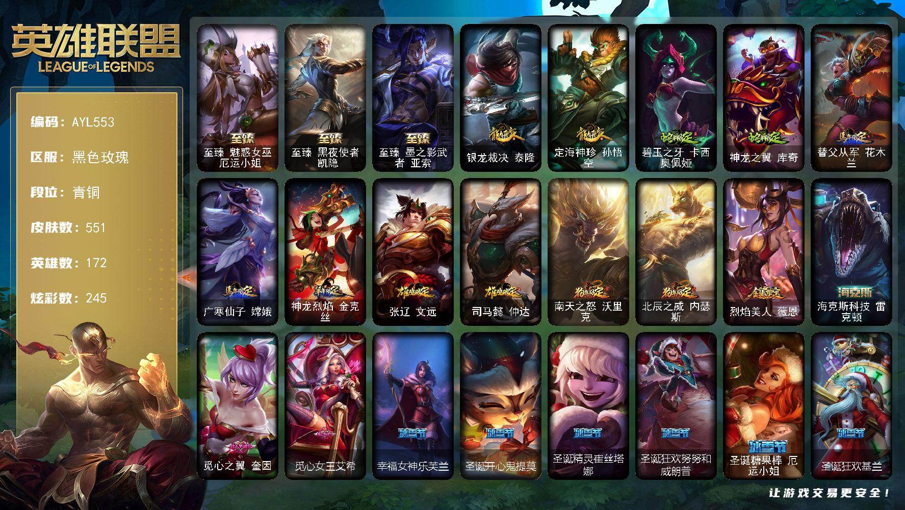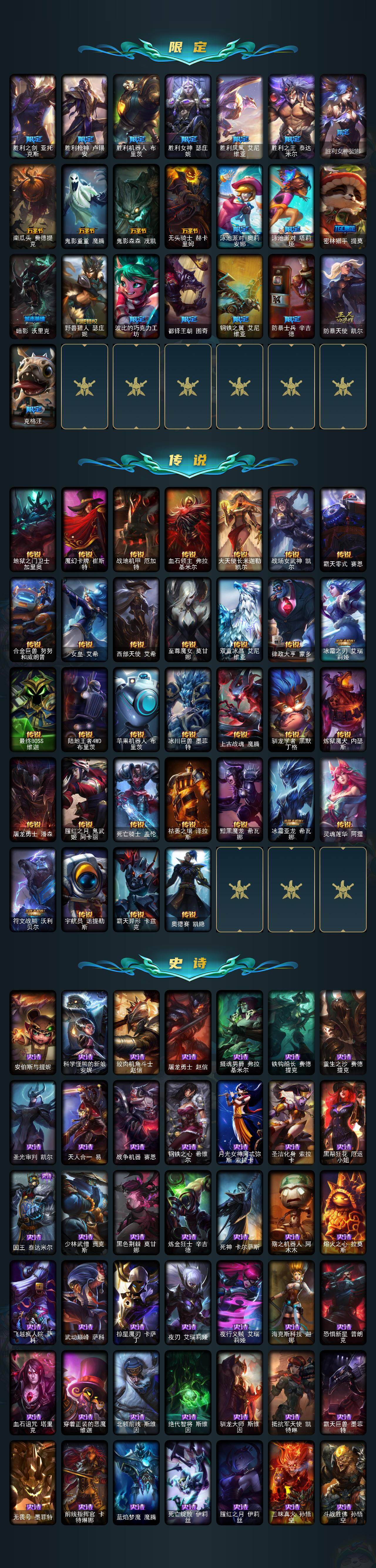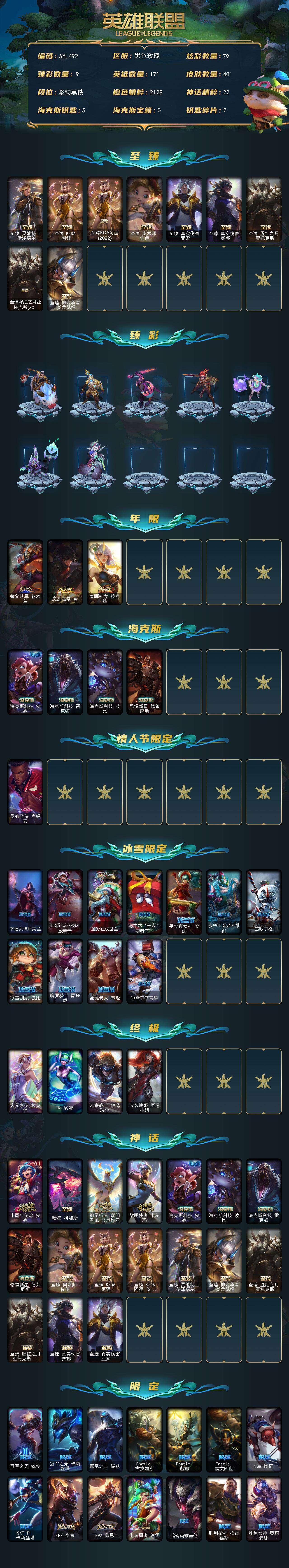 可二次【特价出售/店主推荐】未定级段位-171英雄-401皮肤-79炫彩-4终极-17神话-51限定-32传说-86史诗