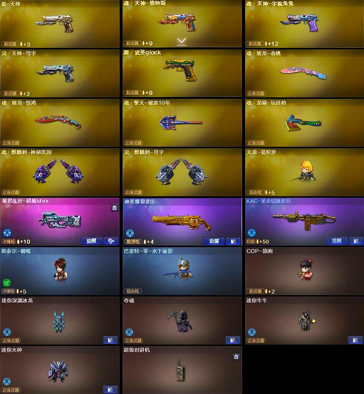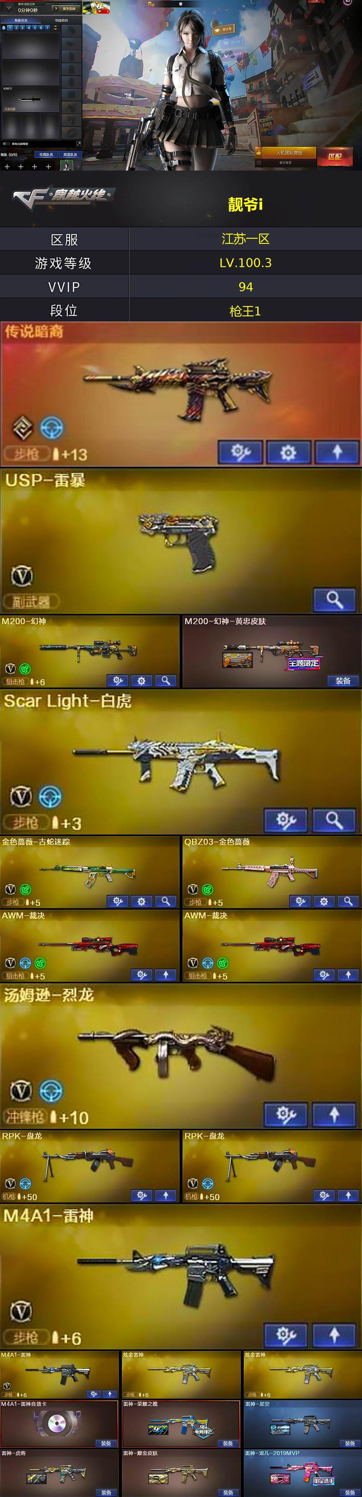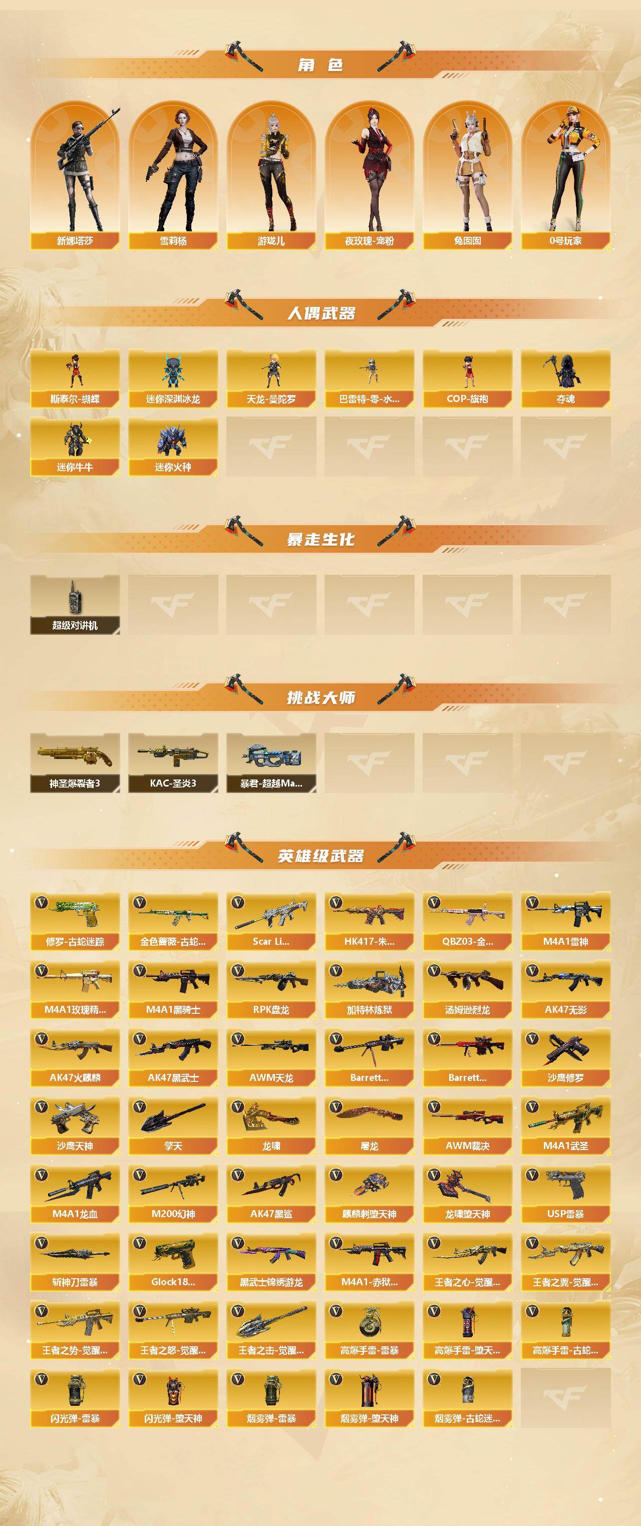【热门武器】:传说暗裔,QBZ03-金色蔷薇,Scar Light-白虎,HK417-朱雀,M200-幻神,金色蔷薇-古蛇迷踪,修罗-古蛇迷踪,M4A1-黑骑士*2,汤姆逊-烈龙,RPK-盘龙*2,加特林-炼狱*4,斯泰尔-蝴蝶,羊驼玩偶,USP-雷暴,沙鹰-修罗*3
