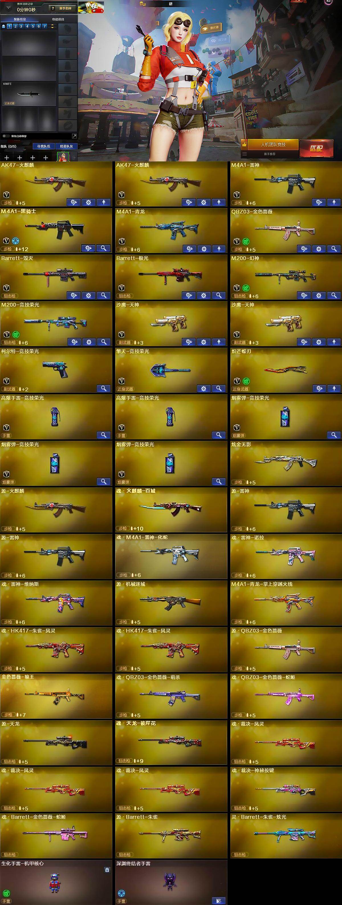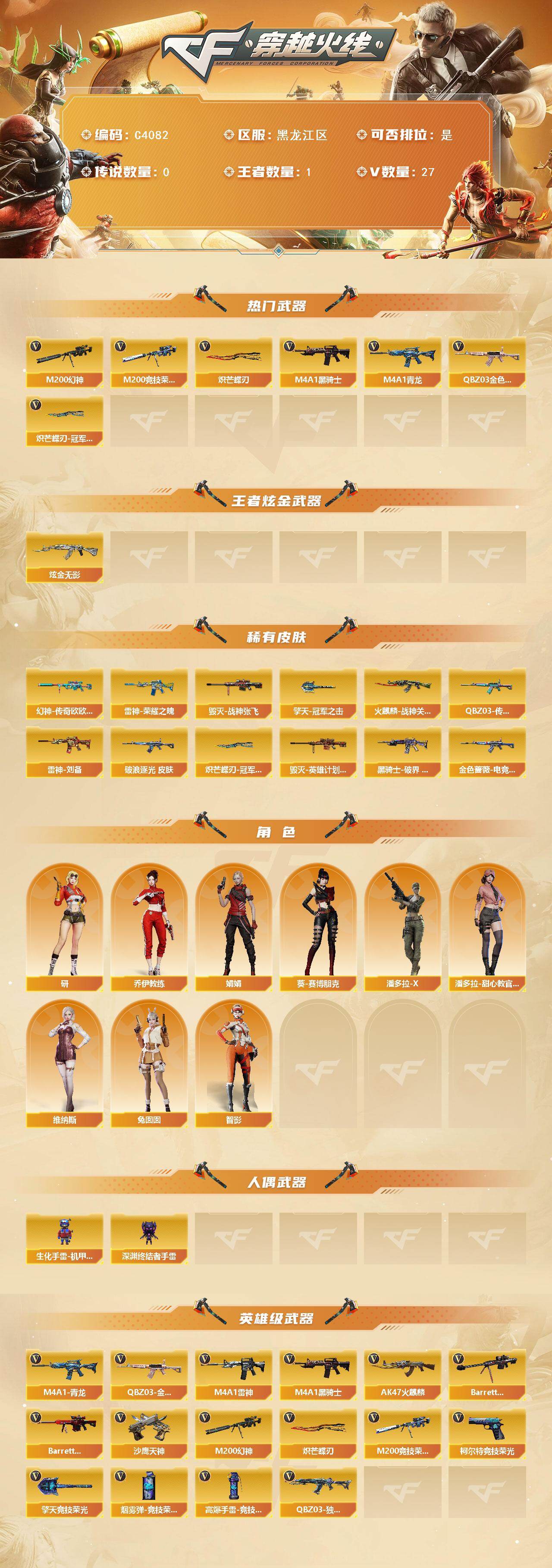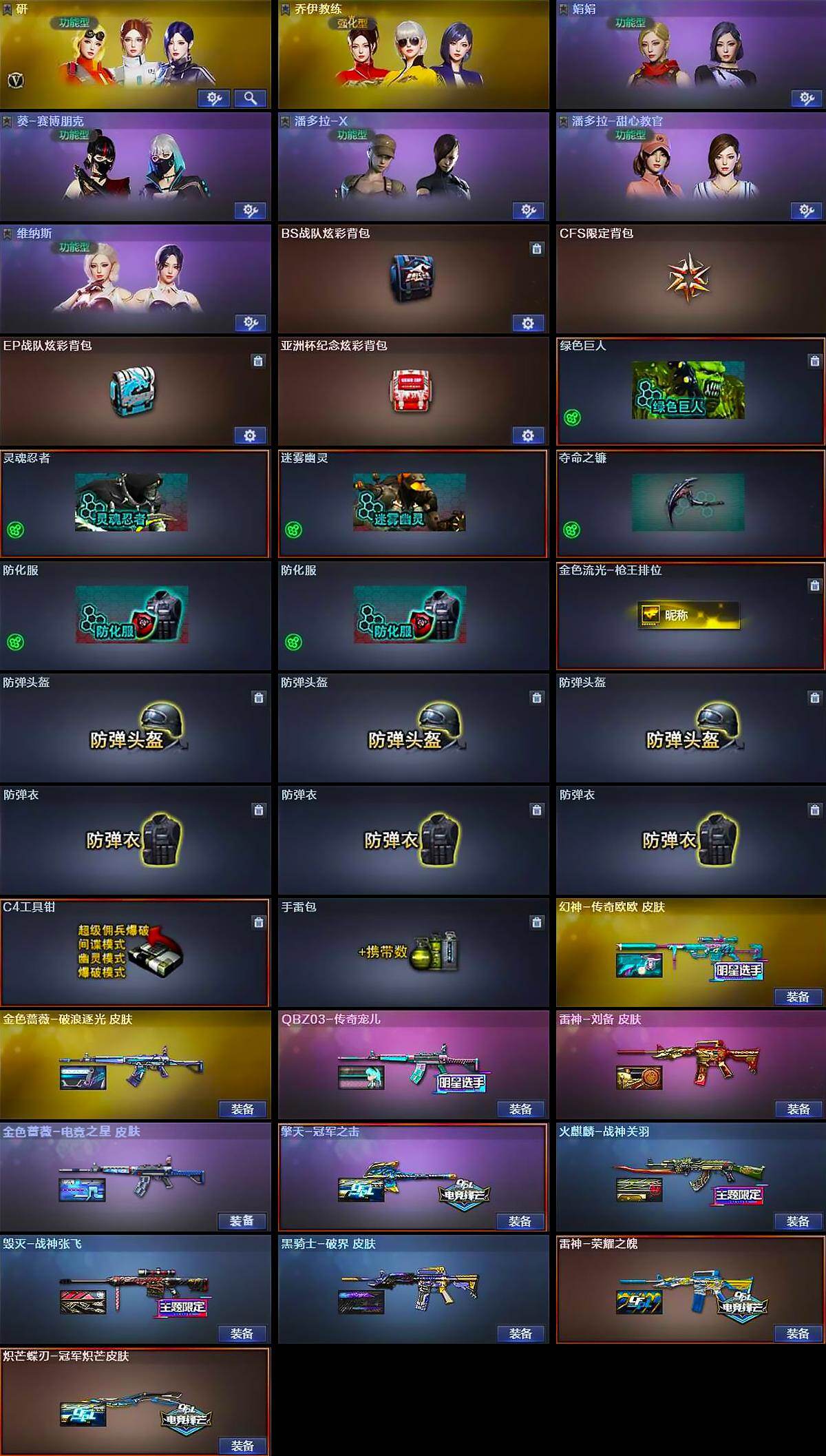【皮肤】:幻神-传奇欧欧 皮肤,QBZ03-传奇宠儿,金色蔷薇-破浪逐光 皮肤,金色蔷薇-电竞之星 皮肤,雷神-荣耀之魄,雷神-刘备 皮肤,火麒麟-战神关羽,毁灭-战神张飞,毁灭-英雄计划 皮肤,黑骑士-破界 皮肤,擎天-冠军之击,炽芒蝶刃-冠军炽芒皮肤
