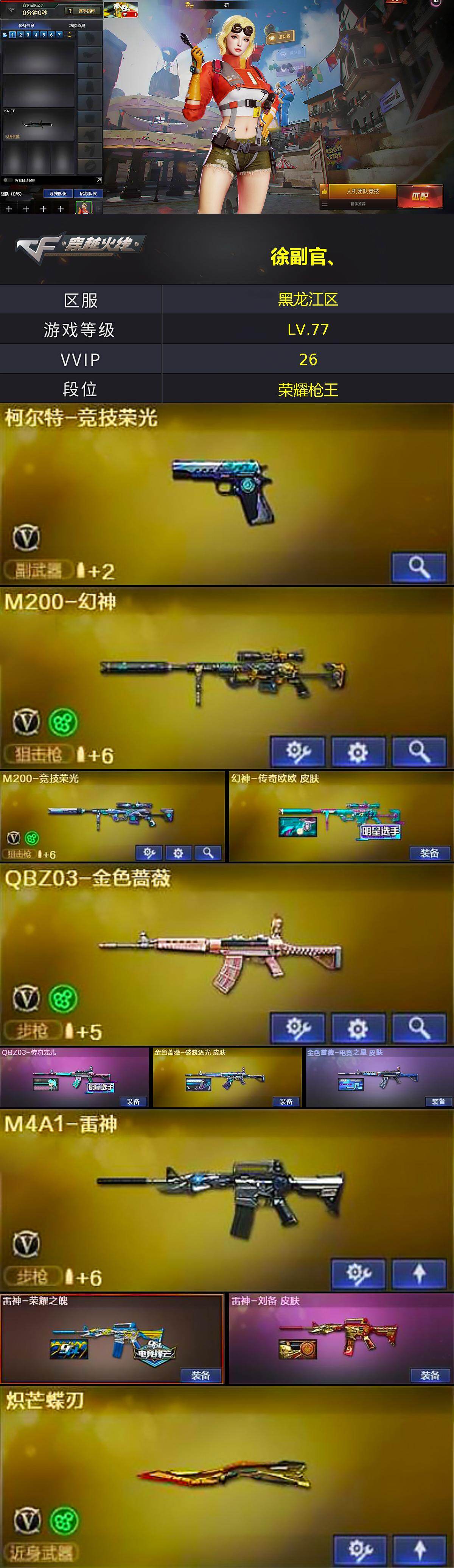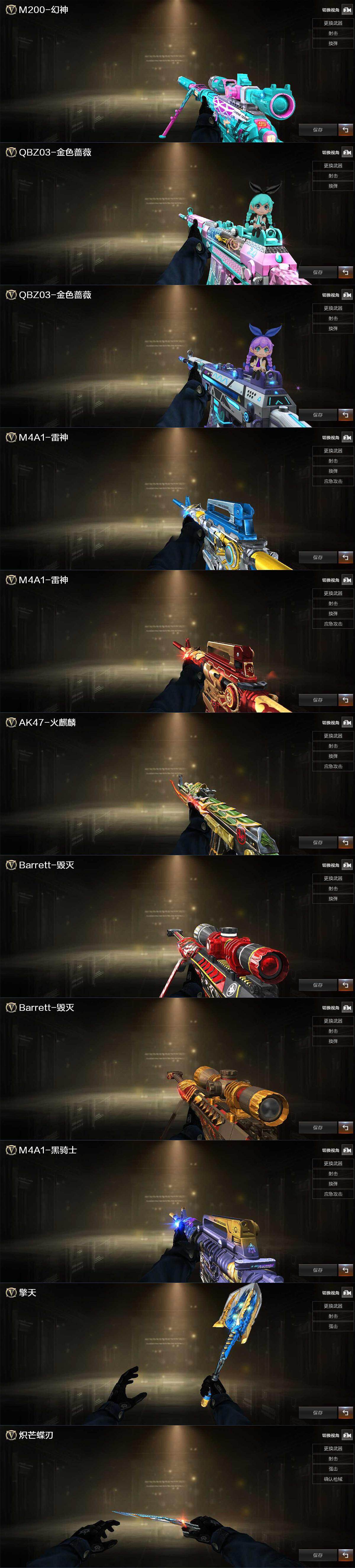 【热门武器】:QBZ03-金色蔷薇,M4A1-青龙,M200-幻神,M200-竞技荣光,M4A1-黑骑士,炽芒蝶刃,炽芒蝶刃-冠军炽芒皮肤
