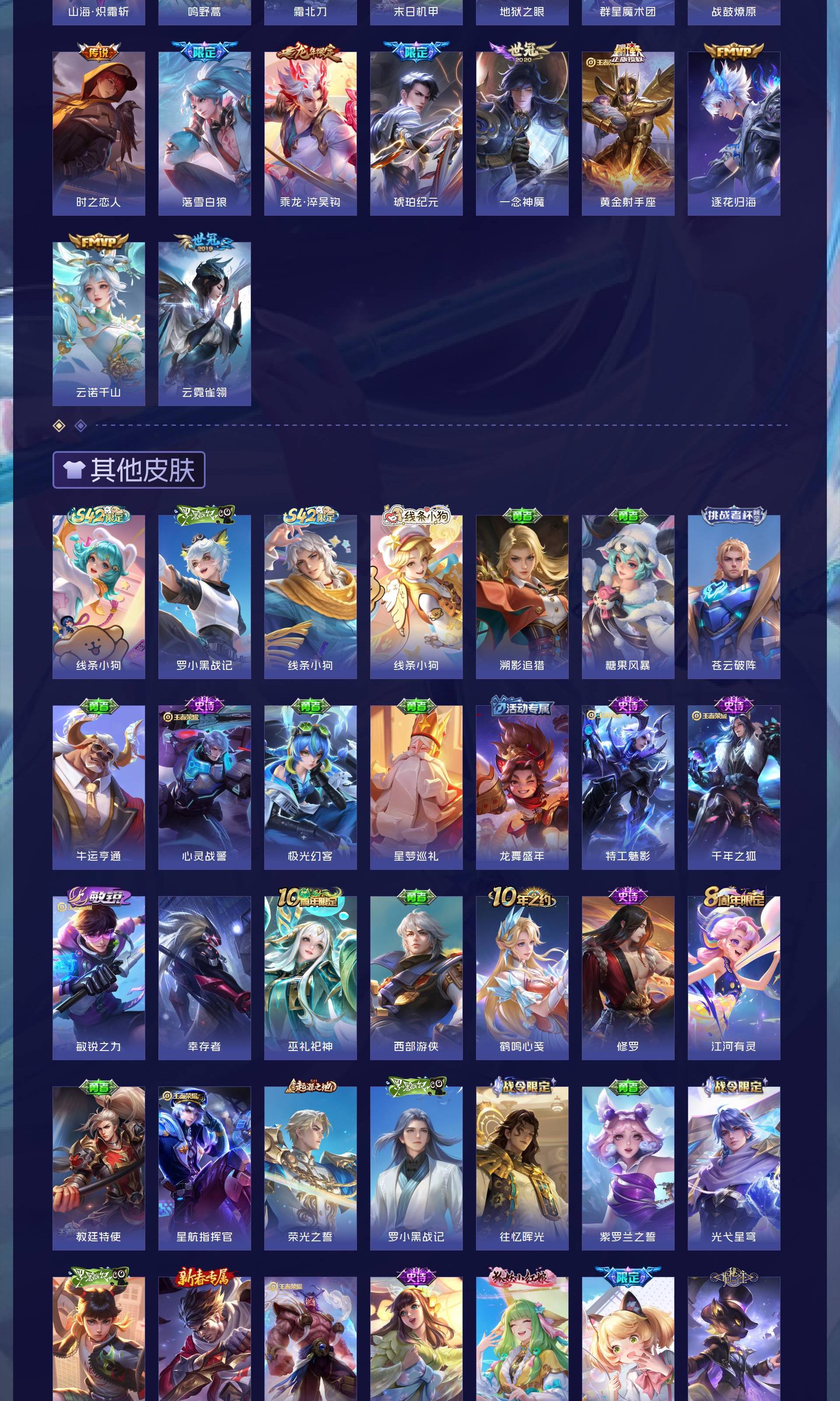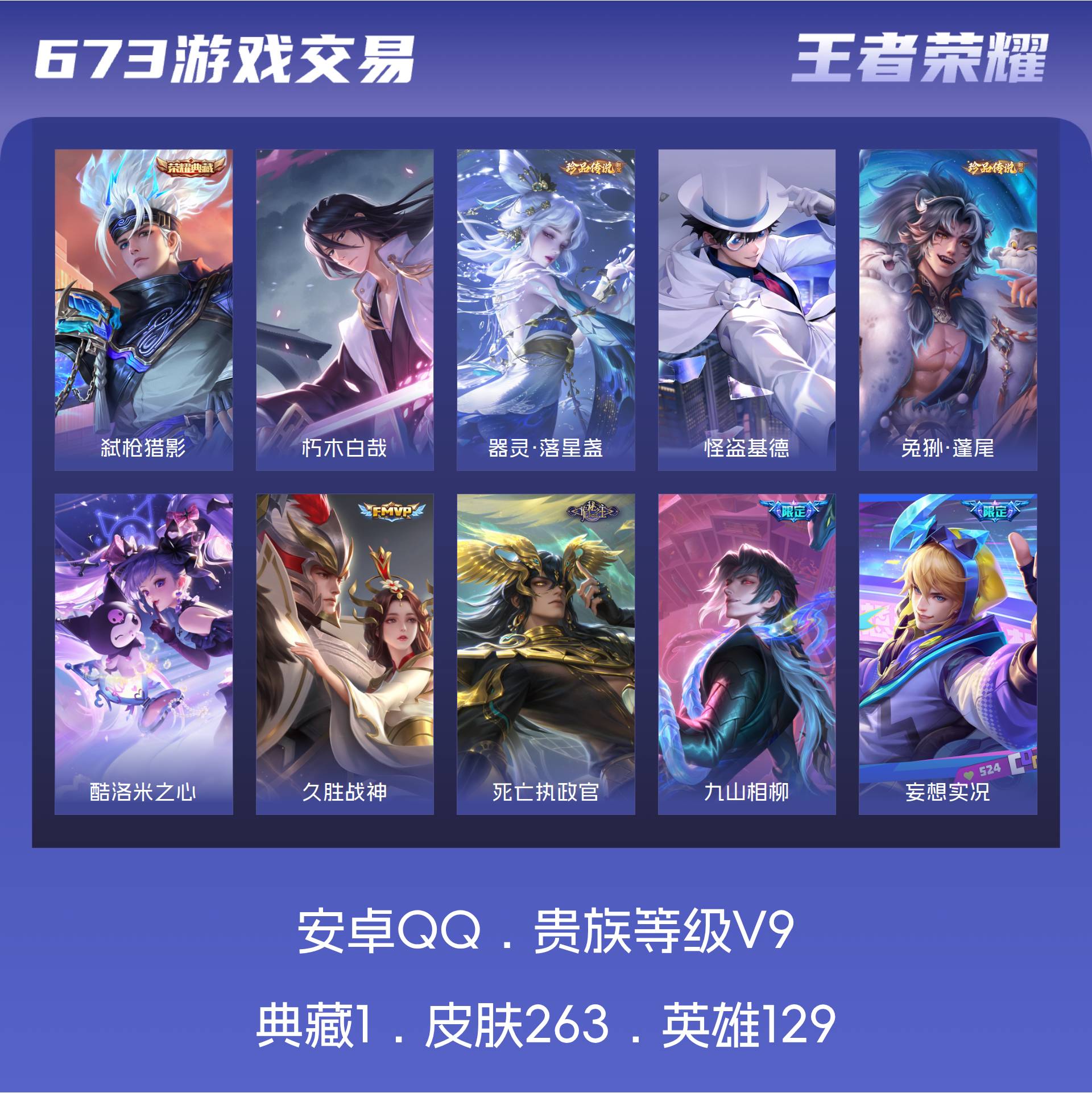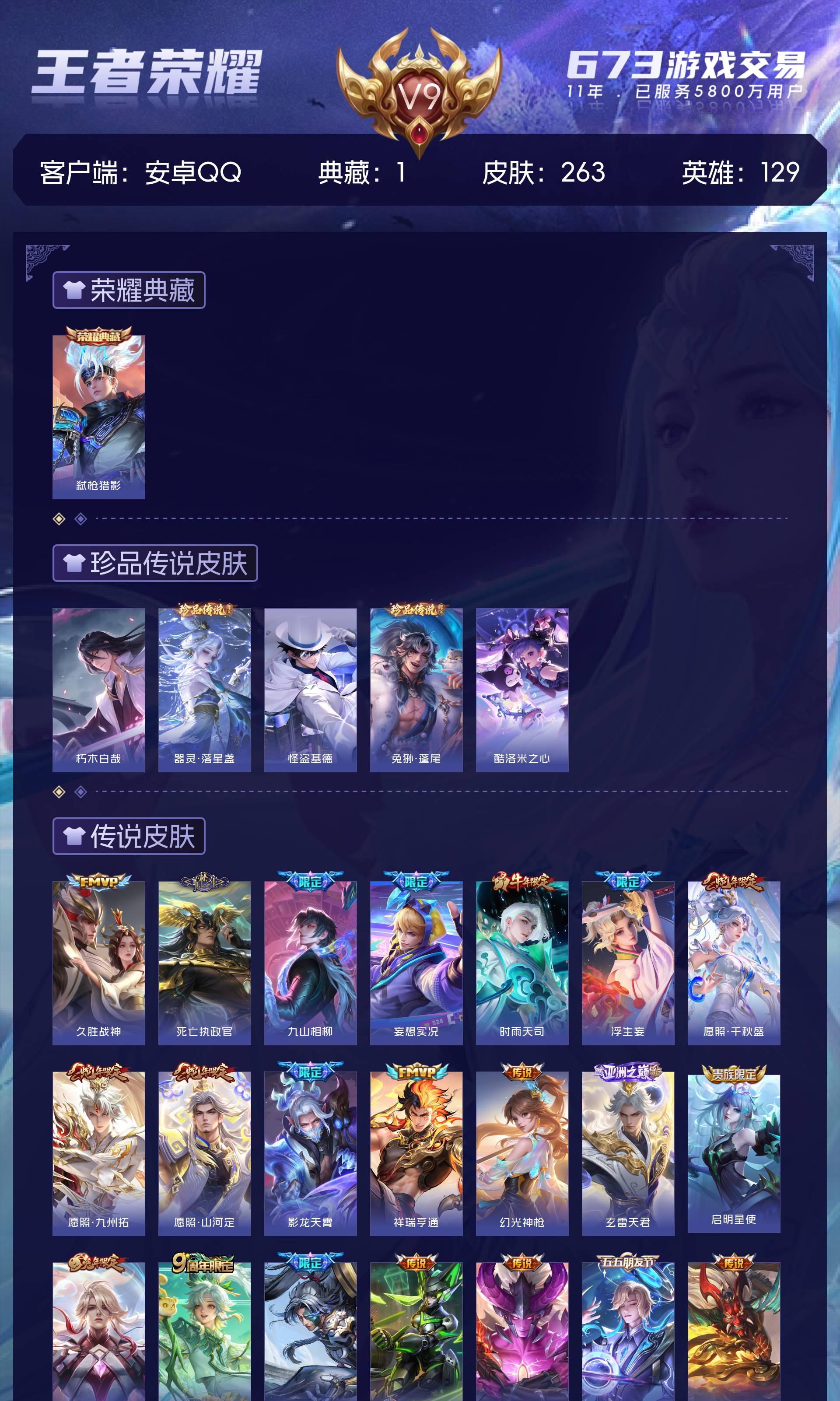 V9 皮肤263 英雄129 至尊星耀 荣耀典藏1 珍品传说5 传说30 其他皮肤231
