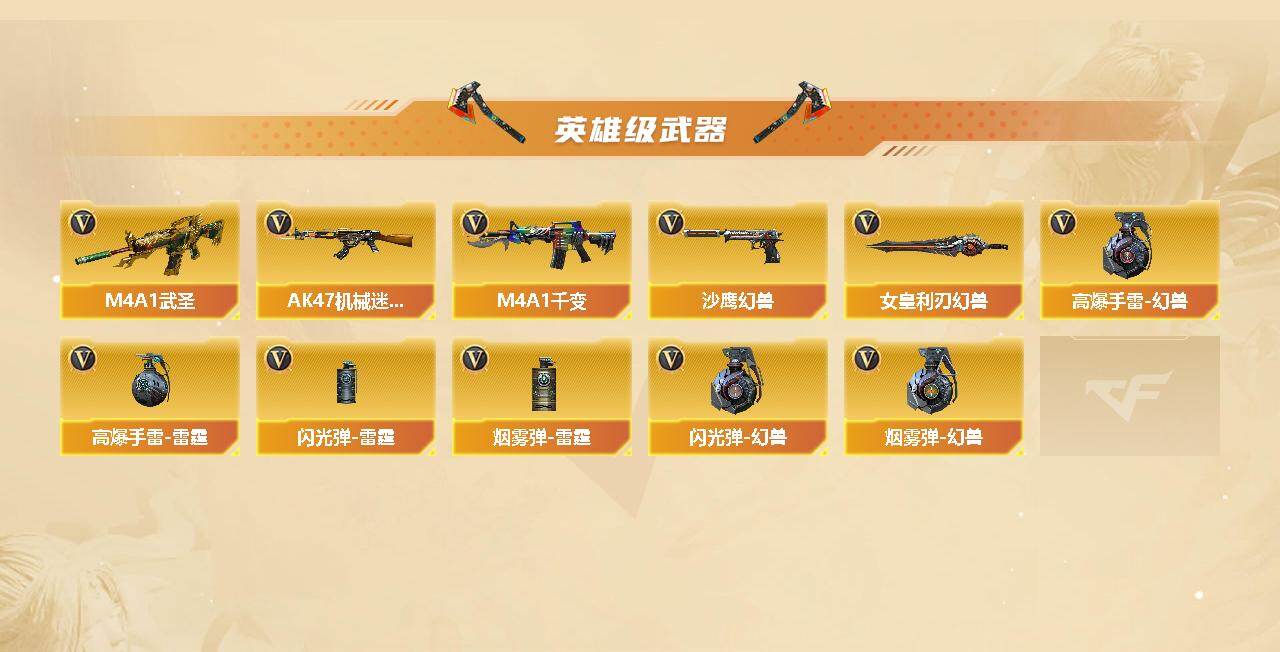 【王者炫金武器】:王者之势,王者之武*2,玫瑰精灵-悦动,王者之影,王者之魄*2,王者之心,王者之光,王者之怒,王者之力,炼狱-悦蓝,烈龙-悦心,王者之灵,王者之魂,王者之刺,王者之击,王者之锋*2,炫金火麒麟,