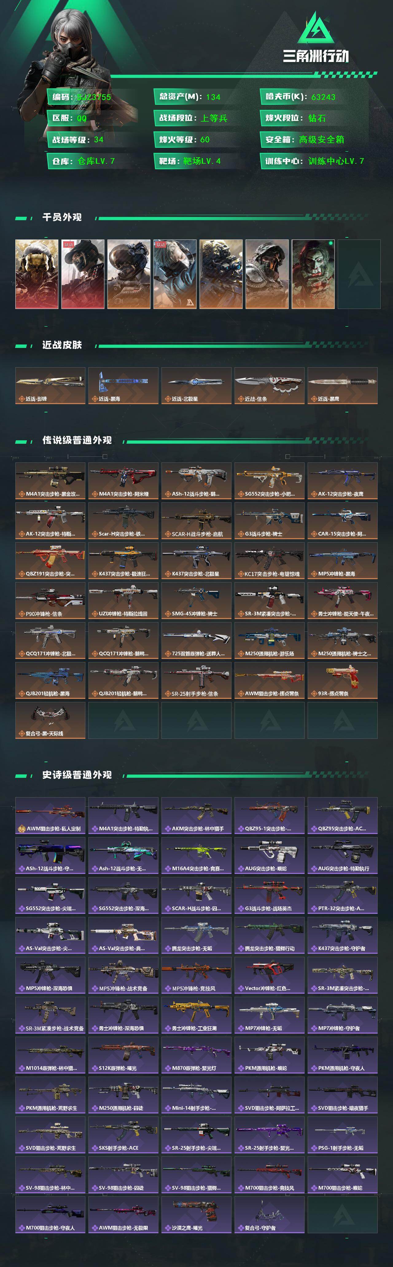 总资产(M):134M/哈夫币(K):63243K/ 传说枪皮数:31/全面战场等级:34_段位:上等兵/烽火地带等级:60_段位:钻石/