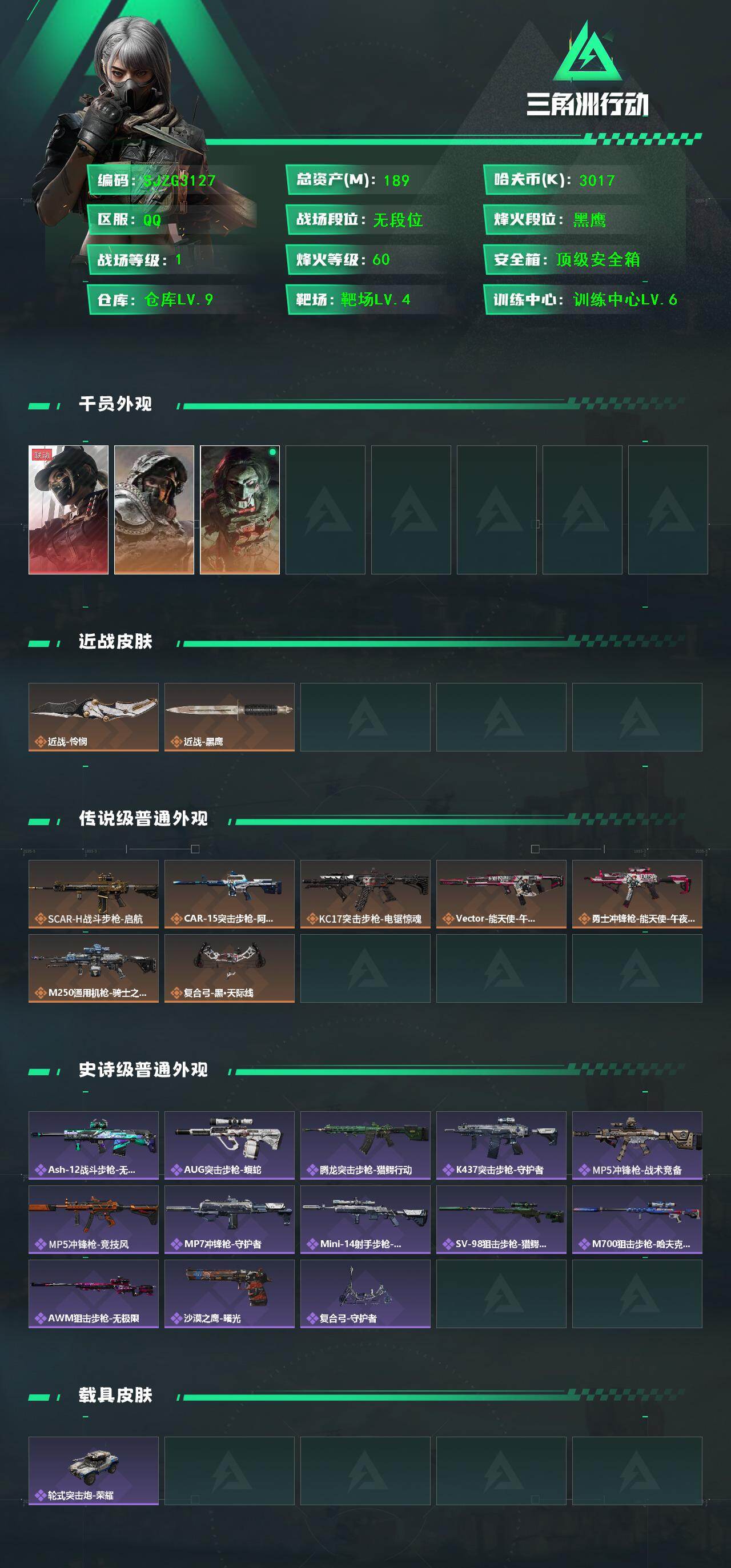 总资产(M):189M/哈夫币(K):3017K/传说枪皮数:7/全面战场等级:1_段位:无段位/烽火地带等级:60_段位:黑鹰/