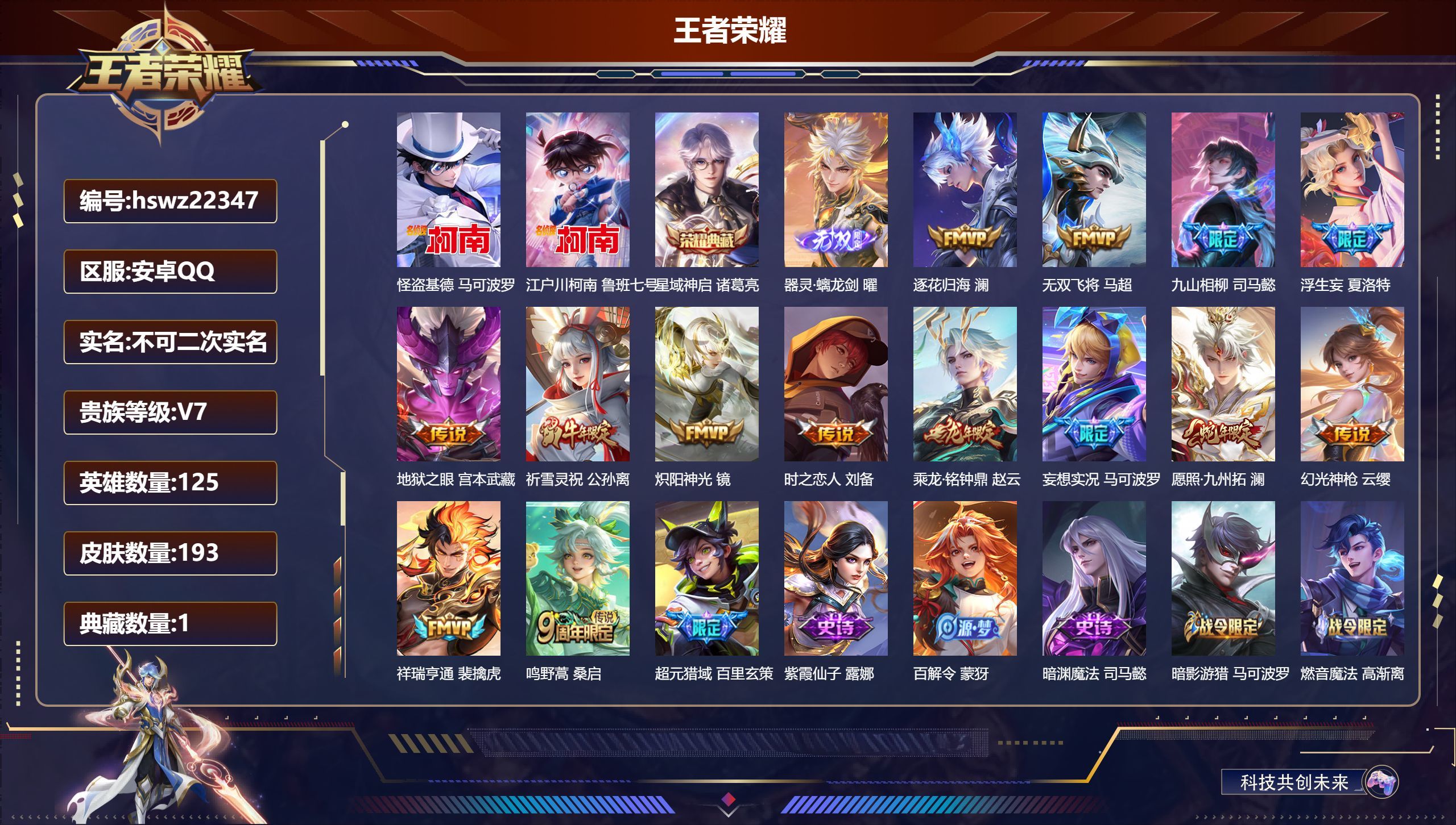 安卓QQ/永恒钻石/193皮肤/125英雄/1典藏/0珍品无双/1无双/2珍品传说/14传说/62史