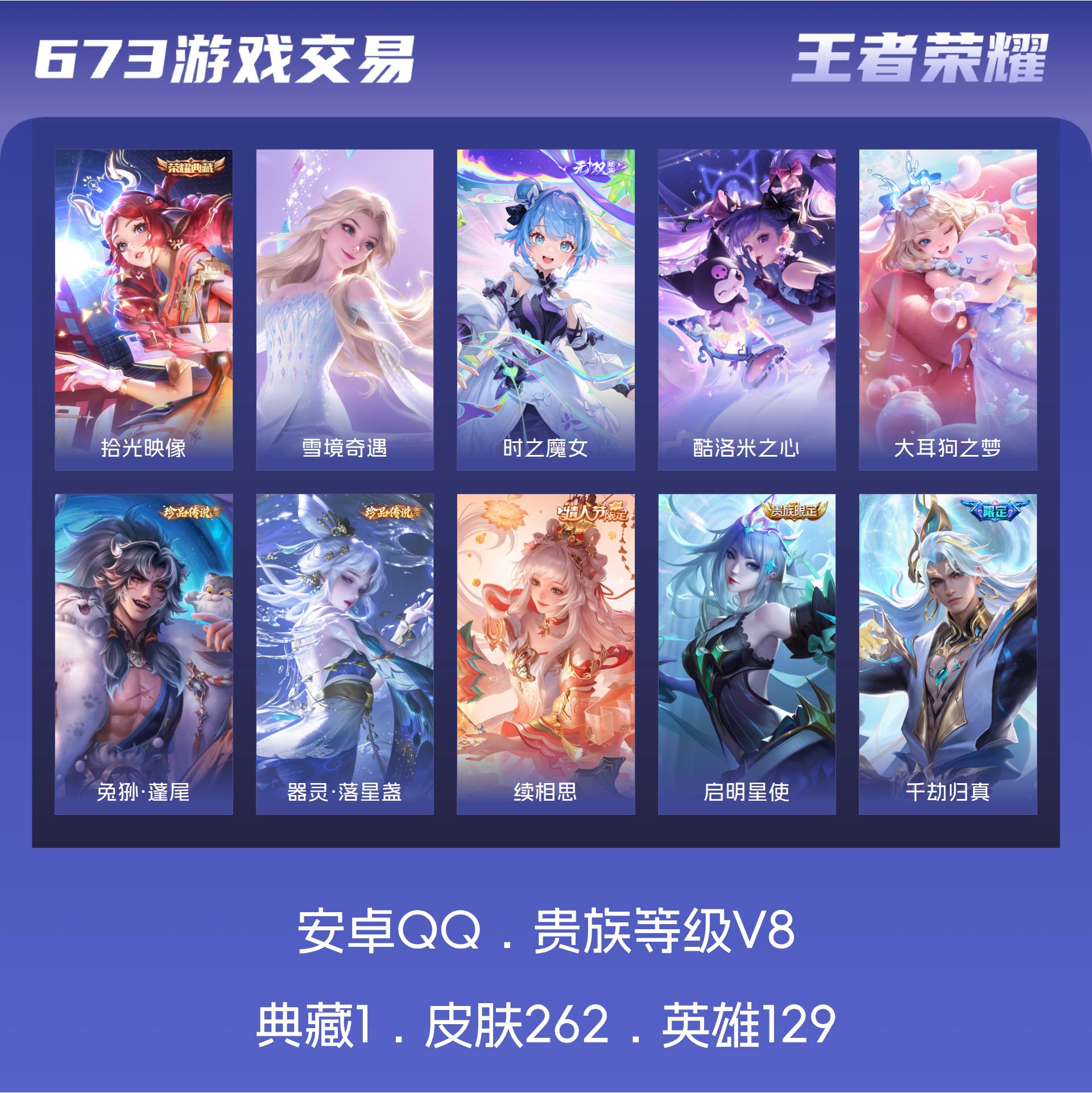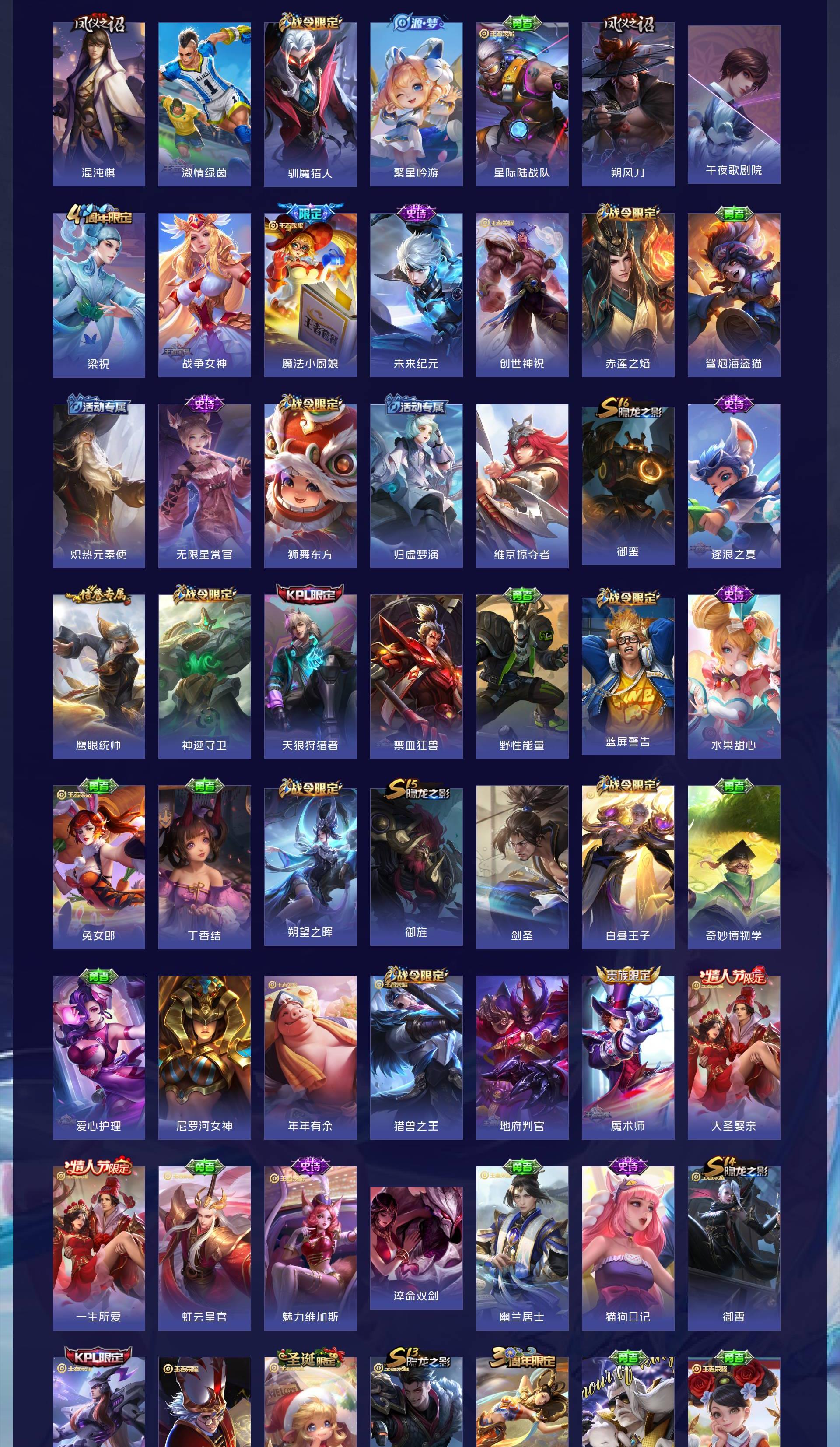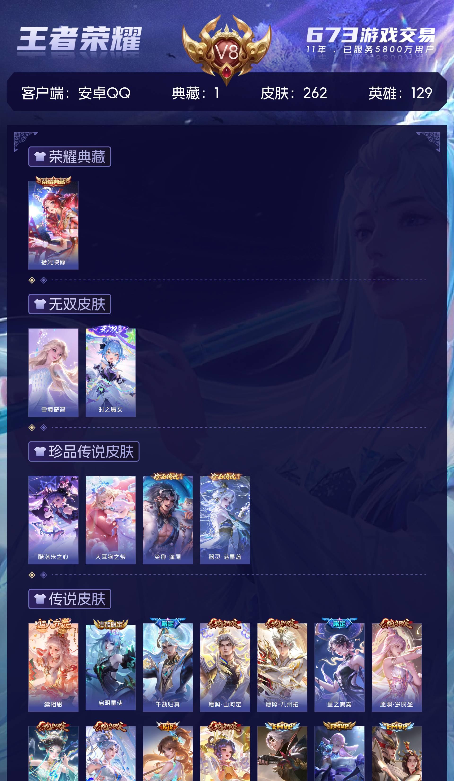 V8 皮肤262 英雄129 永恒钻石 荣耀典藏1 无双皮肤2 珍品传说4 传说16 其他皮肤245