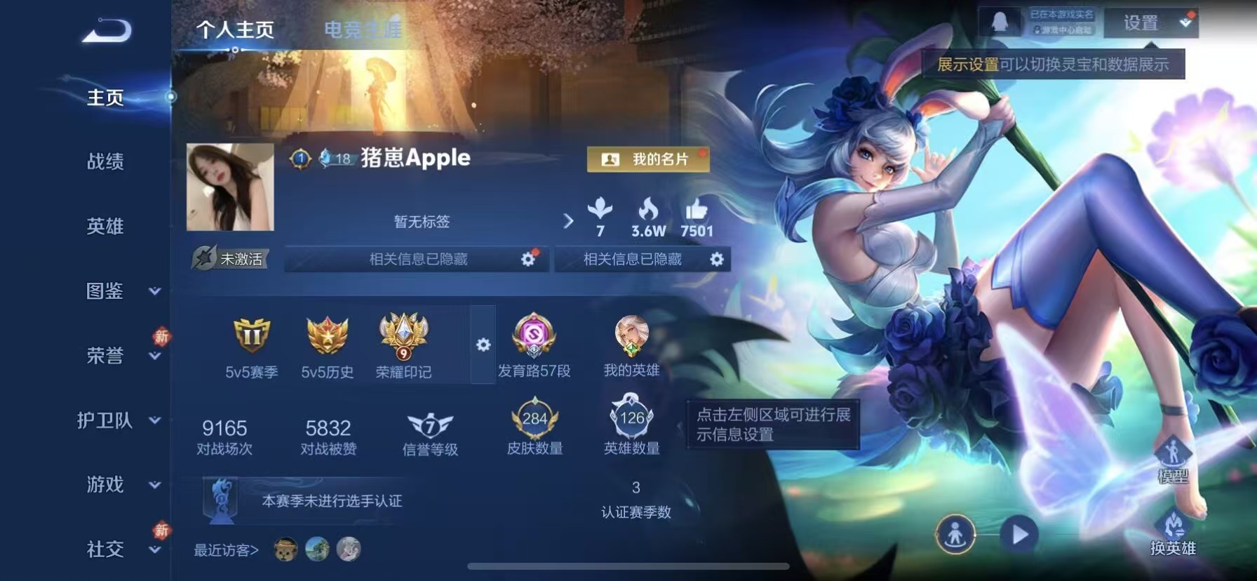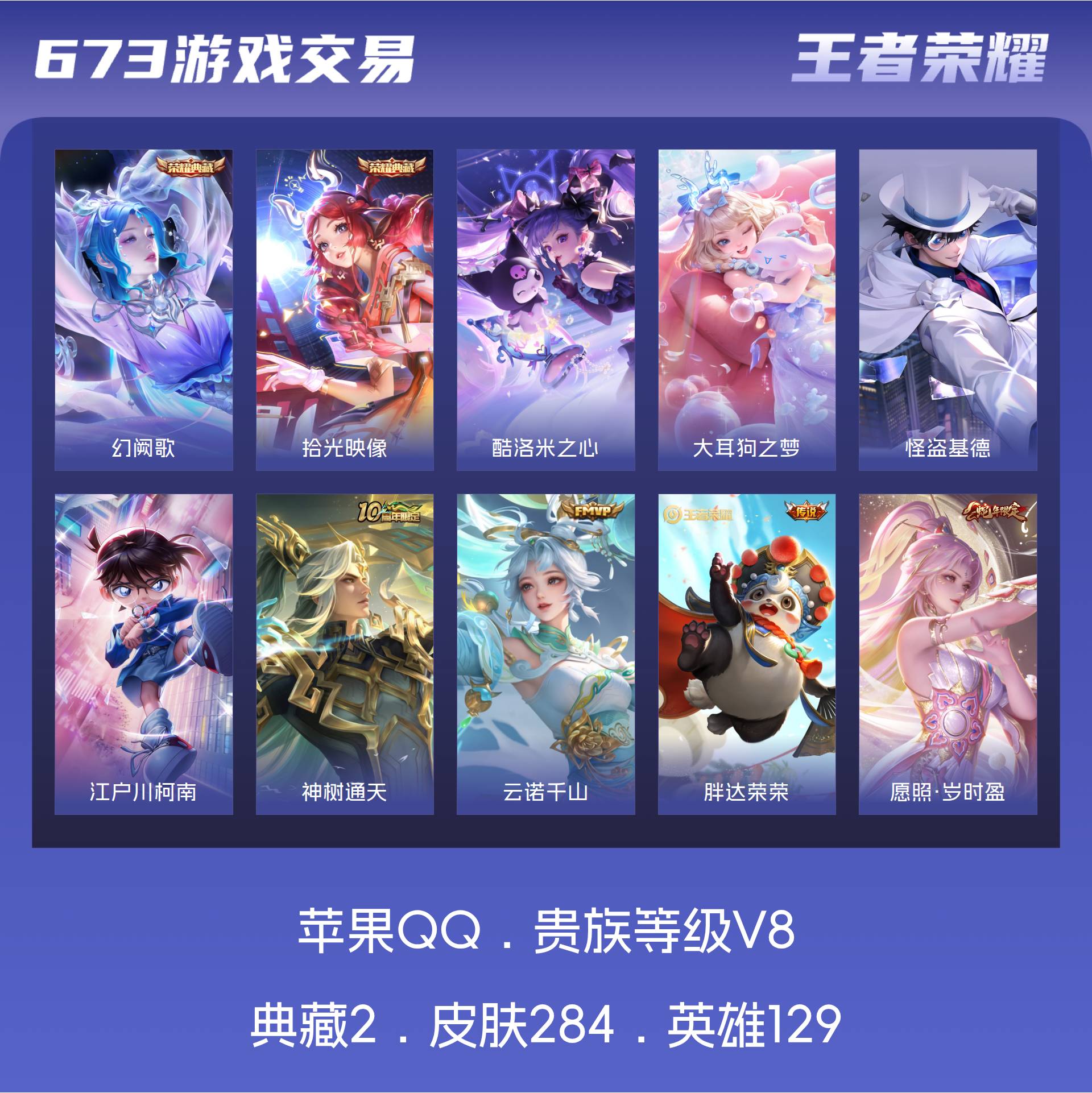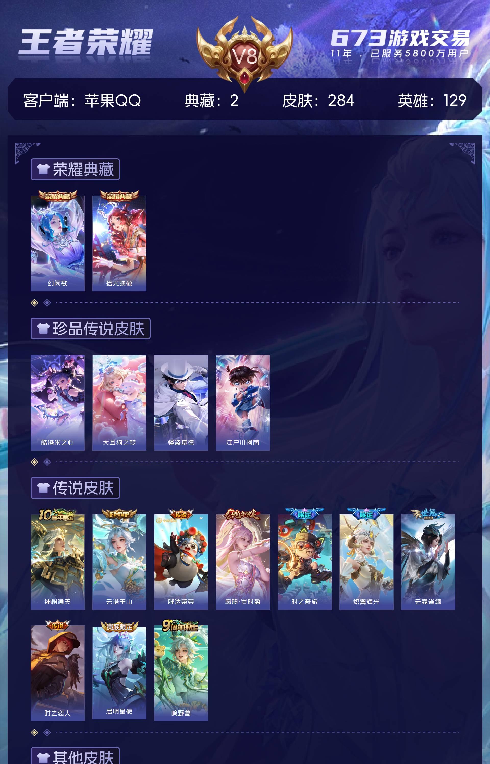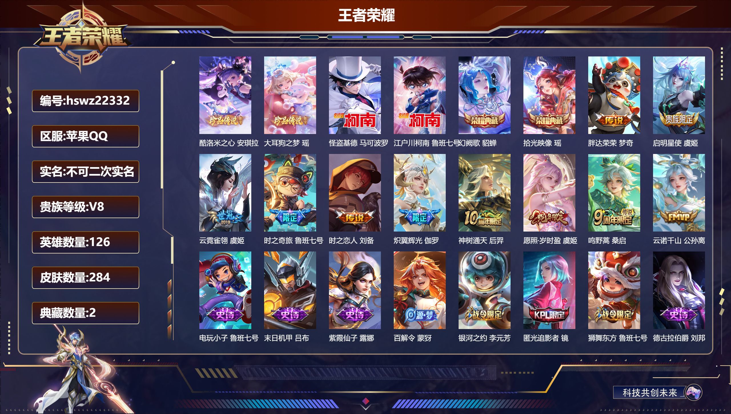苹果QQ/至尊星耀/284皮肤/126英雄/2典藏/0珍品无双/0无双/4珍品传说/10传说/82史