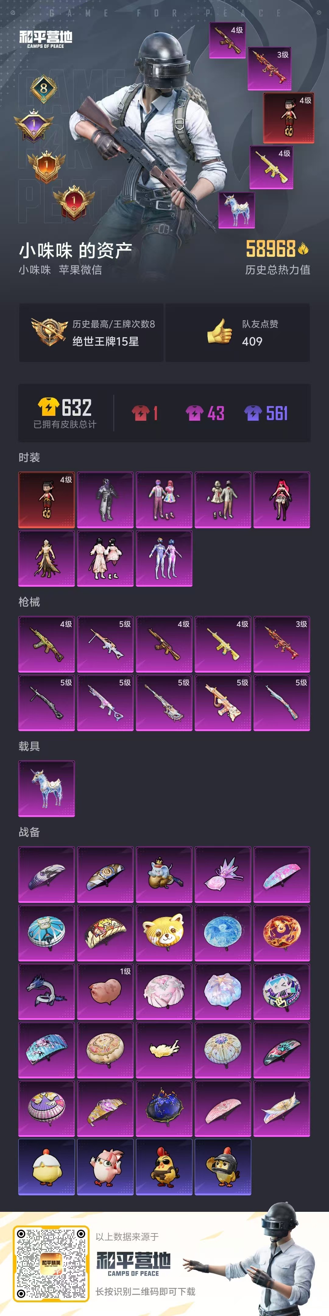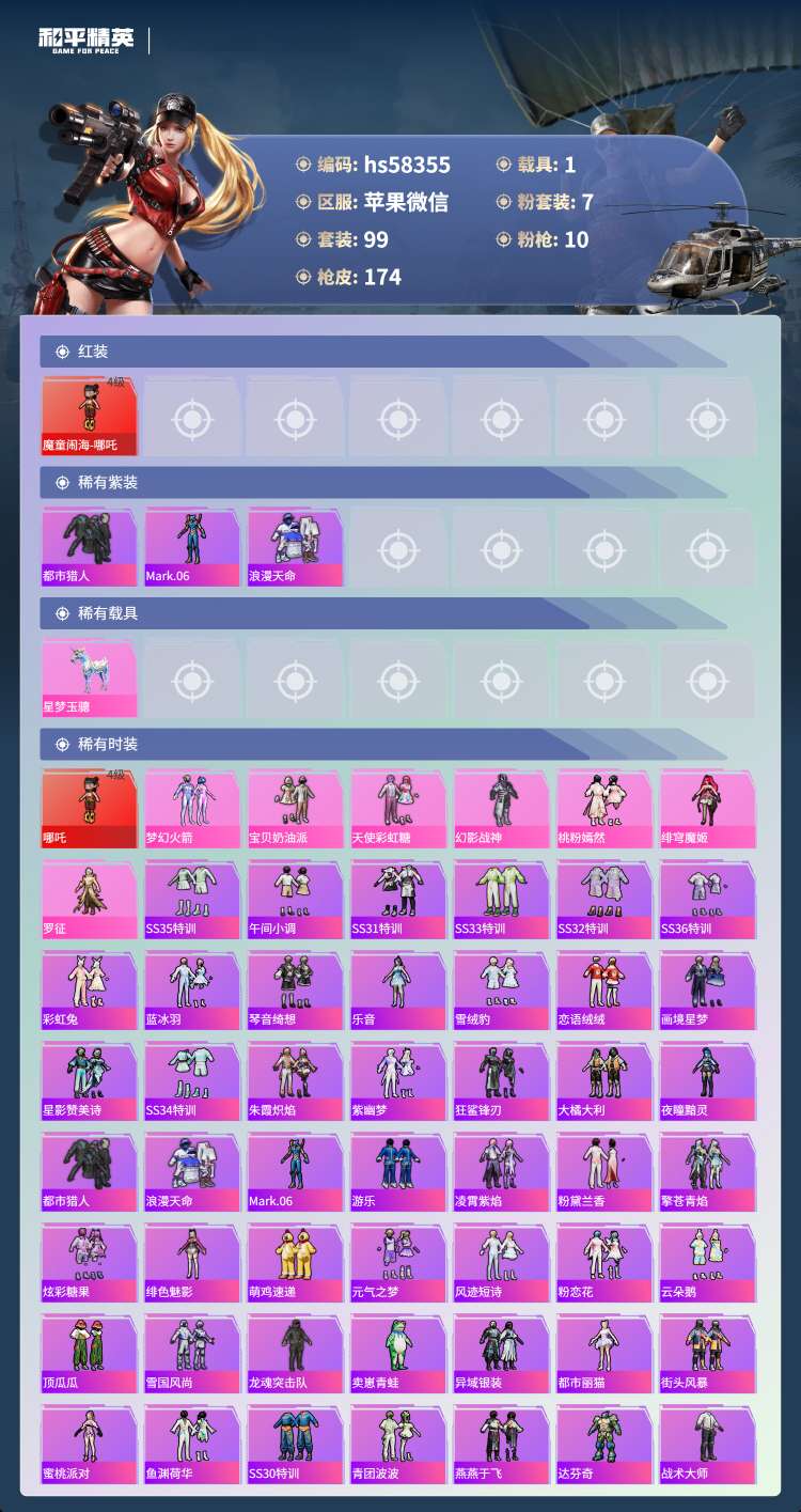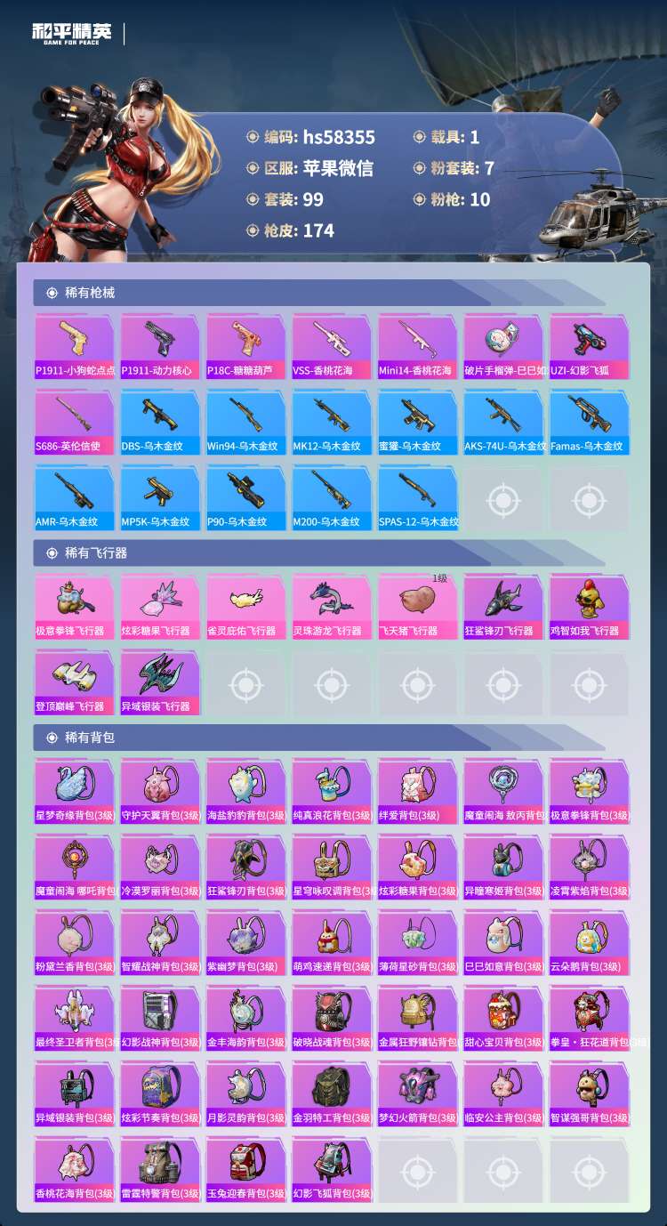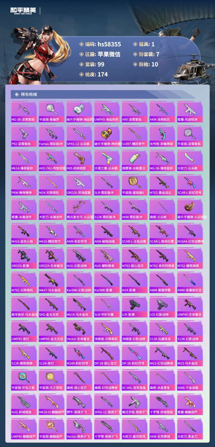 hs58355 苹果微-8王牌印记-1红装-7粉装-10特效枪-1载具-58968热力值-99套装