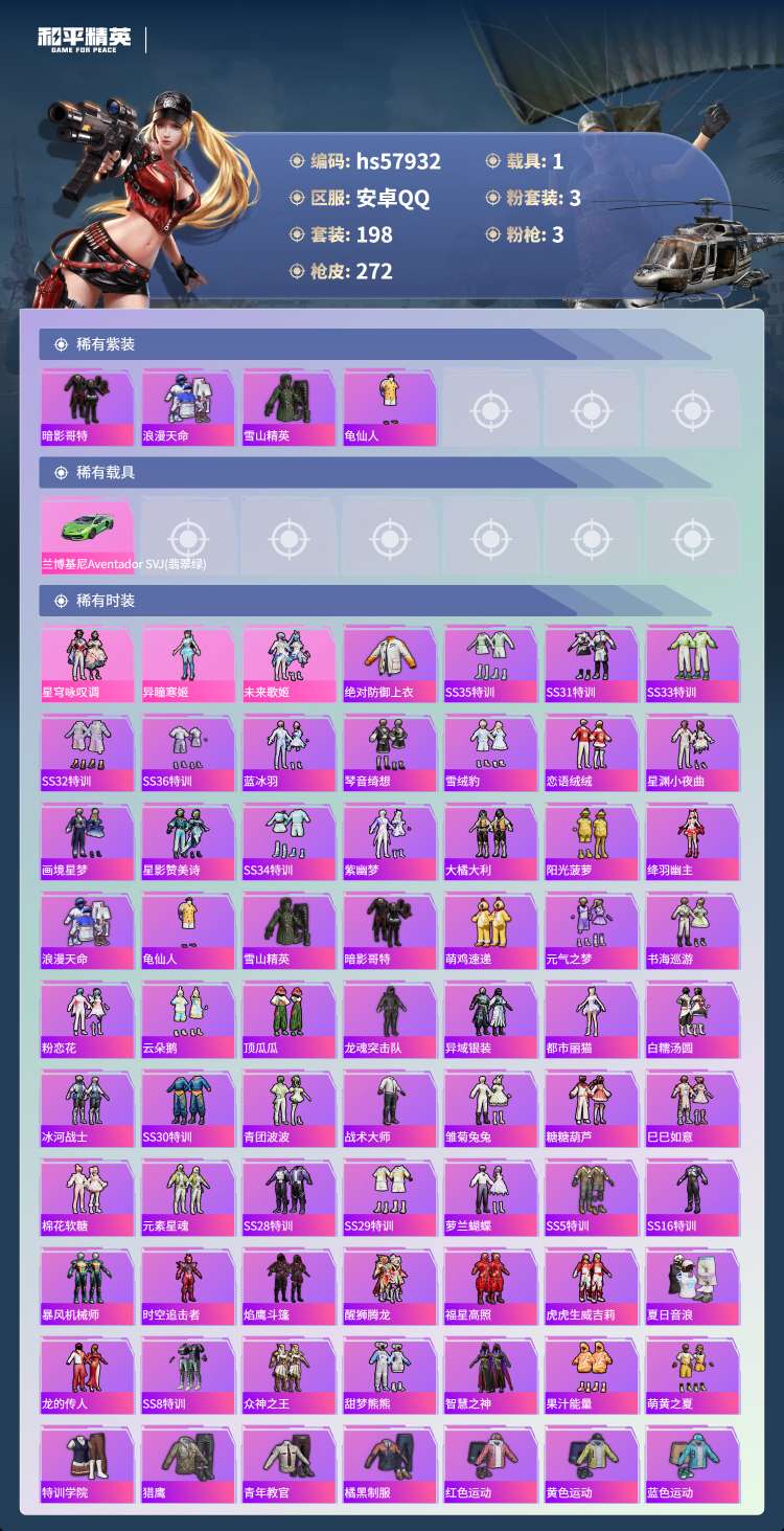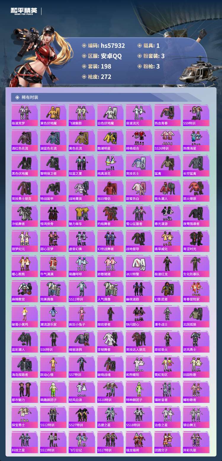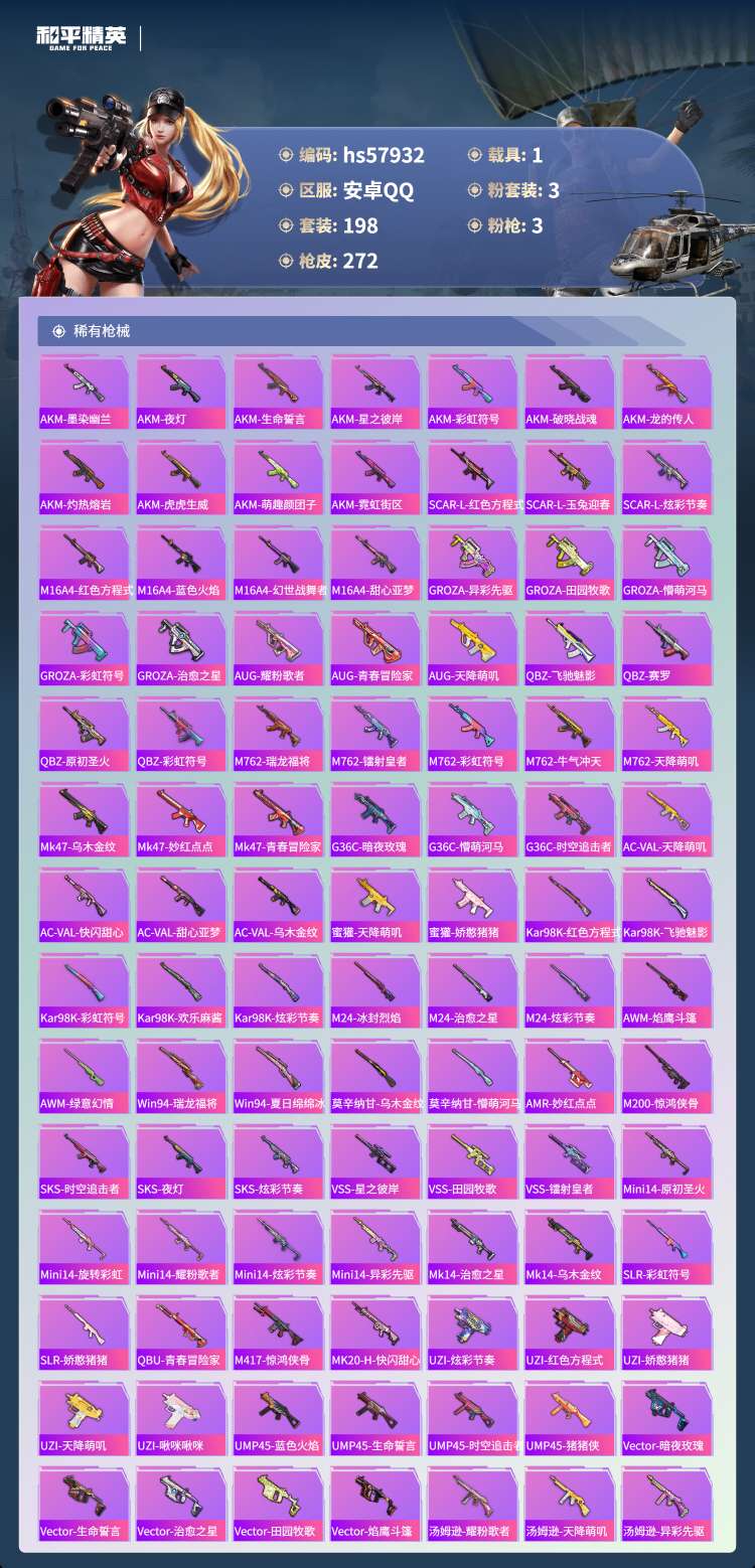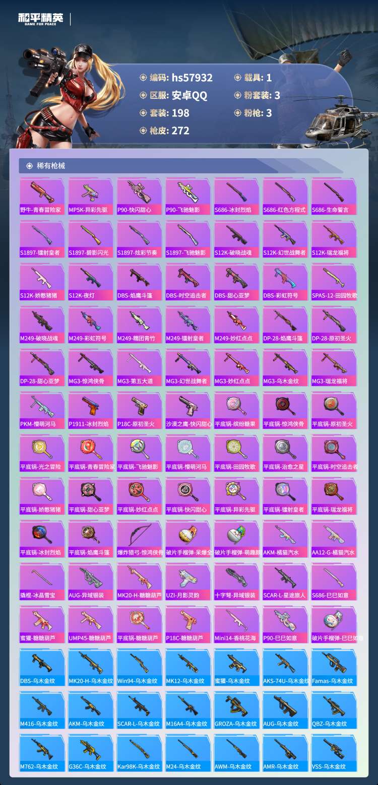 hs57932 安卓手Q-26王牌印记-3粉装-3特效枪-1载具-80685热力值-198套装-27