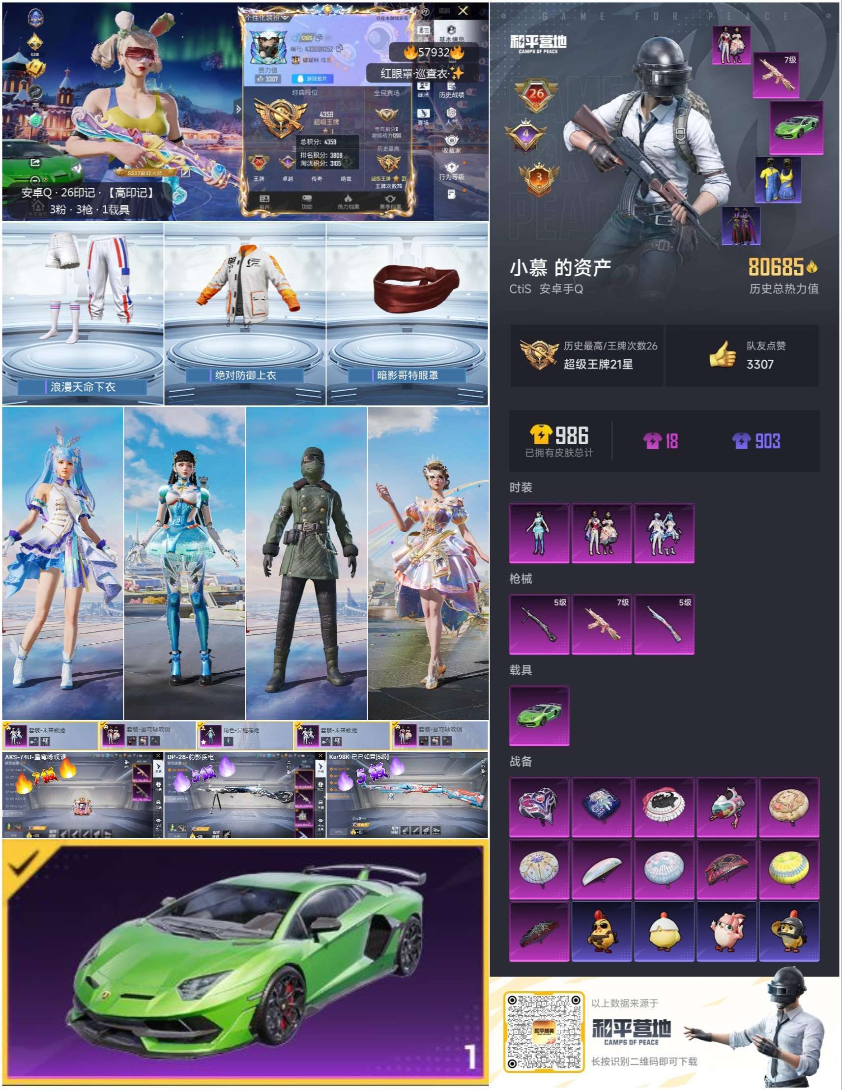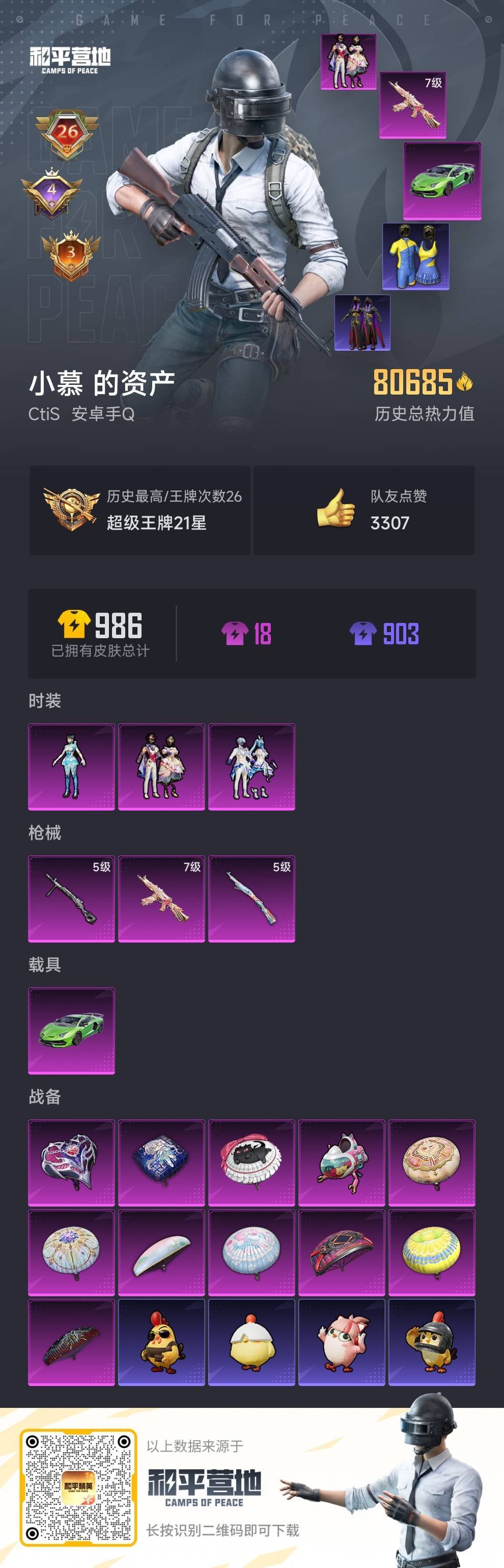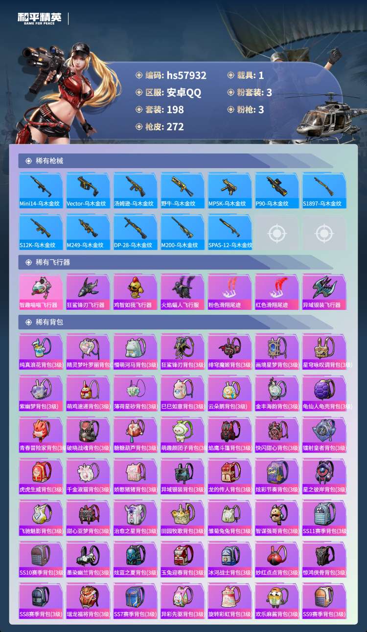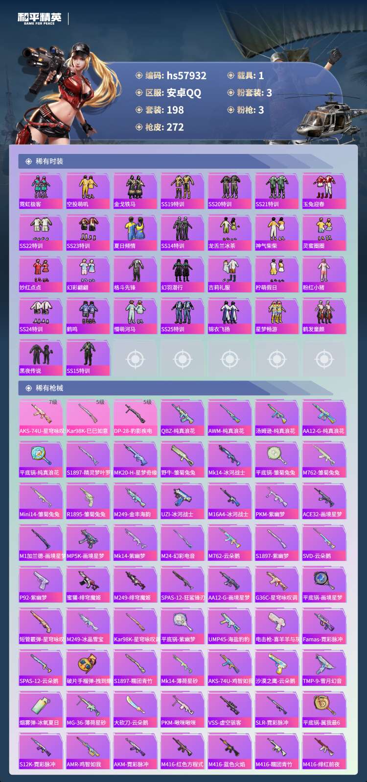 hs57932 安卓手Q-26王牌印记-3粉装-3特效枪-1载具-80685热力值-198套装-27