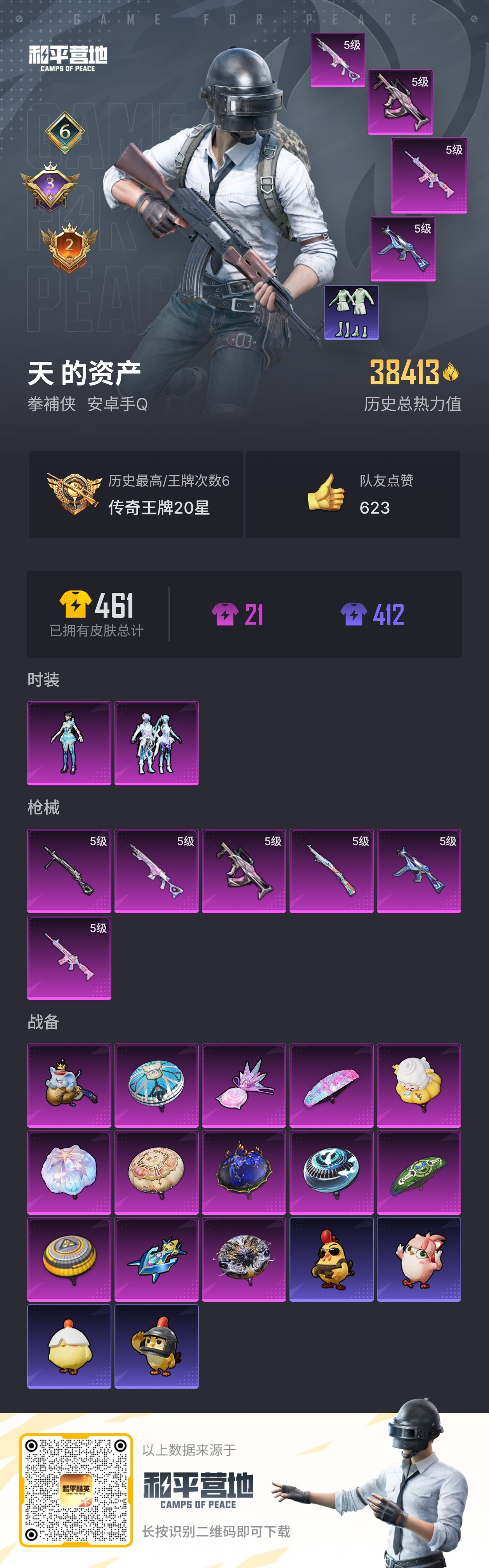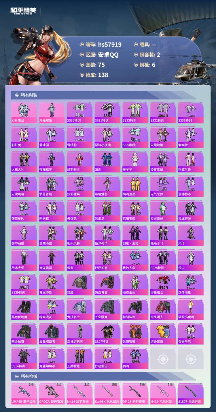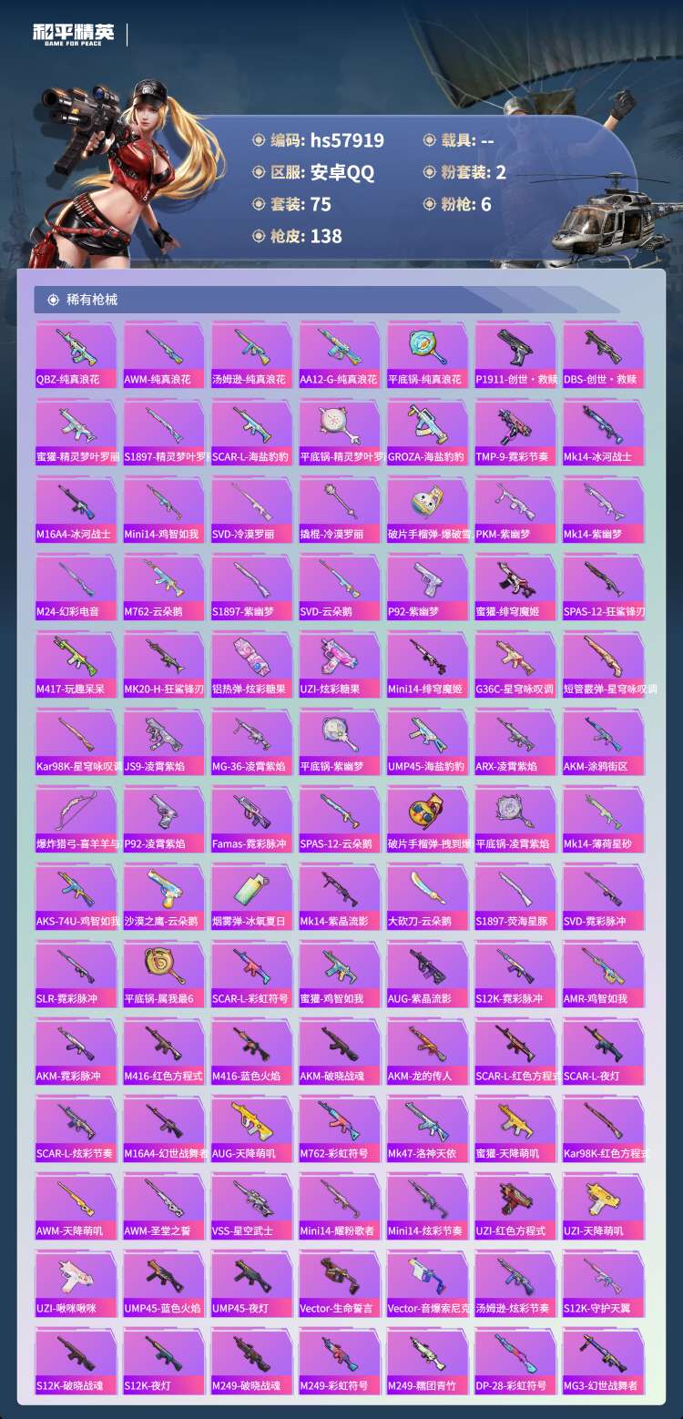 hs57919 安卓手Q-6王牌印记-2粉装-6特效枪-38683热力值-75套装-138枪皮-3卓