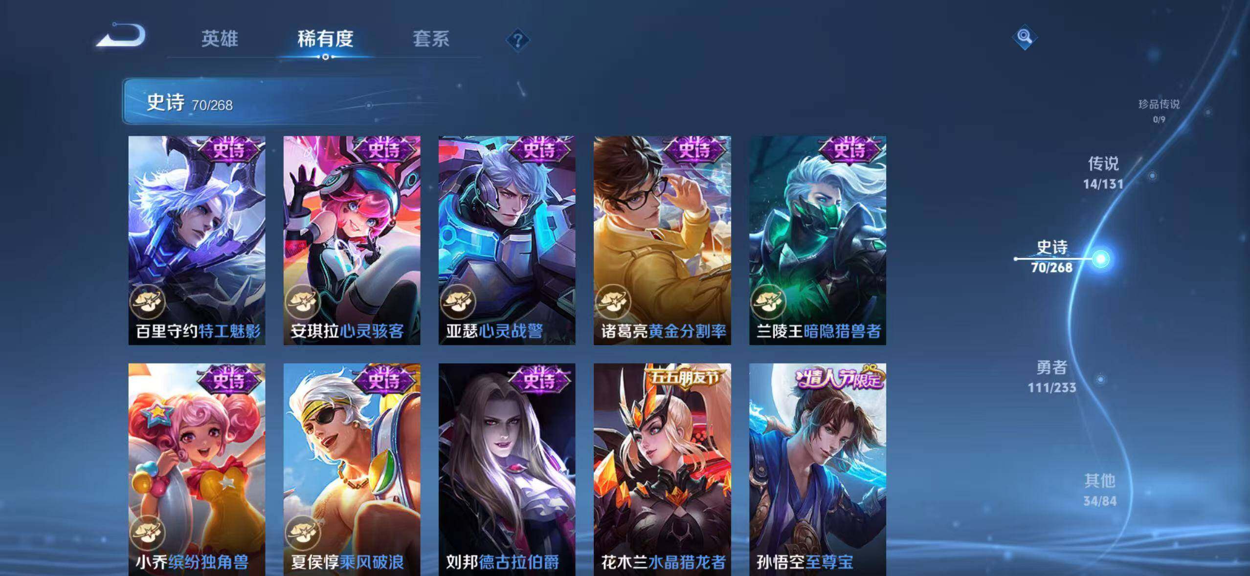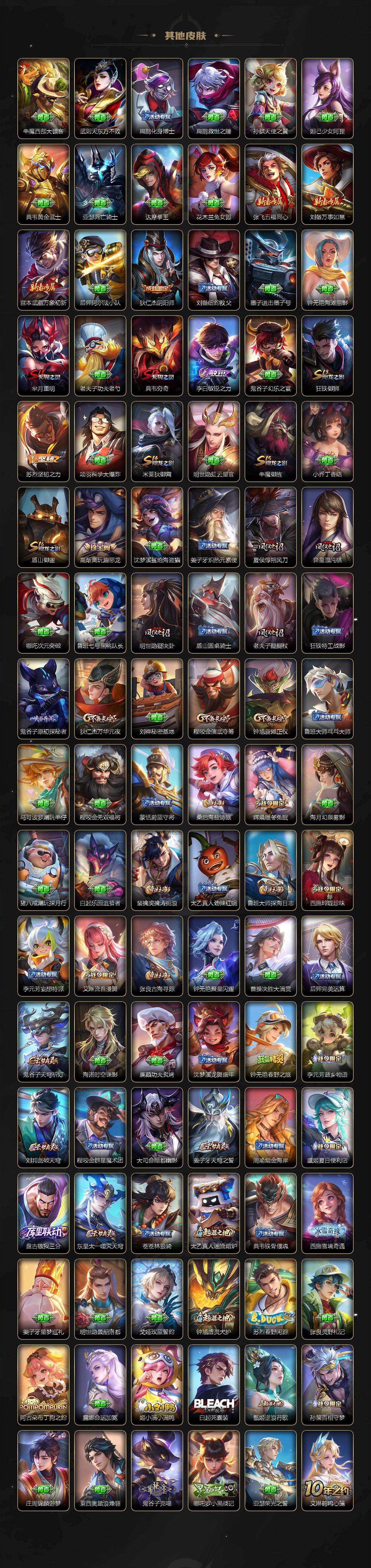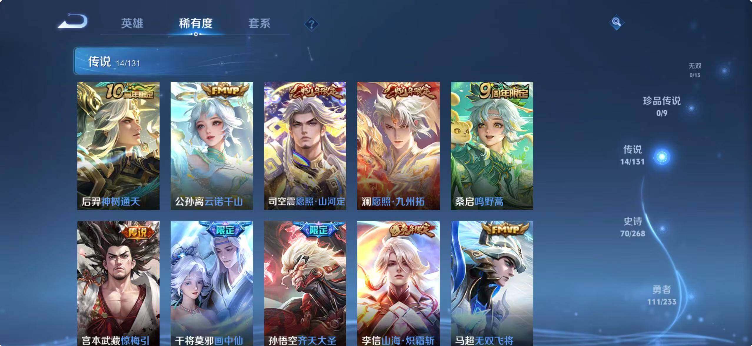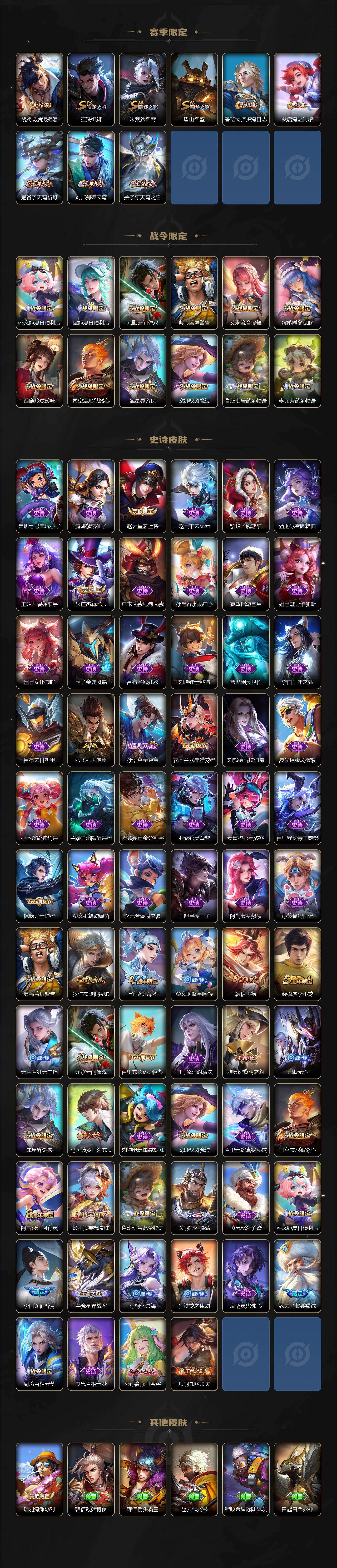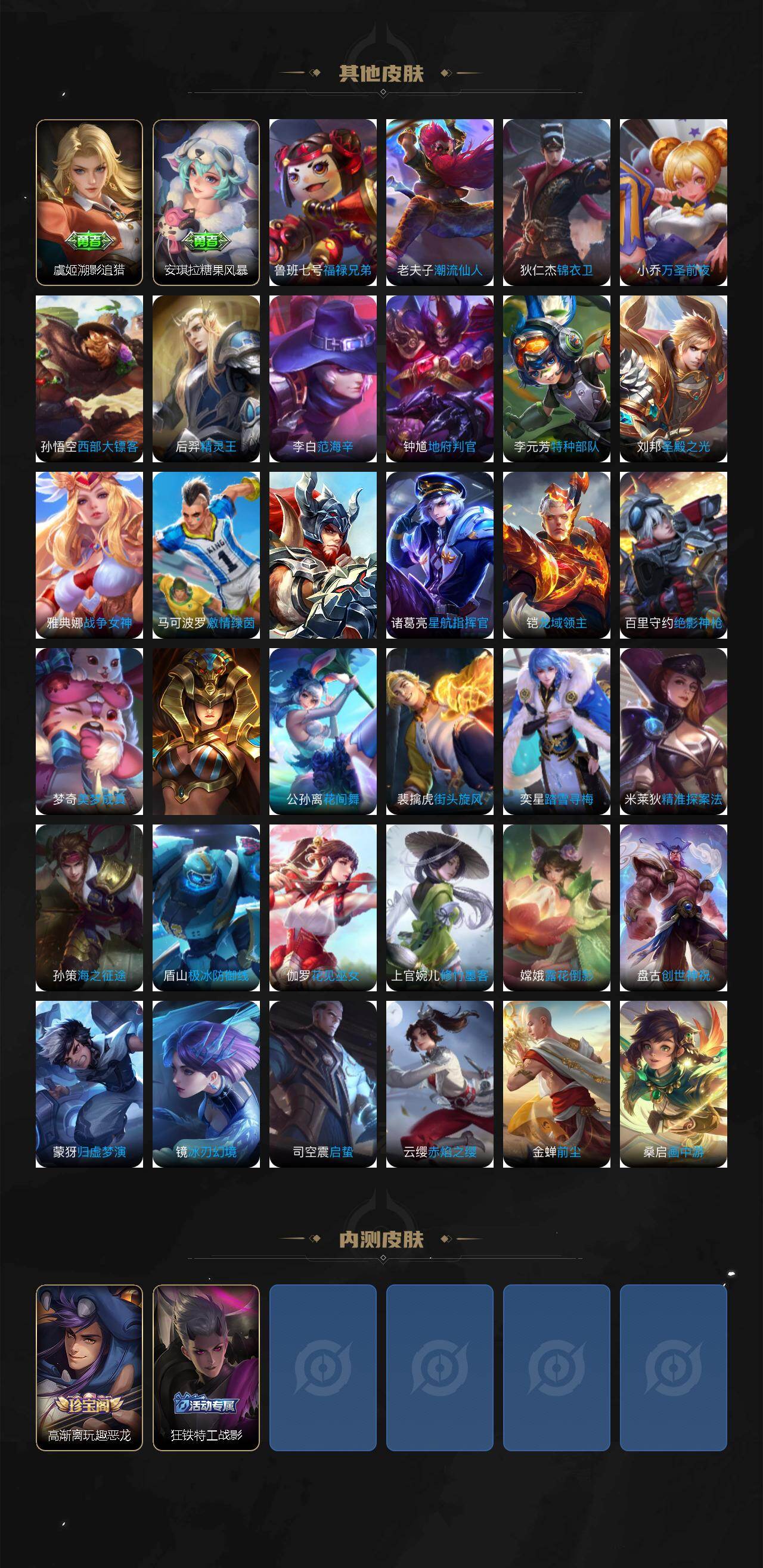 【传说皮肤】:后羿神树通天,公孙离云诺千山,司空震愿照山河定,澜愿照九州拓,桑启鸣野蒿,宫本武藏惊梅引,干将莫邪画中仙,孙悟空齐天大圣,李信山海炽霜斩,马超无双飞将,镜炽阳神光,曜云鹰飞将