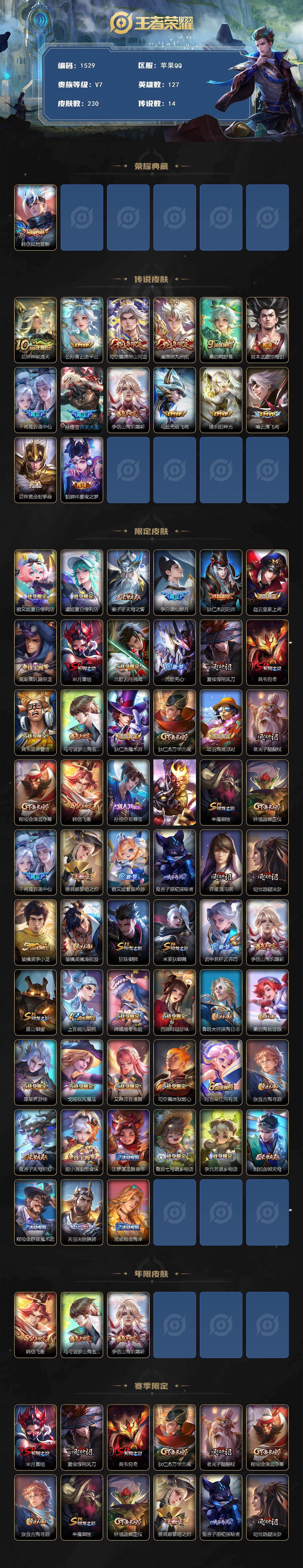 【韩信典藏 230皮14传说 至尊宝】苹果Q-V7-至尊星耀V段位-127英雄