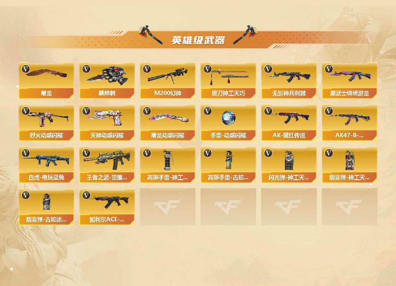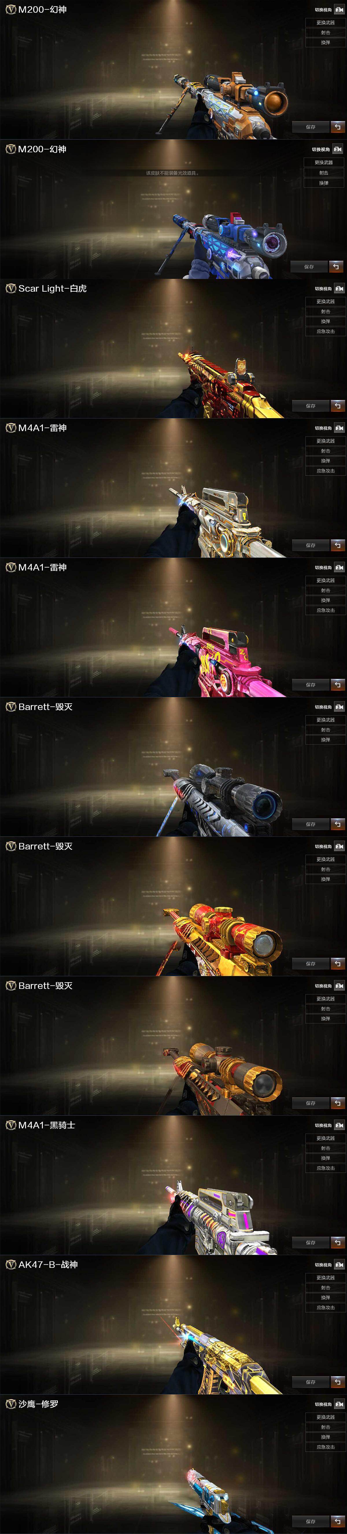 【热门武器】:QBZ03-金色蔷薇,M200-幻神,金色蔷薇-古蛇迷踪,修罗-古蛇迷踪,白虎-电玩蓝兔,QBZ03-街机,Cat-刀锋,M4A1-黑骑士,汤姆逊-烈龙*6,斯泰尔-蝴蝶,雷神-小红,黄金猫猫手套-白鲨