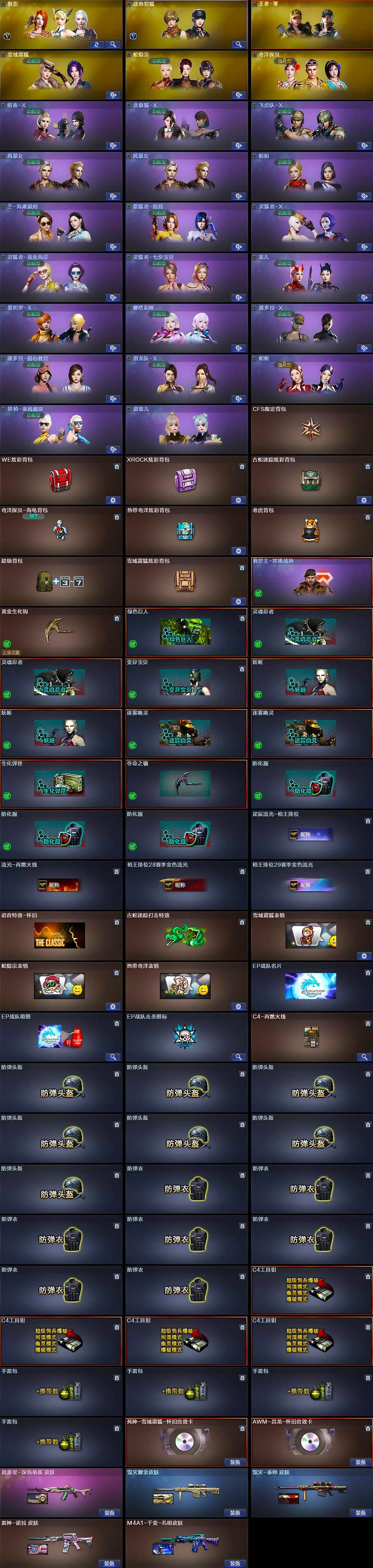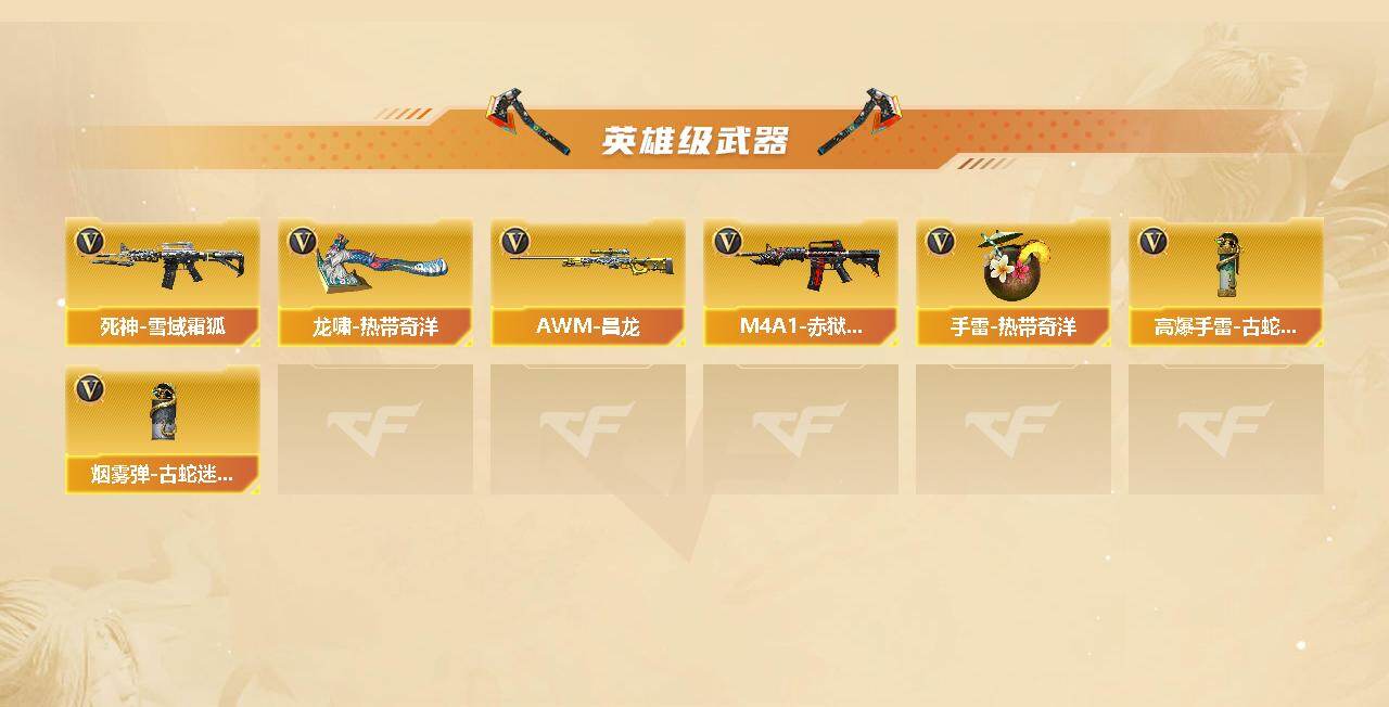 【热门武器】:QBZ03-金色蔷薇,Scar Light-白虎,金色蔷薇-古蛇迷踪,修罗-古蛇迷踪,死亡之眼,Kar98K-星神,汤姆逊-烈龙*6,加特林-炼狱*3,沙鹰-修罗*2