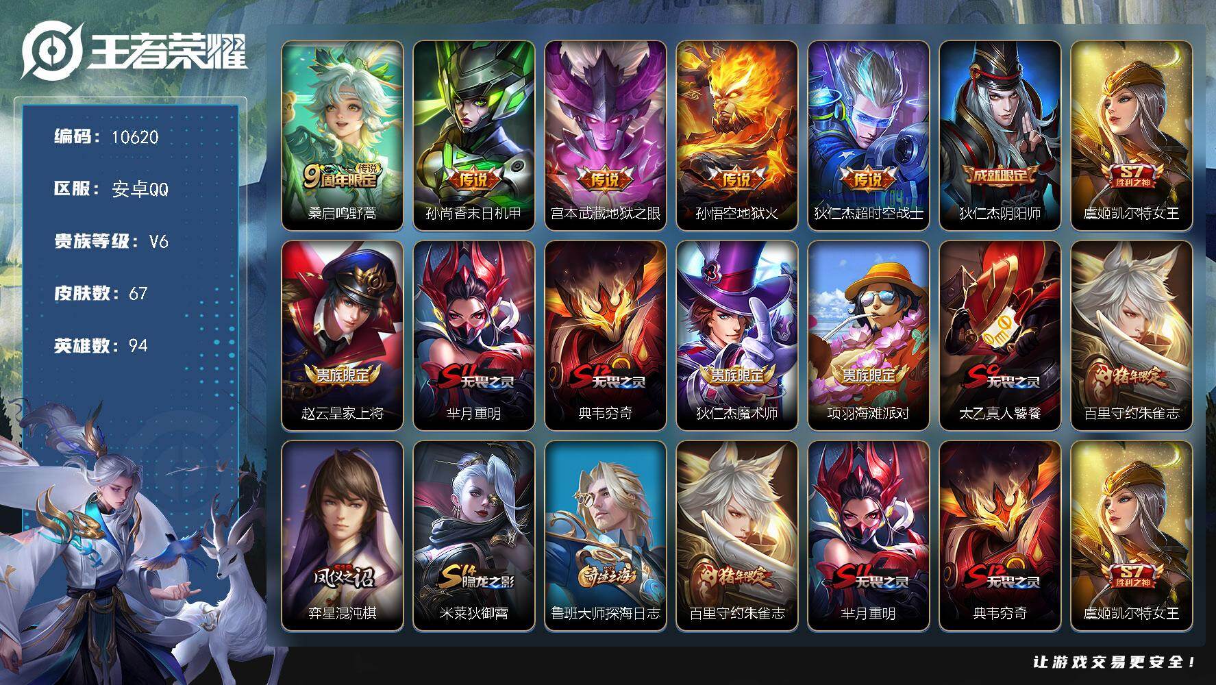 /W9386 可立即换绑无需挂单养号 铭文满级 传说5 夺宝71 安卓Q-V7-最强王者段位-94英雄-67皮肤-0典藏-0珍品无双-0无双-0珍品传说-5传说-11史诗