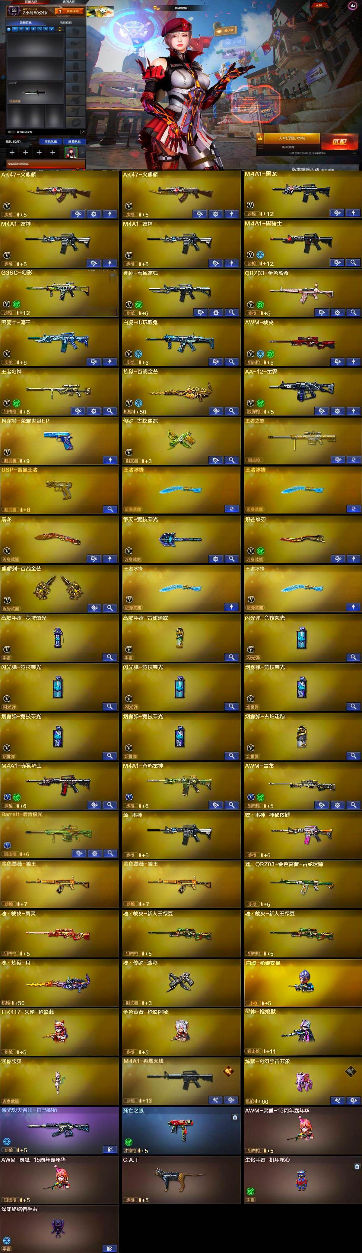 【热门武器】:G36C-幻影,QBZ03-金色蔷薇,修罗-古蛇迷踪,死亡之眼,白虎-电玩蓝兔,C.A.T,M4A1-黑骑士,白虎-枪娘安妮,炽芒蝶刃