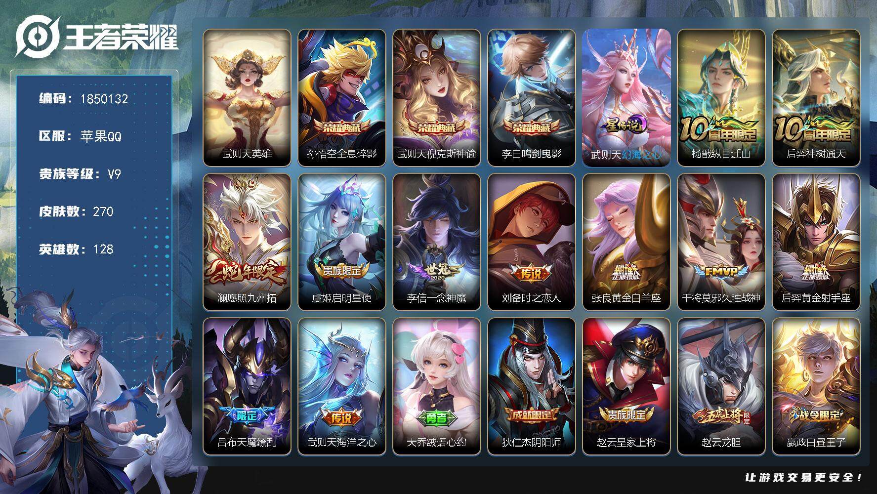 W13069,,可立即换绑无需挂单养号,,铭文满级,,典藏3,,传说11,,星传说1,,按键8,,,夺宝251,,苹果Q-V9-最强王者段位-128英雄-270皮肤-3典藏皮肤-1典藏英雄-11传说-77史诗