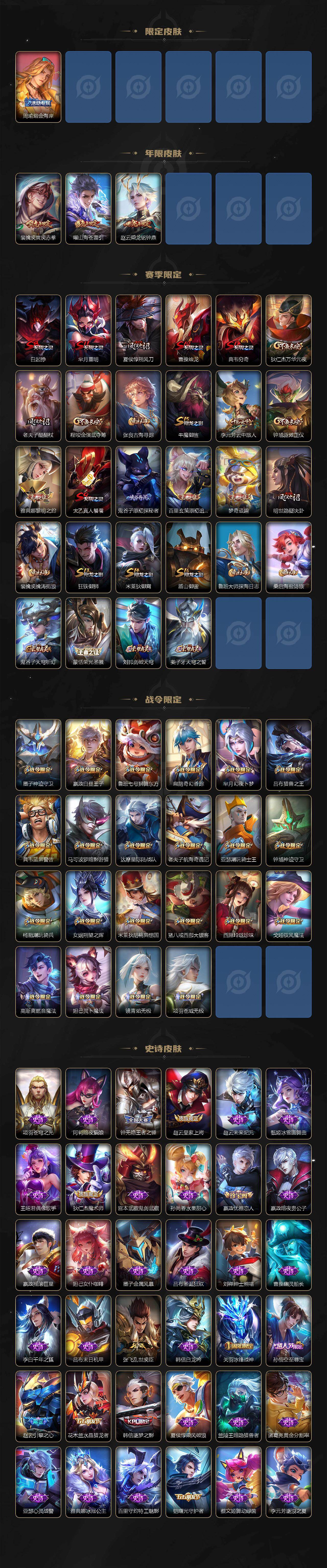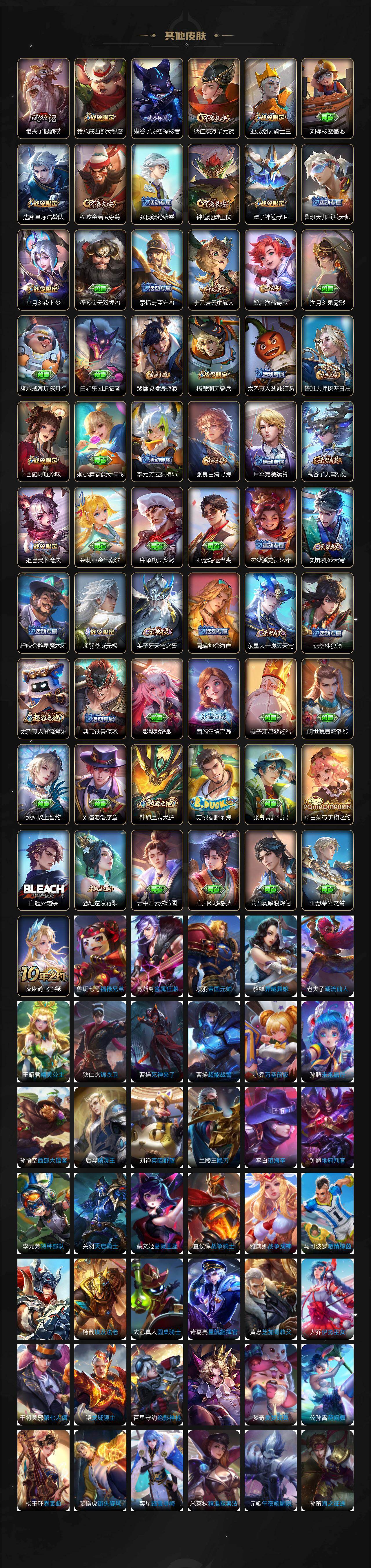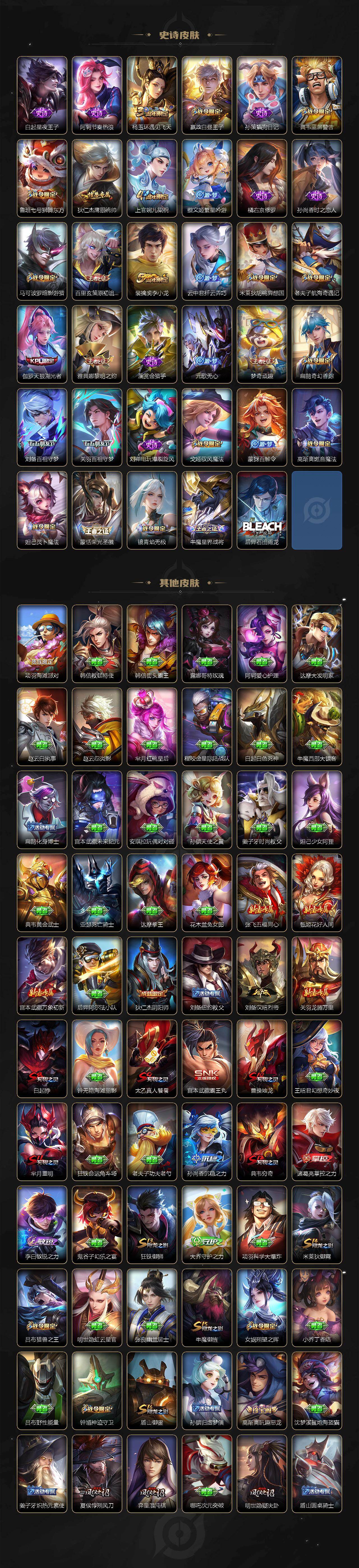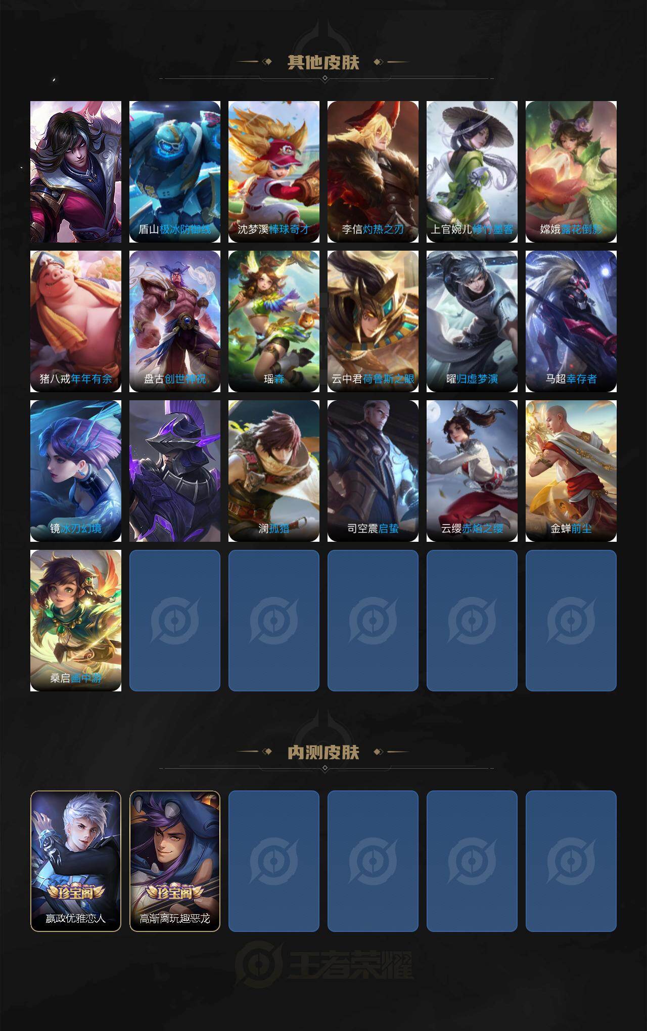 【传说皮肤】:云缨幻光神枪,桑启鸣野蒿,赵云乘龙铭钟鼎,曜山海苍雷引,吕布怒海麟威,裴擒虎寅虎赤拳,赵云淬星耀世,镜炽阳神光,虞姬启明星使,刘备时之恋人,张良黄金白羊座,花木兰冠军飞将,后羿黄金射手座,宫本武藏地狱之眼,孙悟空地狱火