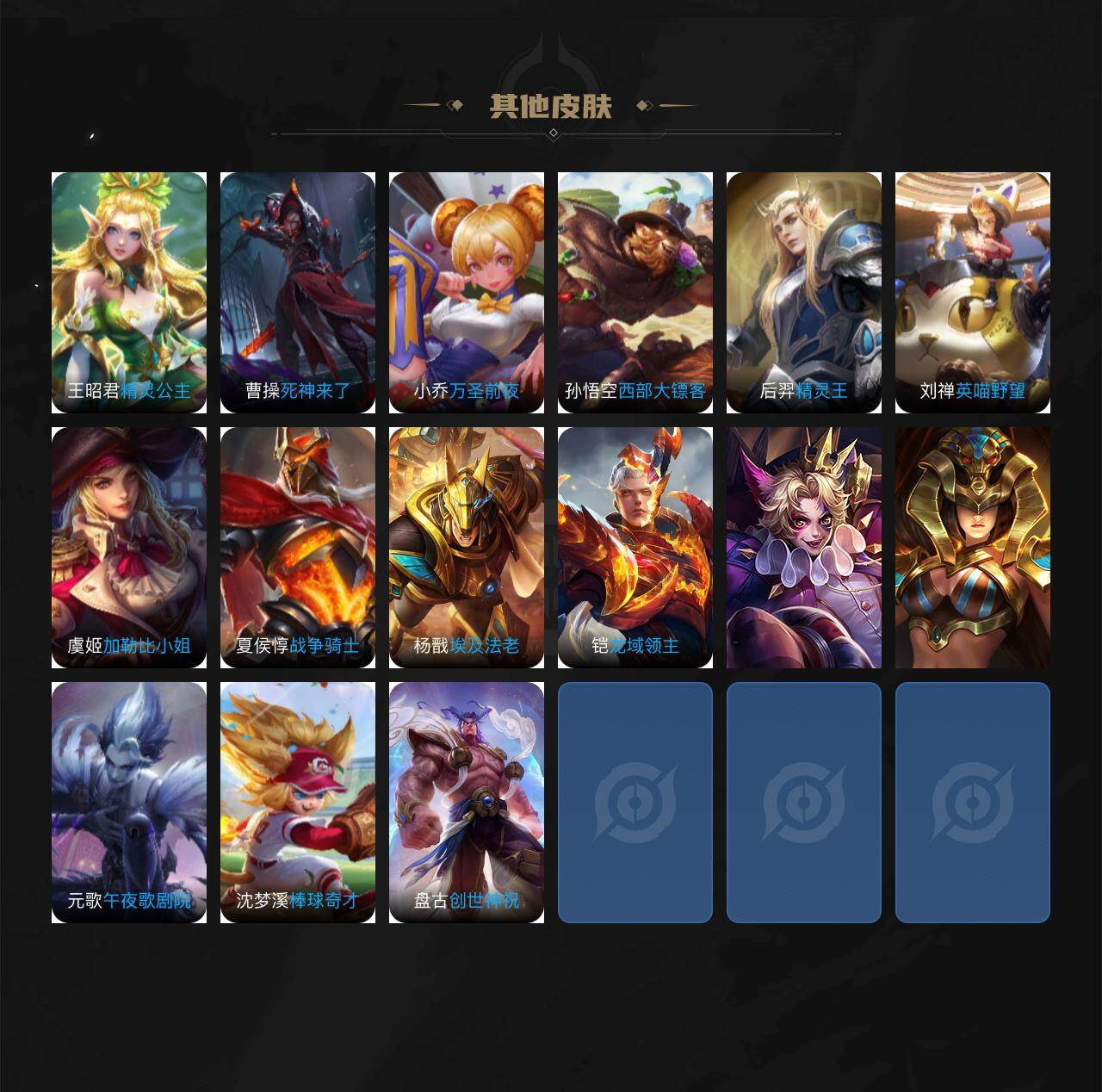 【限定皮肤】:狄仁杰阴阳师,赵云皇家上将,芈月重明,吕布猎兽之王,典韦穷奇,狄仁杰魔术师,项羽海滩派对,老夫子醍醐杖,露娜一生所爱,孙悟空大圣娶亲,鬼谷子原初探秘者,铠青龙志,百里守约朱雀志,明世隐疑决卦,狂铁御狮,米莱狄御霄
