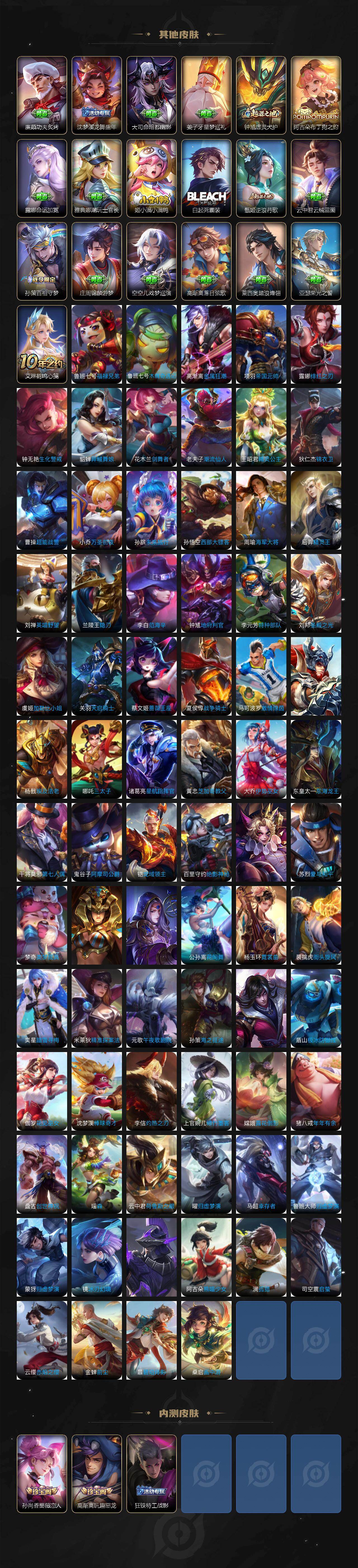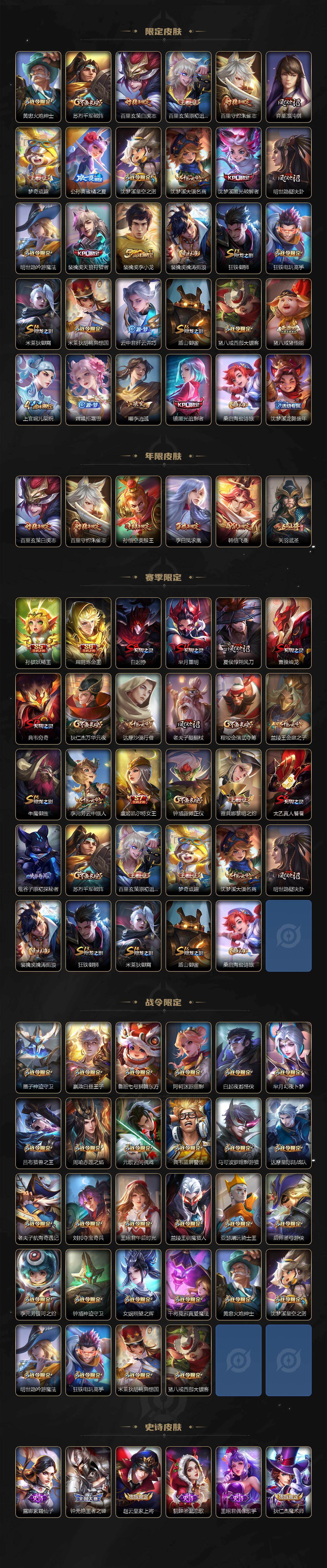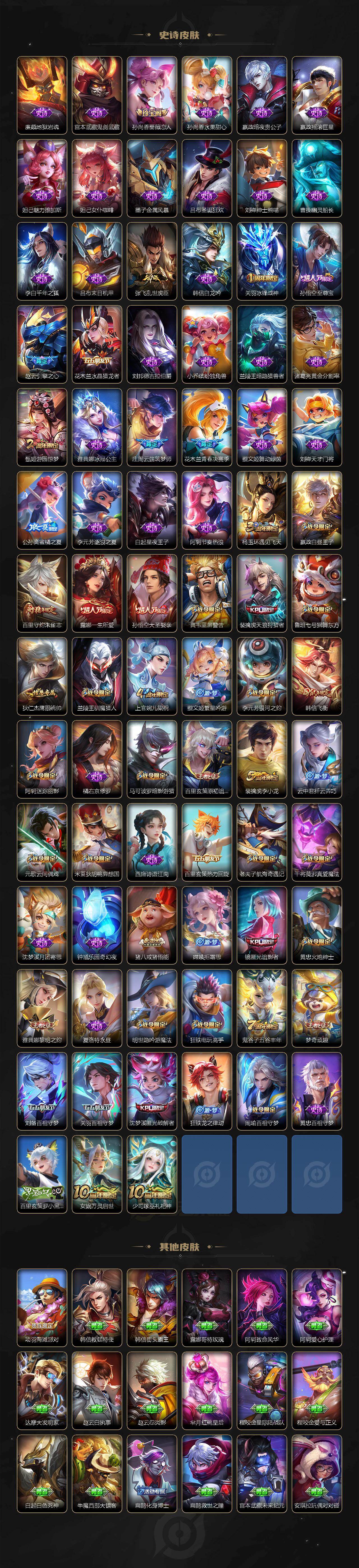 【传说皮肤】:后羿神树通天,张飞百相守梦,项羽无限倾心,后羿无尽星芒,马超无双飞将,孙策末日机甲,曜李逍遥 ,铠绛天战甲,虞姬启明星使,关羽武圣,张良黄金白羊座,干将莫邪久胜战神,达摩黄金狮子座