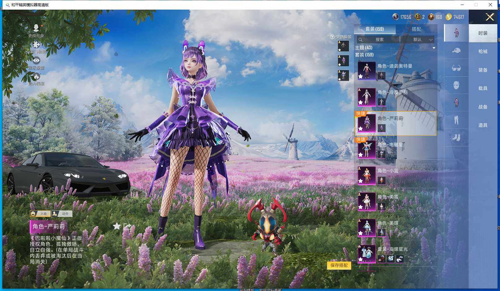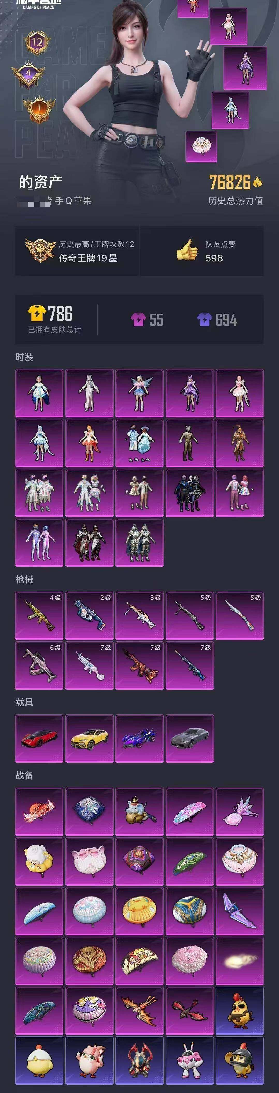时装数: 159 载具数: 4 枪械数: 199 战备数: 141 热门装扮: 梦幻火箭(新101),宝贝奶油派,天使彩虹糖,万圣娃娃,山涧鹿灵,赛罗闪耀型,彩虹鹿灵,暗夜玫瑰,沙场疾风,齐天大圣,洛天依,银龙傲海,海螺星光,暗夜魅影,严莉莉,美雪,美琪,小蓝,电磁星,冷漠罗丽 载具: 海龙奔腾,兰博基尼Estoque(银翼灰),兰博基尼URUS(明艳黄),帕加尼imola(光影红) 稀有枪皮: