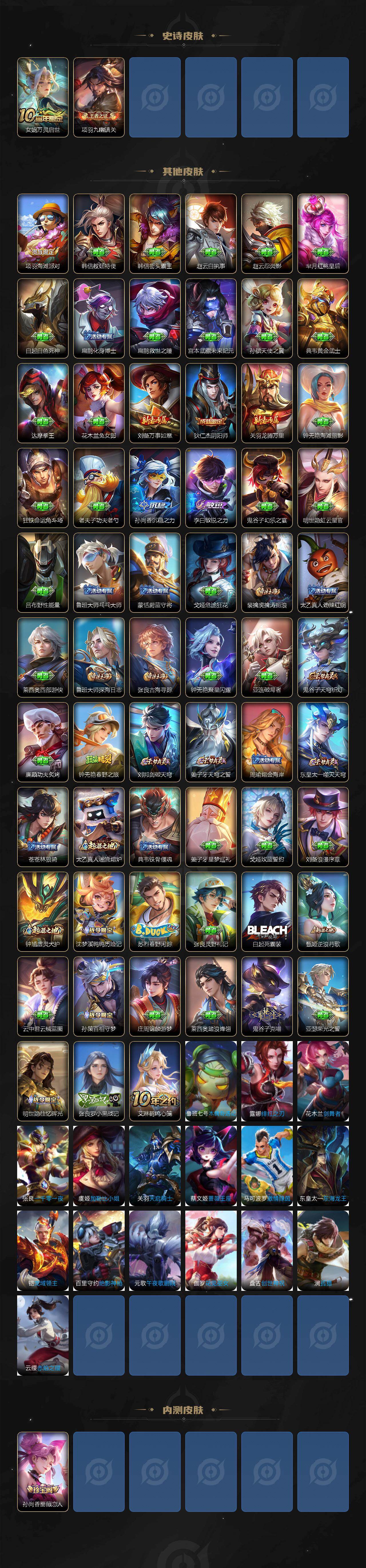 【传说皮肤】:公孙离云诺千山,虞姬愿照岁时盈,桑启鸣野蒿,花木兰燃星之曲,李白诗剑行,李信一念神魔,后羿黄金射手座,孙尚香末日机甲,宫本武藏地狱之眼