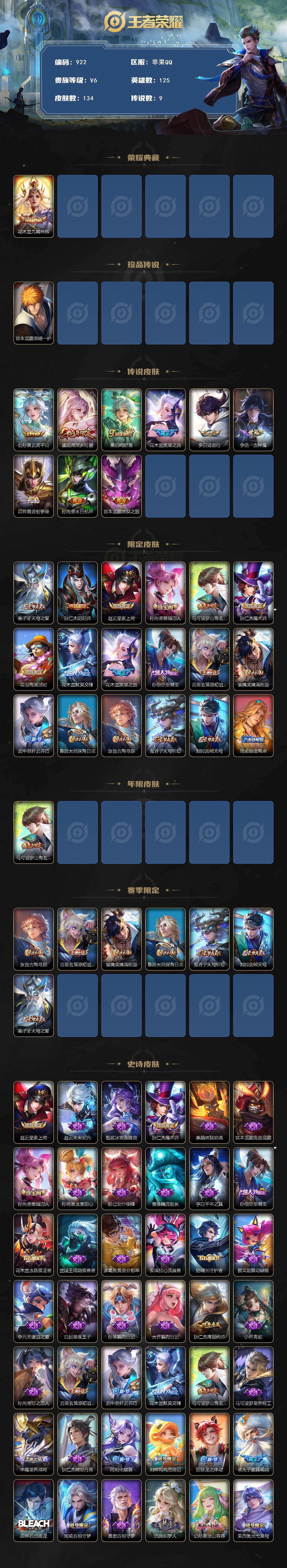 2048700 安卓区也有号有一个地狱之眼 苹果Q-V7-永恒钻石II段位-125英雄-134皮肤-1典藏皮肤-1珍品传说-9传说-44史诗