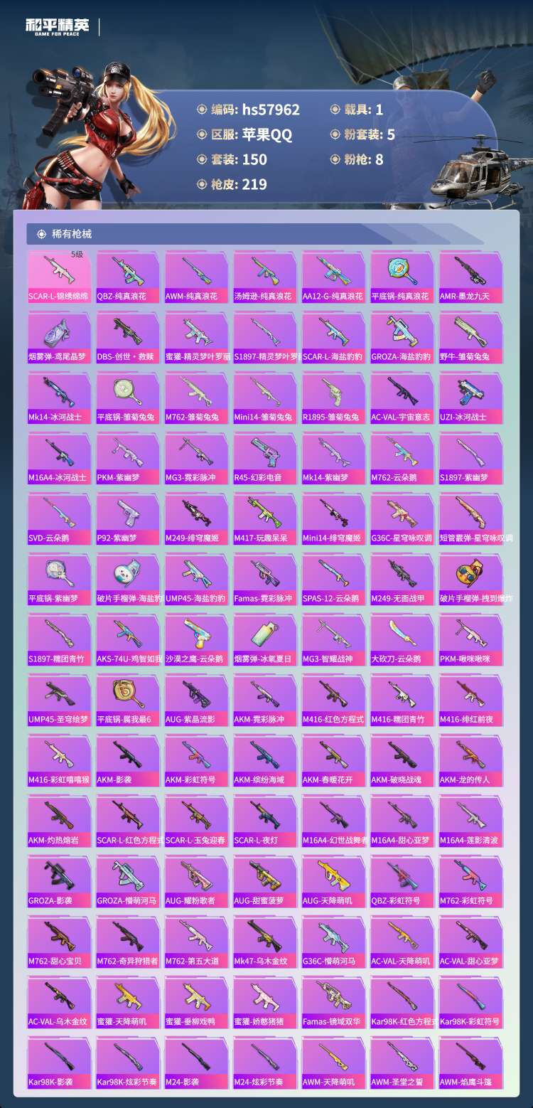 hs57962 苹果手Q-17王牌印记-5粉装-8特效枪-1载具-65366热力值-150套装-21