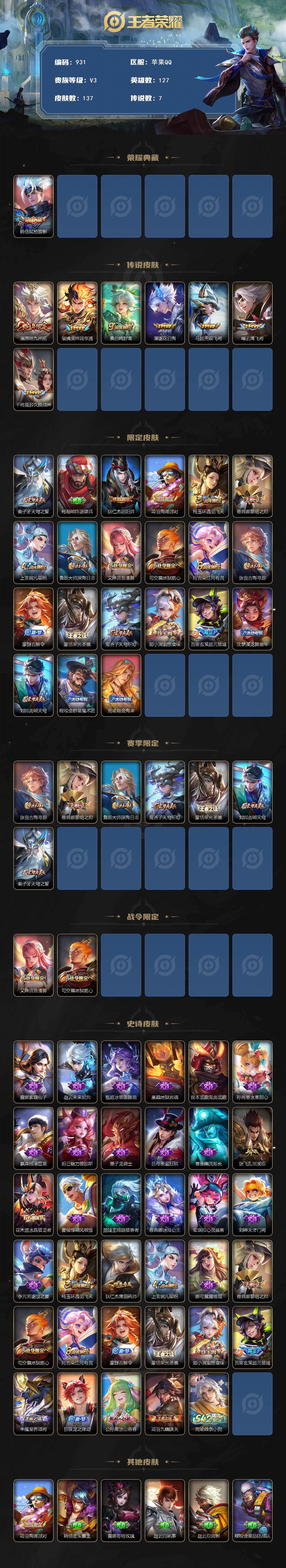 2048857 金标雅典娜 梦奇 苹果Q-V4-至尊星耀III段位-127英雄-137皮肤-1典藏皮肤-7传说-34史诗
