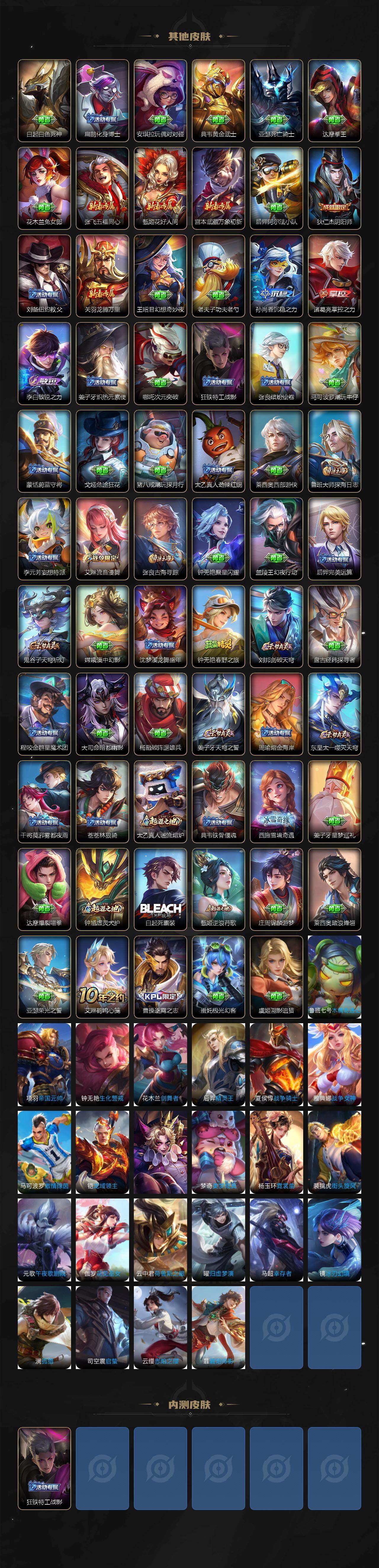 【限定皮肤】:姜子牙天穹之誓,杨戬破阵退雄兵,狄仁杰阴阳师,项羽海滩派对,杨玉环遇见飞天,雅典娜黎明之约