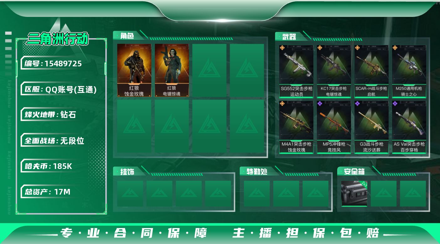 总资产(M):17M/哈夫币(K):185K/哈夫币(K):185K/传说枪皮数:5/全面战场等级: