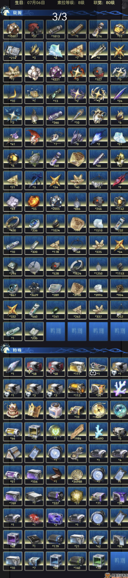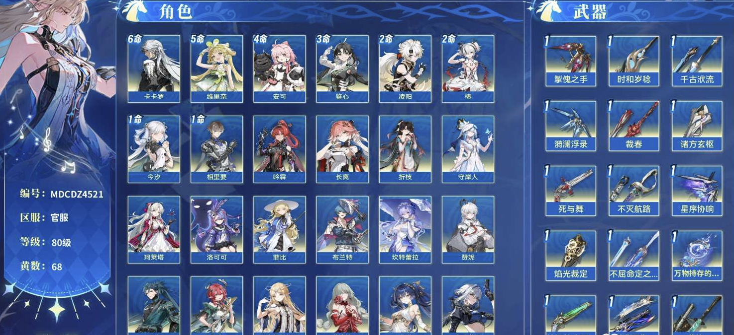 号上有限定抽数100抽常驻抽数32抽,角色池垫了45抽。双倍磕了5轮,还有20天左右月卡。角色基本全毕业,矩阵随便打。常驻活动基本没肝完。本来想磕点全图鉴的,突然不想玩了,找个有缘人出了吧