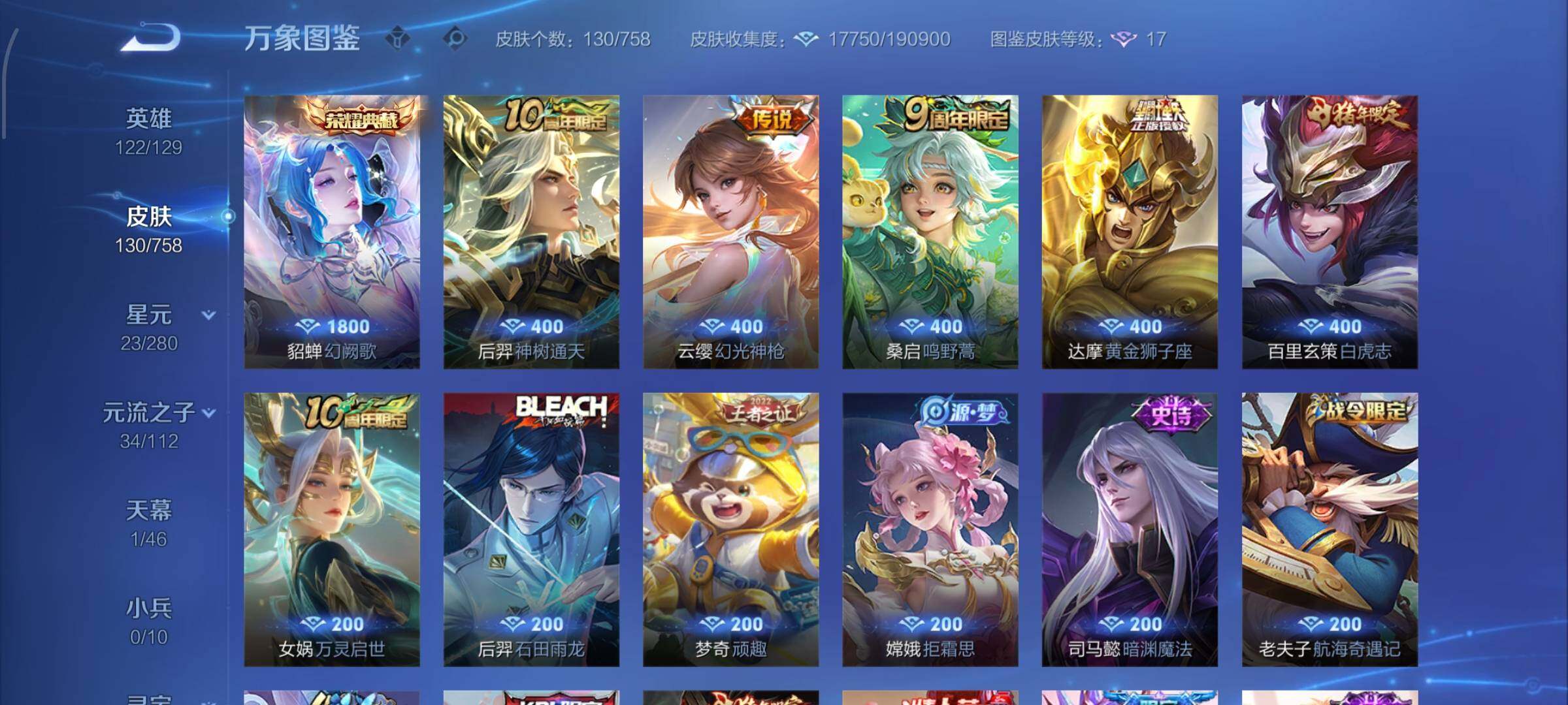 【传说皮肤】:后羿神树通天,云缨幻光神枪,桑启鸣野蒿,达摩黄金狮子座,百里玄策白虎志