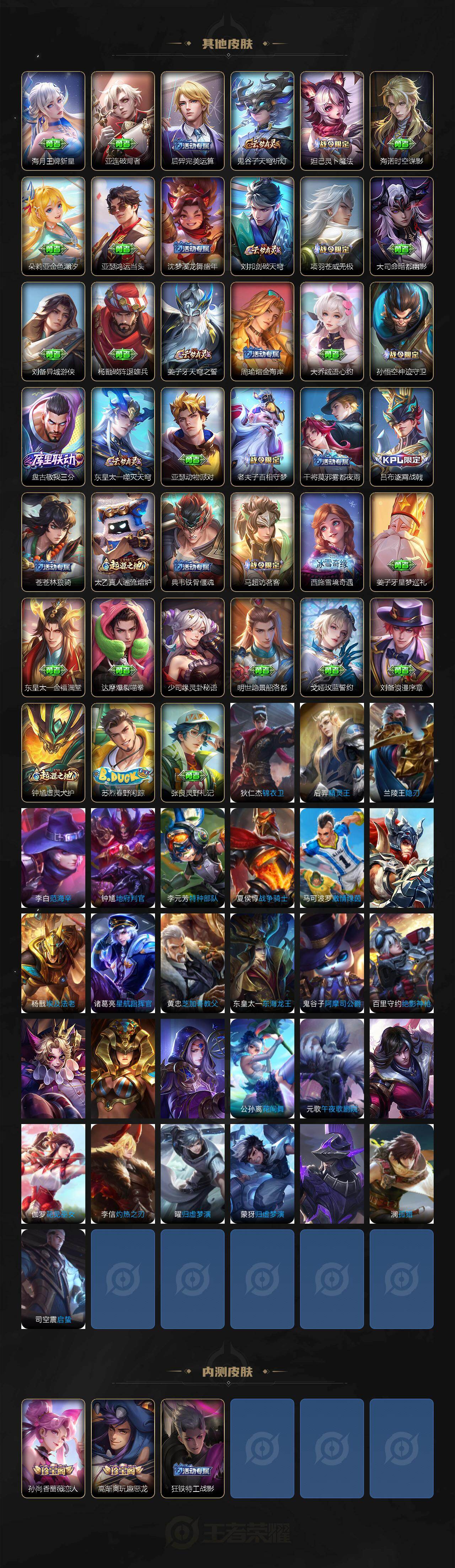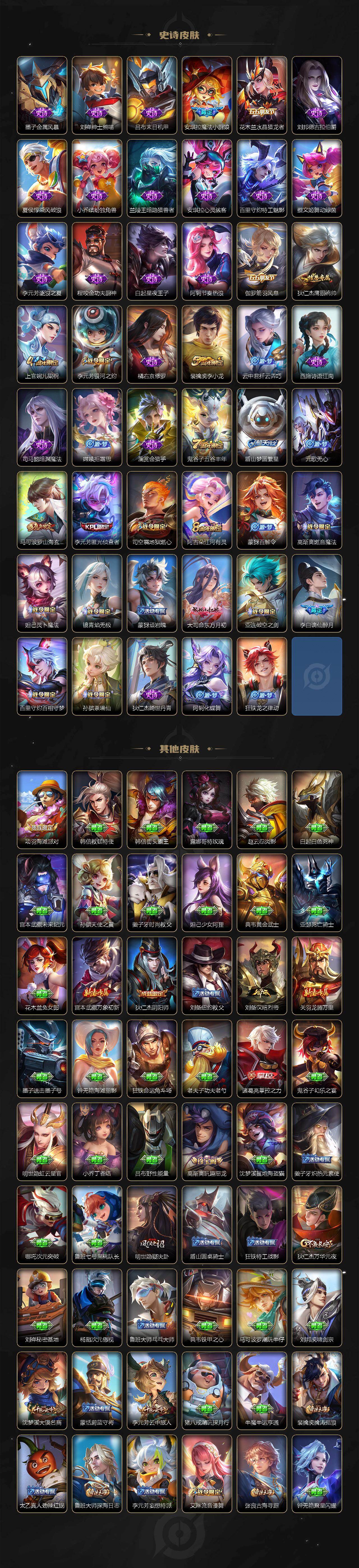 【传说皮肤】:妲己愿照众生和,澜愿照九州拓,桑启鸣野蒿,澜逐花归海,露娜霜月吟,李白诗剑行,后羿无尽星芒,狄仁杰超时空战士