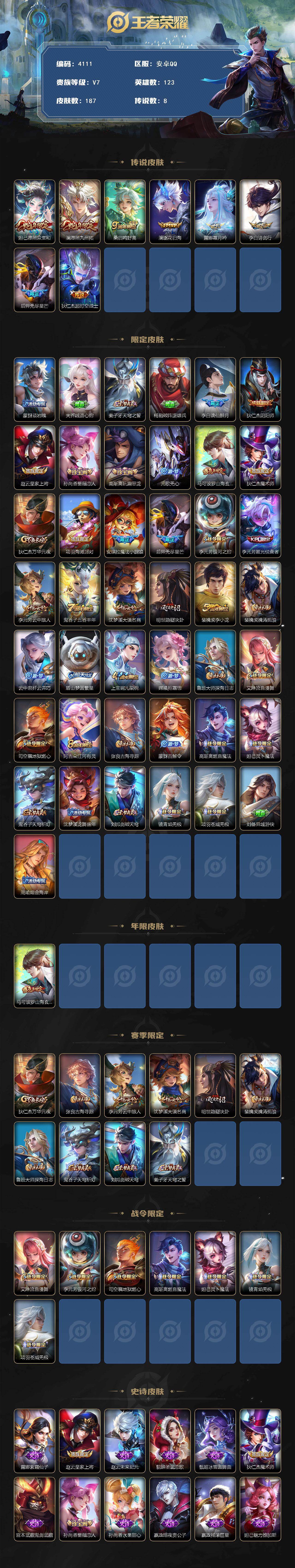 安卓Q-V7-尊贵铂金II段位-123英雄-187皮肤-8传说-58史诗