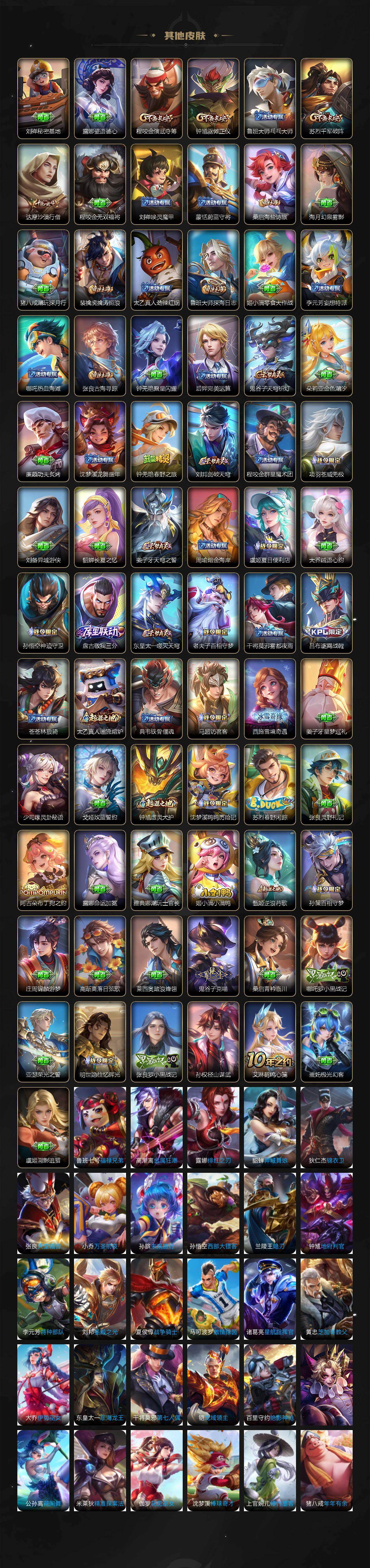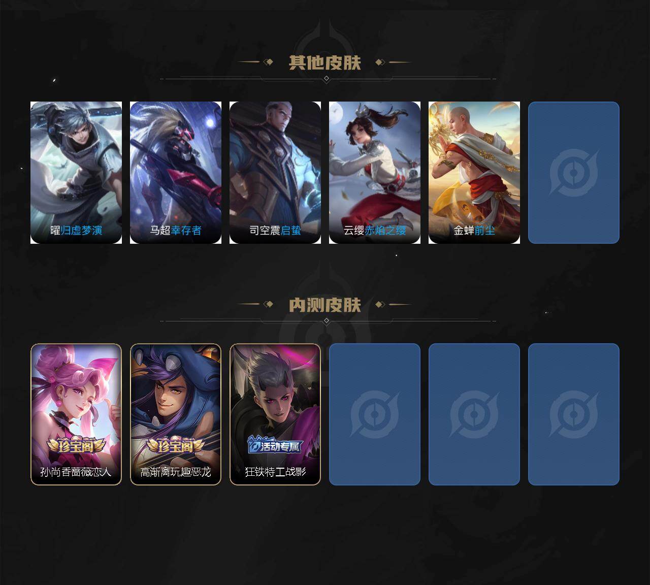 【传说皮肤】:桑启鸣野蒿,貂蝉曦玄引,吕布怒海麟威,赵云淬星耀世,王昭君乞巧织情,铠绛天战甲,虞姬启明星使,李信一念神魔,干将莫邪久胜战神