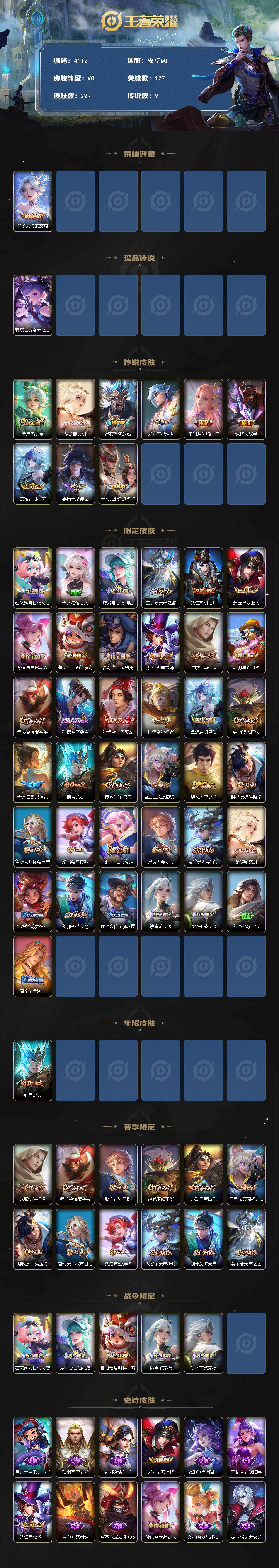 安卓Q-V8-永恒钻石I段位-127英雄-229皮肤-1典藏皮肤-1珍品传说-
