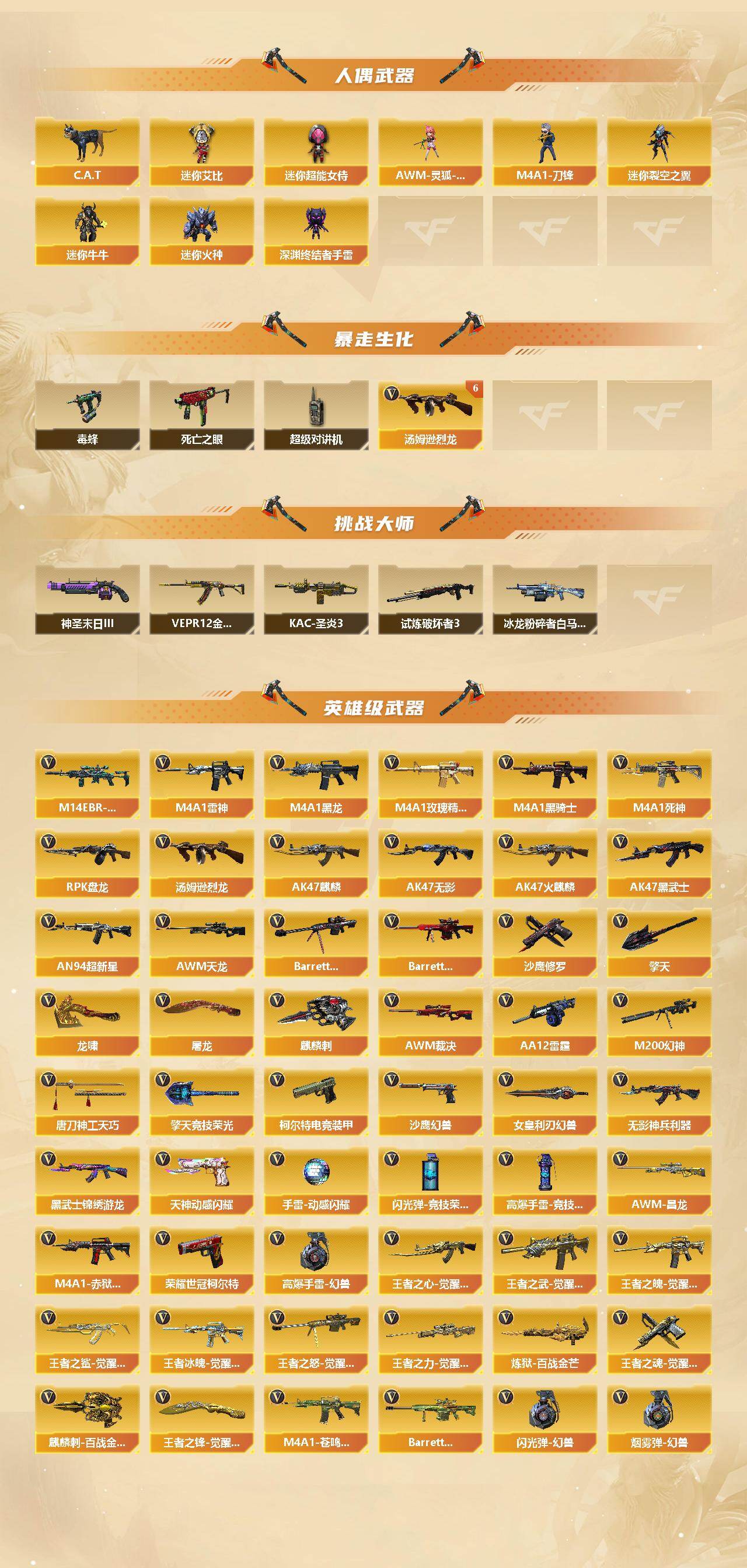 【热门武器】:传说幽瞳,M14EBR-玄武,M200-幻神*2,死亡之眼,荣耀世冠-柯尔特,C.A.T,毒蜂,M4A1-黑骑士,汤姆逊-烈龙*6,RPK-盘龙*3,沙鹰-修罗,金刚伞,高爆手雷-幻兽