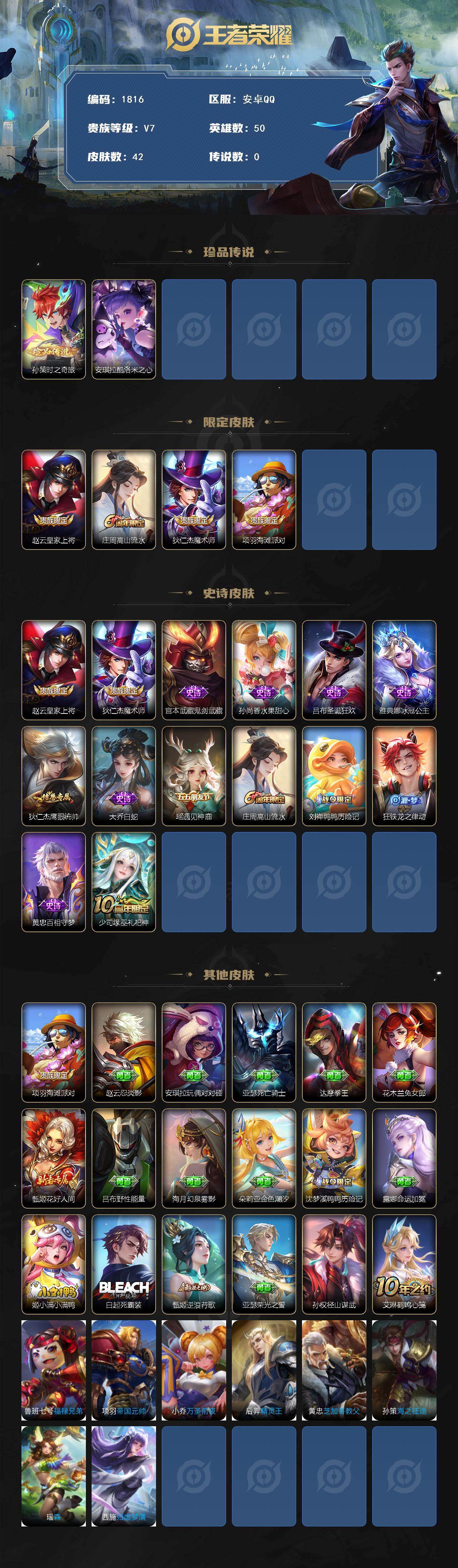 【年前清货·秒杀·2珍品传说V7】安卓Q-V7-永恒钻石III段位-50英雄-42皮肤-2珍品传说-14史诗