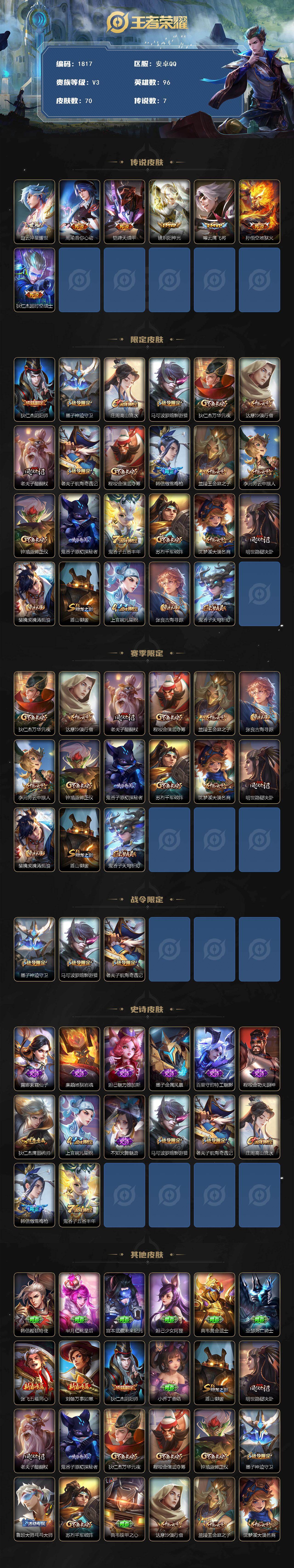 【年前清货·精品号手慢无 野王号】可换绑 性价比贵3 安卓Q-V3-永恒钻石I段位-96英雄-70皮肤-7传说-14史诗